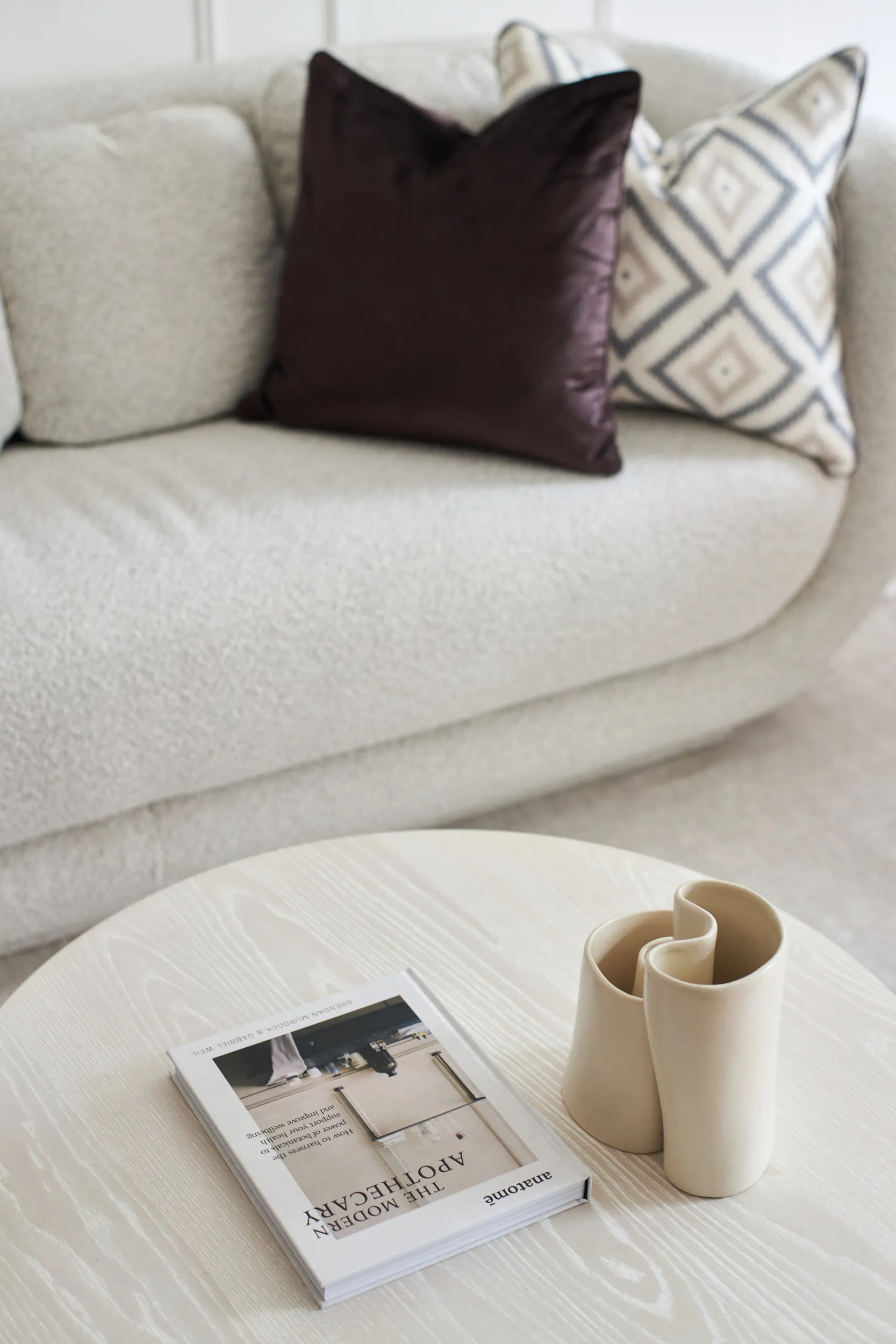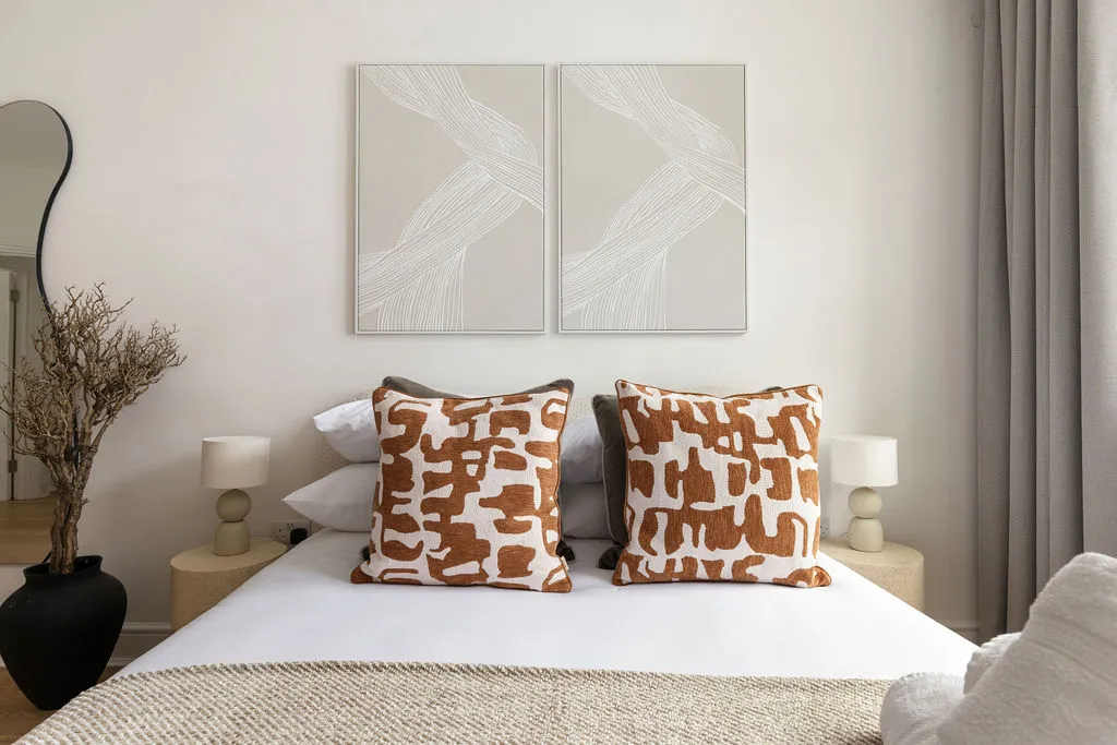 Natural linen, brushed cotton, and wood bring warmth, while subtle contrast through layering keeps the space interesting. These tones and materials create a calm atmosphere that still feels rich and comfortable.