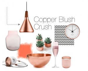 Then add in your copper accessories; think copper lighting, bowls, vases, cushions or candlesticks. The list is endless, just let your imagination lead you!