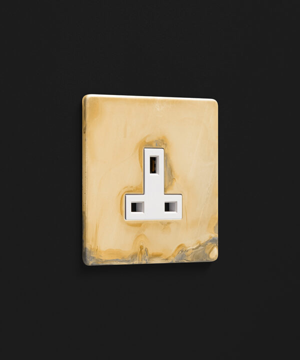 This designer range of hand-finished elemental gold light switches, sockets, dimmers, toggles and appliance switches is the perfect replacement for ubiquitous white plastic varieties. Each of our elemental gold items has unique swirling patterns that drift across the surface. You won’t find any two the same. Coordinate this opulent matt brass hardware to create a refined look that doesn’t look too ‘done’ Add texture to a minimal interior by embracing our elemental gold range. We love dove greys, navy and teals – colours that complement the smokey hues gorgeously.
