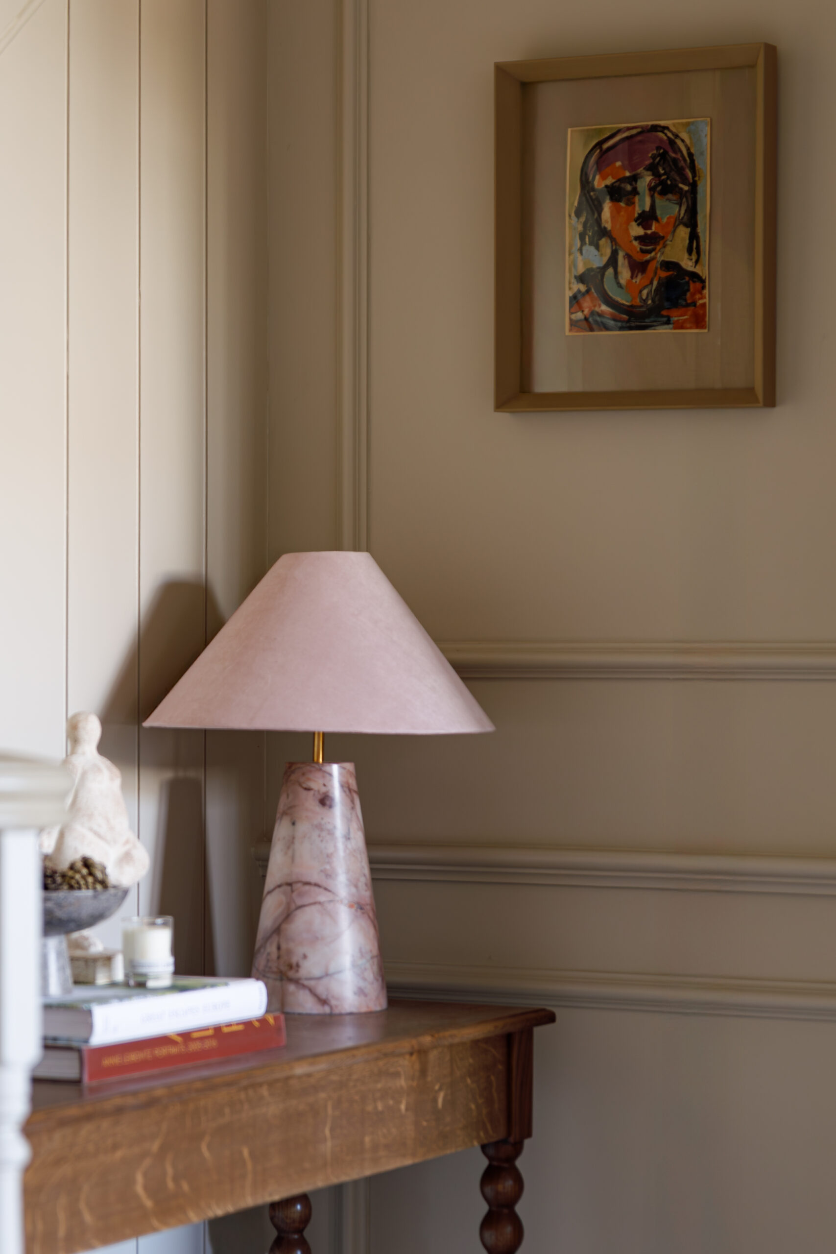 Layer marble with warm metals, linen textures and natural timber to create a relaxed, curated atmosphere. A marble lamp beside matching stone knobs or handles can help unify a room, tying together lighting and furniture details without feeling overly coordinated.