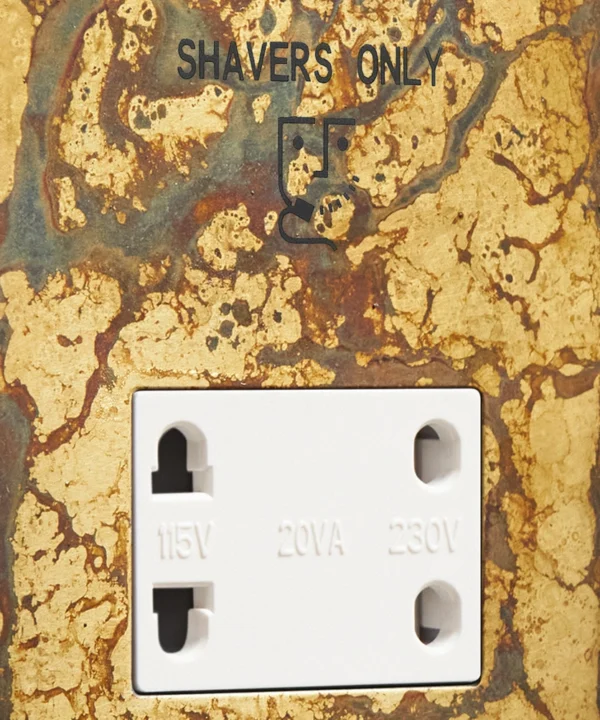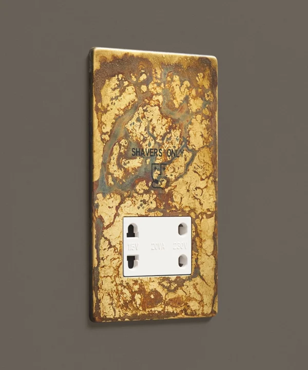 Tarnished copper and smoked gold shaver sockets bring a timeless, heritage feel to bathrooms. Designed to age beautifully with time, the unique pattern that flows across the socket plates is unique and charming, catching your eye every time with each interaction.