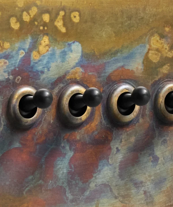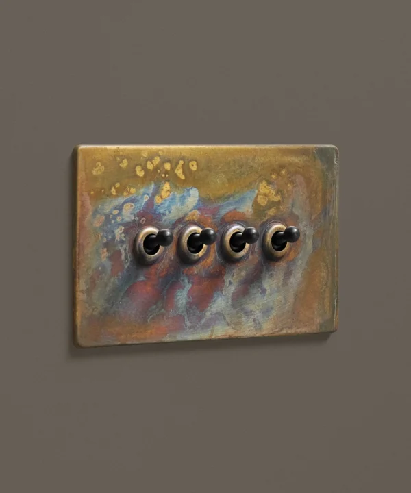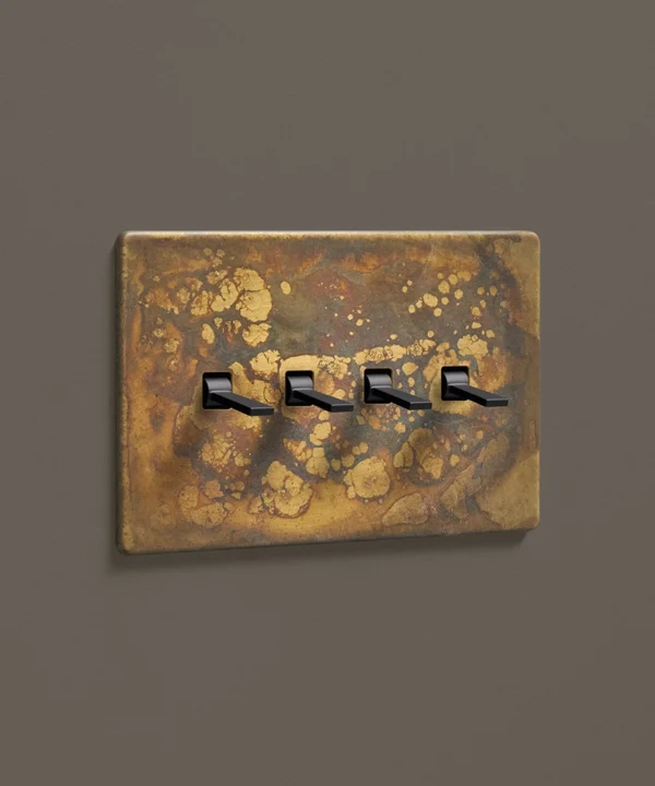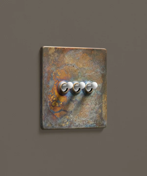- Tarnished copper: Rugged, undone and gloriously edgy. Our collection of tarnished copper electrical hardware is the epitome of modern vintage. It’s an intricate detail that’s out of the ordinary, making guests stop to double take for a closer look. This industrial detail can really tie your luxurious decor together – opt for golden toggles for a combination that really exudes decadence.