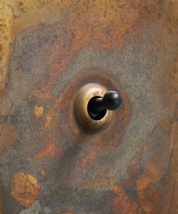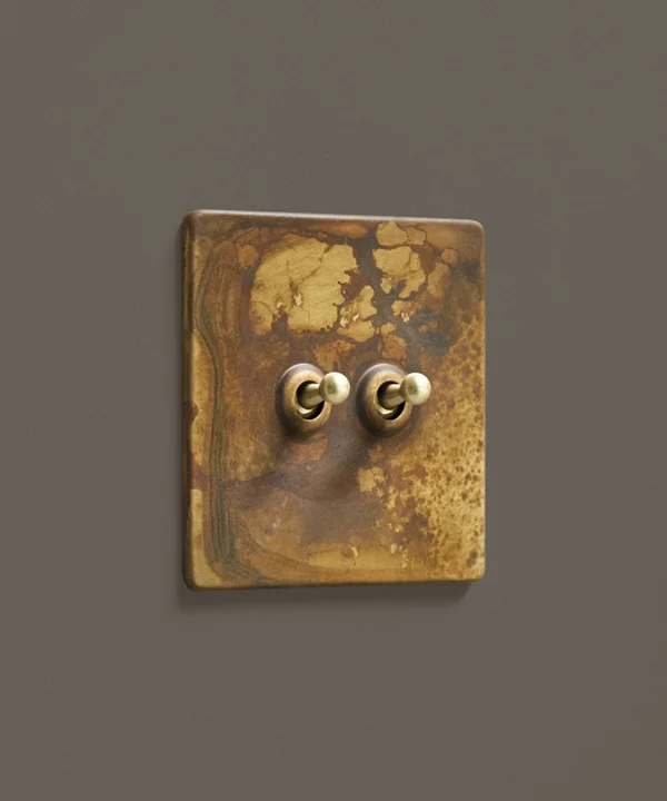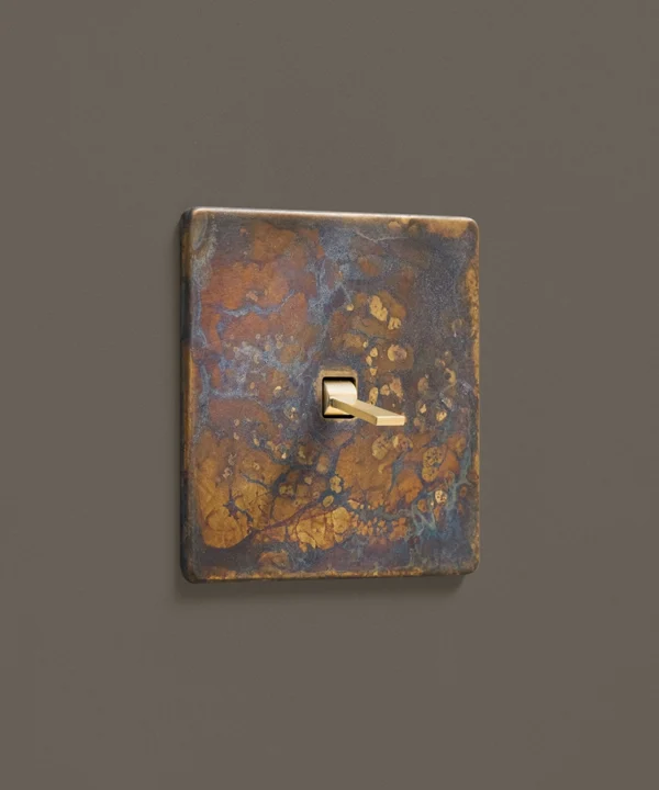 - Tarnished copper: Rugged, undone and gloriously edgy. Our collection of tarnished copper electrical hardware is the epitome of modern vintage. It’s an intricate detail that’s out of the ordinary, making guests stop to double take for a closer look. This industrial detail can really tie your luxurious decor together – opt for golden toggles for a combination that really exudes decadence.