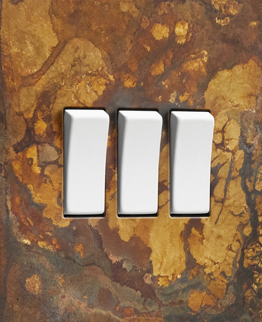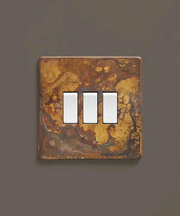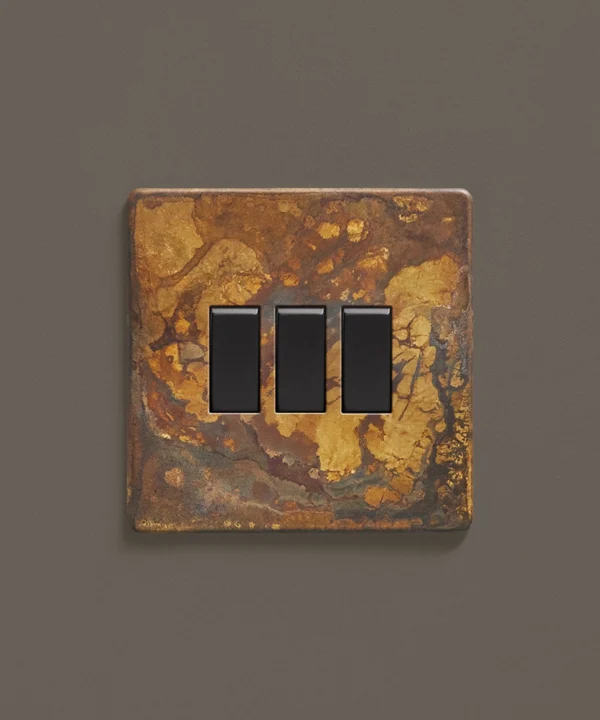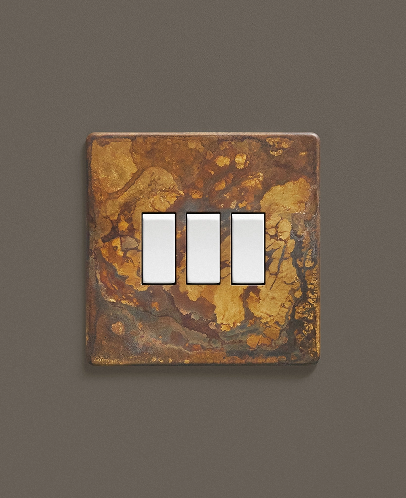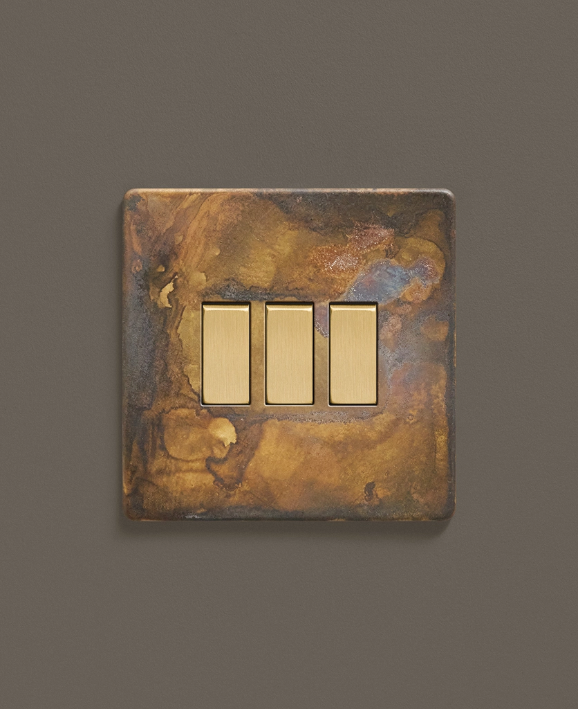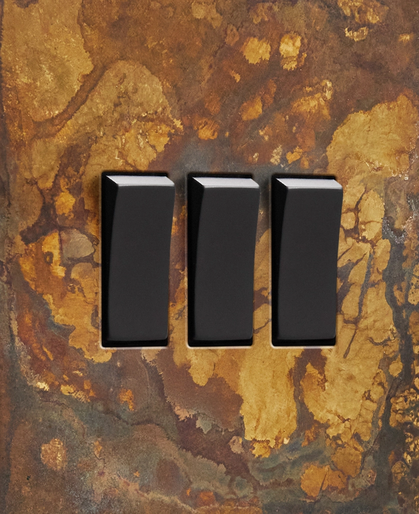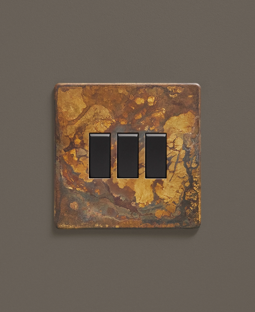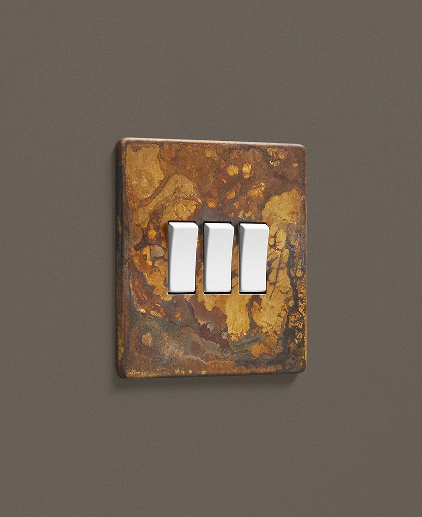 Elemental gold is THE finish if you’re looking to make a statement out of your everyday switches and sockets. Featuring a gorgeous matt brass plate with swirling hues of charcoal, grey and navy drifting across the surface, this switch definitely isn’t one to shy away.