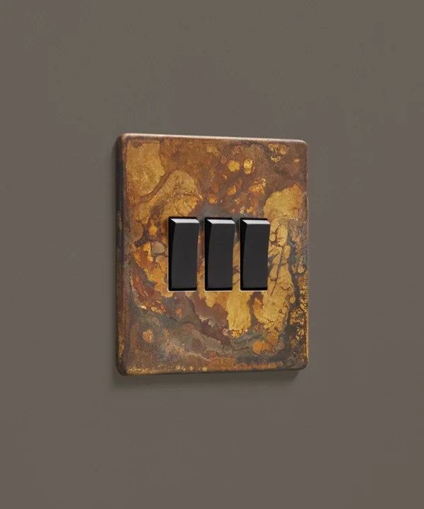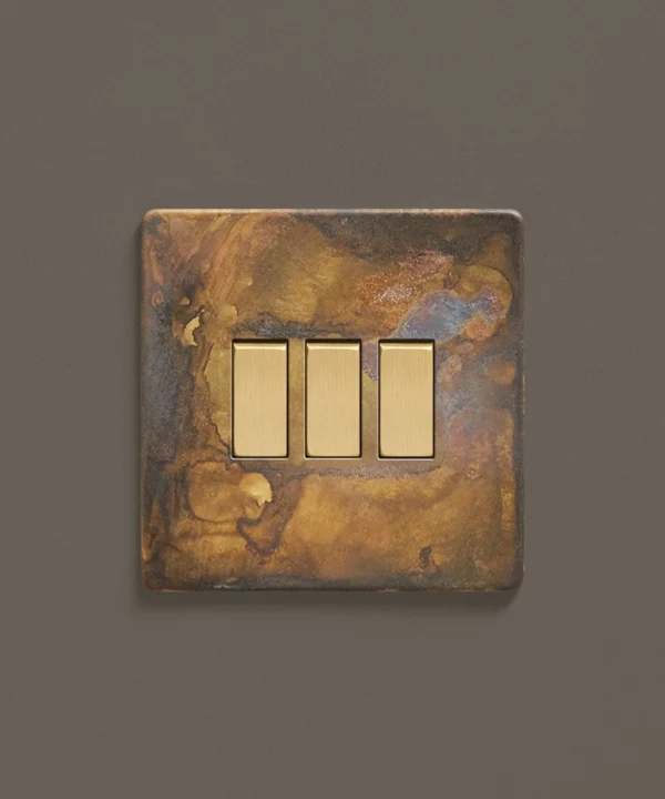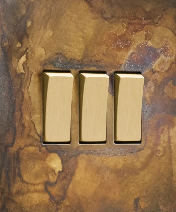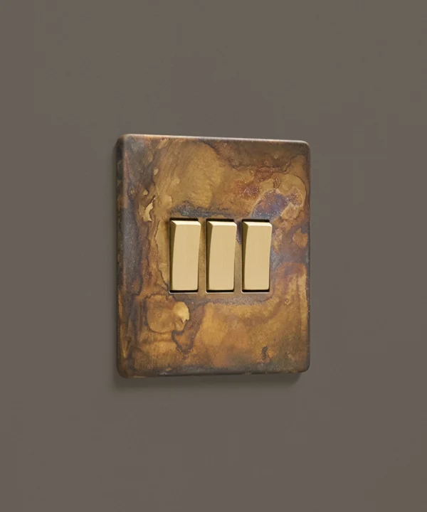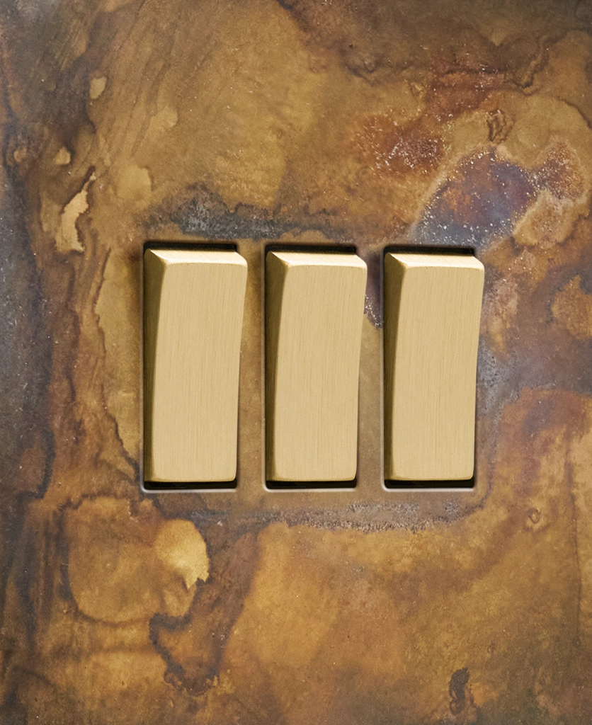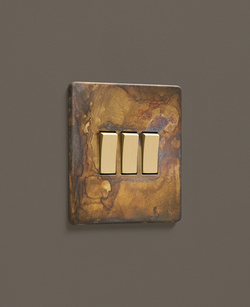- This finish is made to change and age with wear, making each switch unique, differing from batch to batch. We strongly advise ordering items for the same room together to ensure consistency. If fitted to freshly plastered walls, there is a chance the dampness will encourage the brass finish of this switch to corrode.