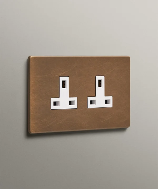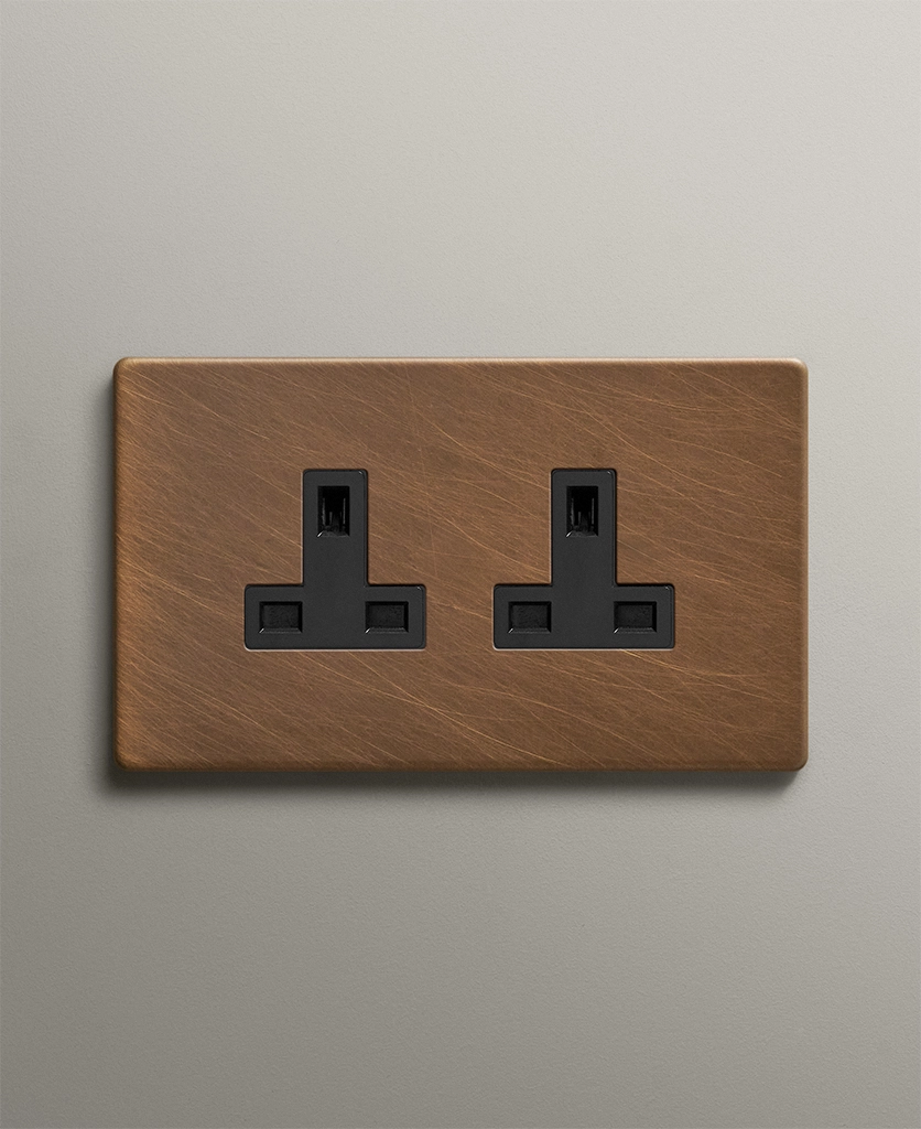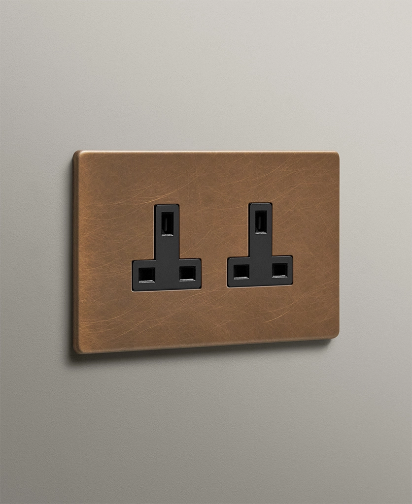 Each of our exclusive antique brass double unswitched sockets is a unique piece, hand-finished in the UK to our specifications, ensuring the highest quality and attention to detail.