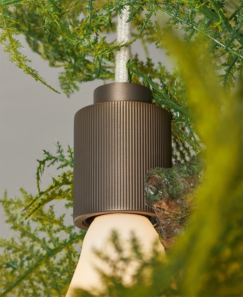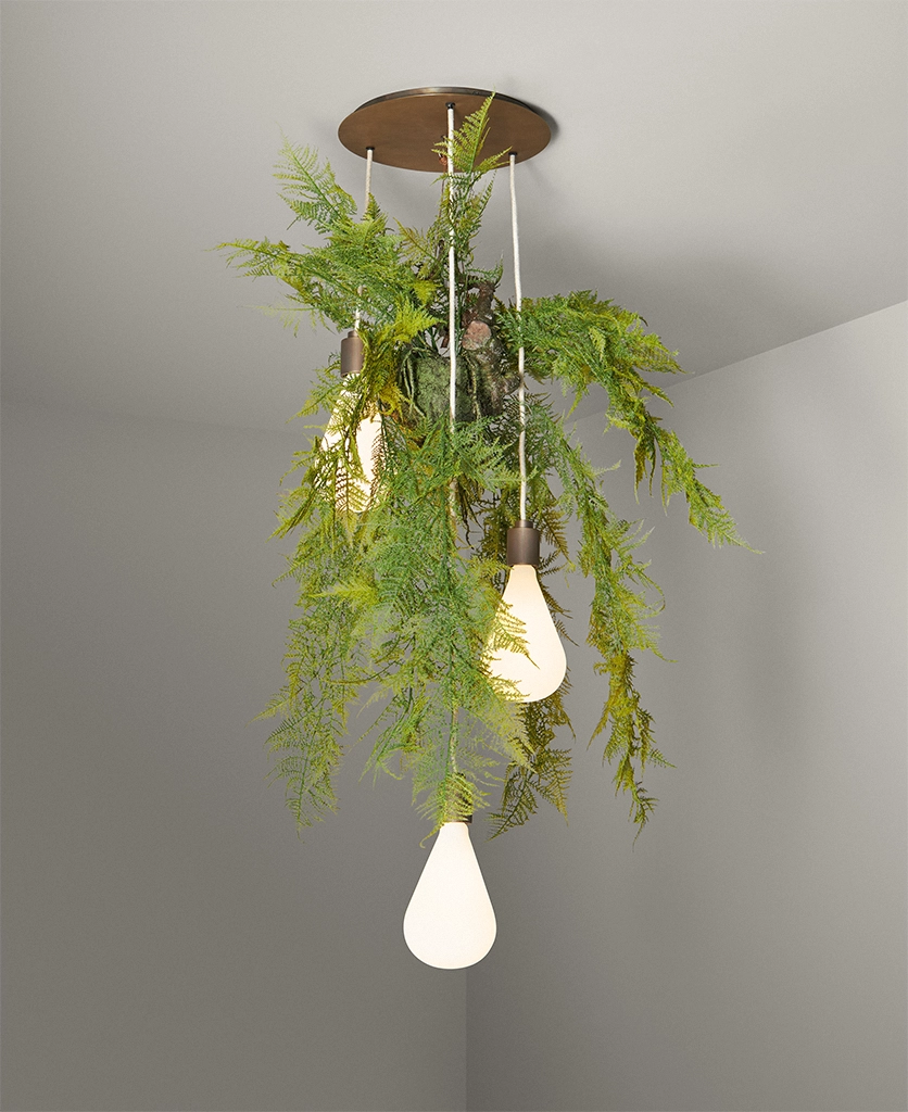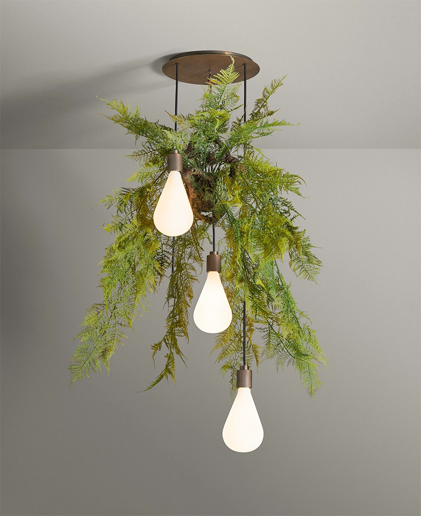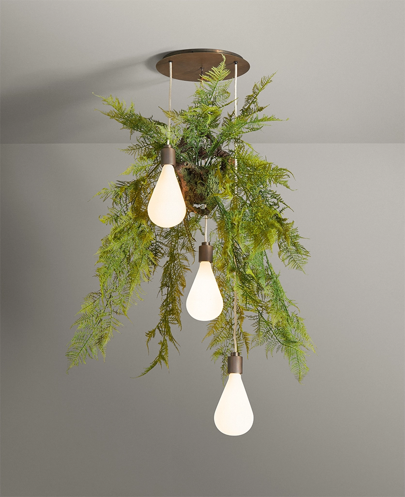Glancing upwards, the Antique Brass Fern Teardrop Cascade greets you with a glow that feels at once nostalgic and modern. Its opaque teardrop glass shades seem to float from the ceiling, their light diffused into a soft halo around the delicately aged brass fittings. Above, the fern detail rests gently against the rose — a reminder of nature’s quiet elegance, reimagined for today’s interiors.