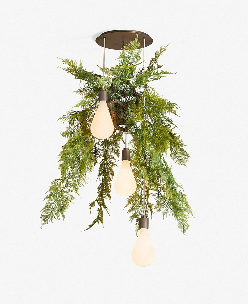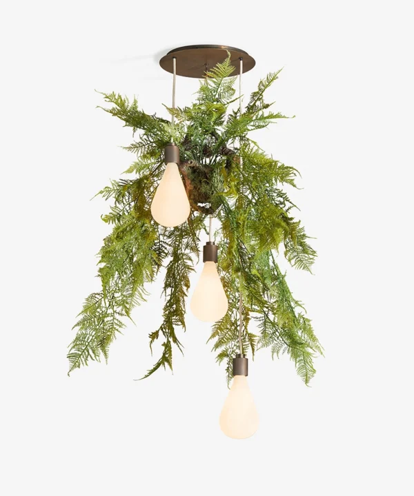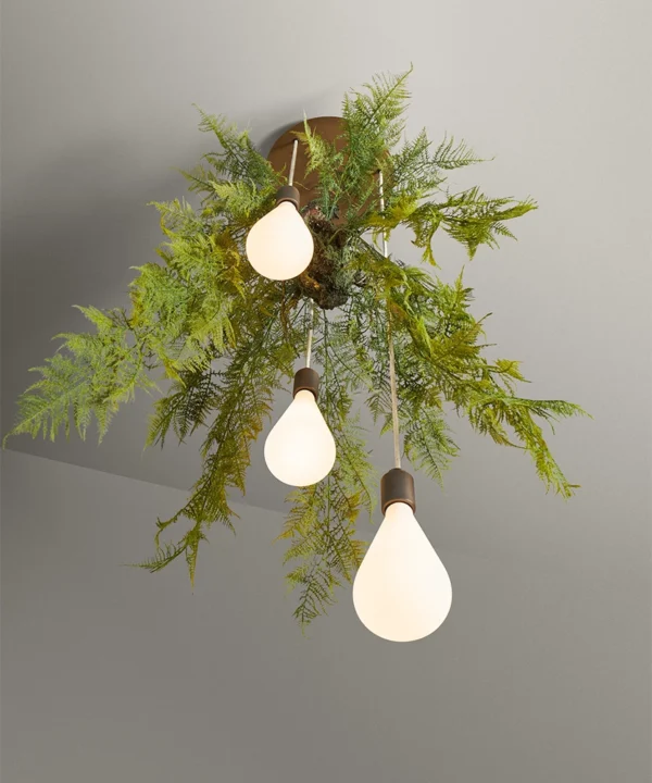 Comprising three opaque glass shades suspended from a large ceiling rose with black or linen cable options, this Dowsing & Reynolds design is for indoor use only. The faux fern hooks securely in place and removes easily for cleaning.