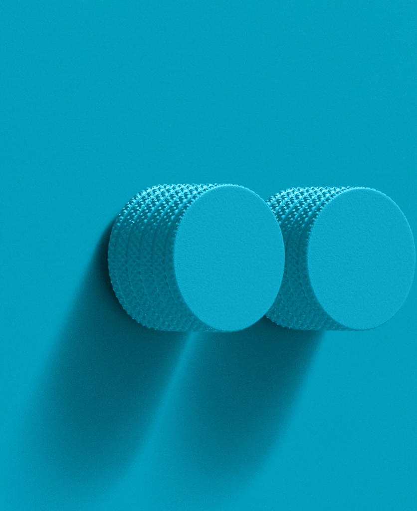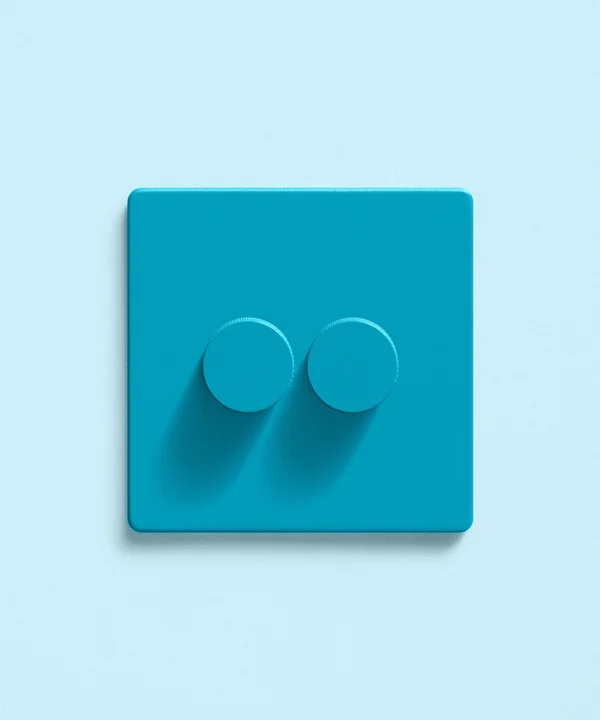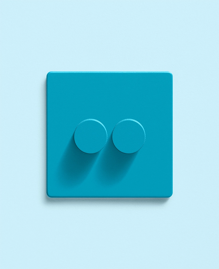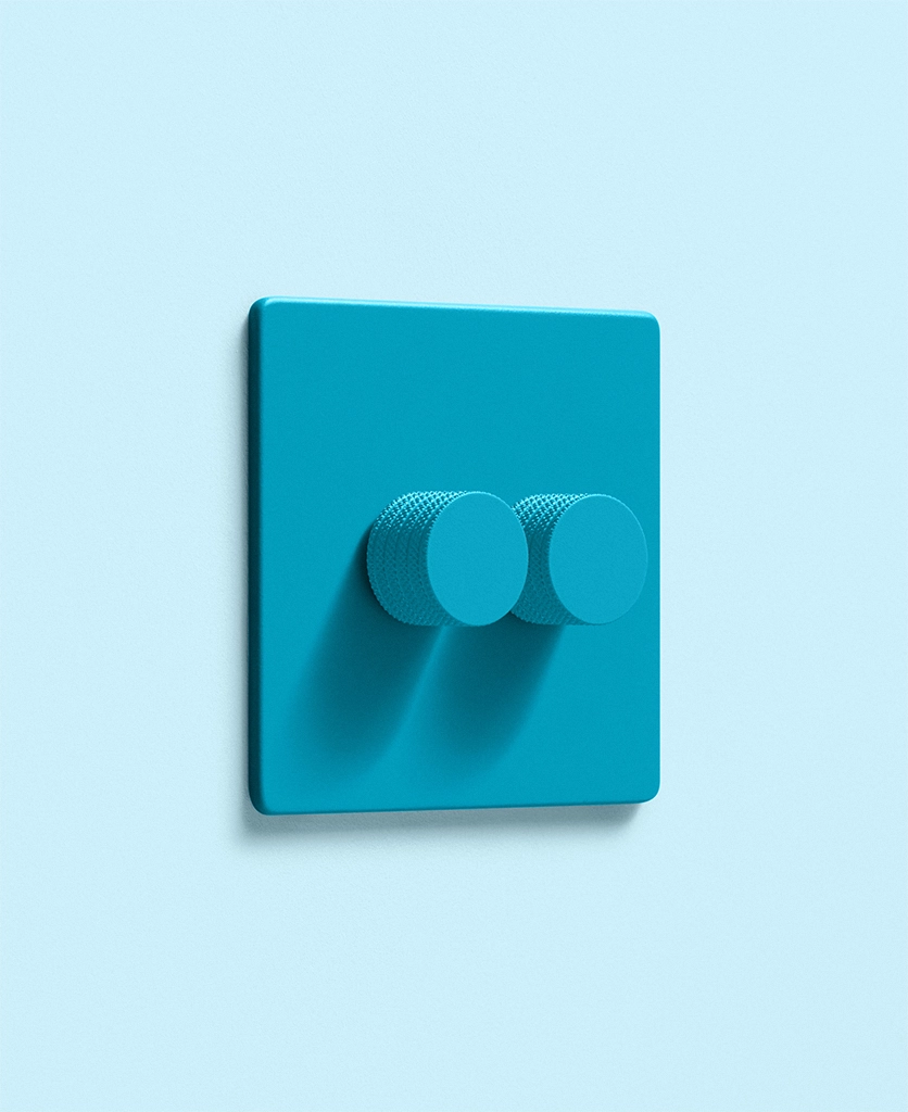 Rotating one dial, the kitchen wall lights lift. The second sets a gentle glow over the dining table. Your lighting shifts with your day — and the switch quietly keeps up. Framed in breezy aqua, this matt-finish dimmer brings a welcome hit of colour to a practical detail.