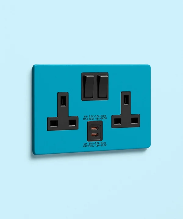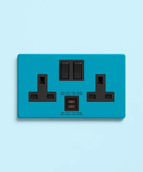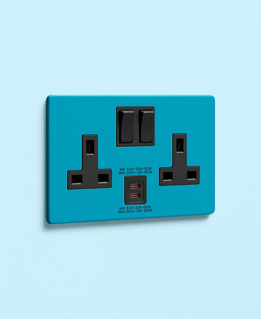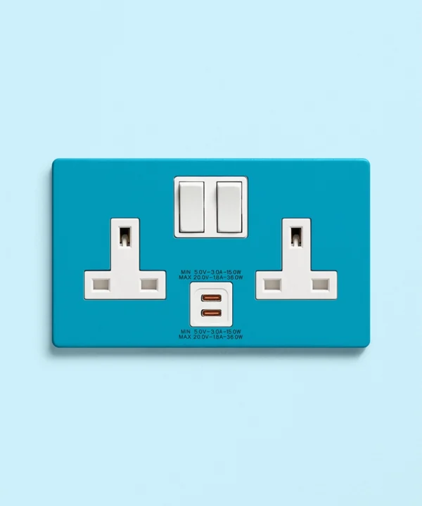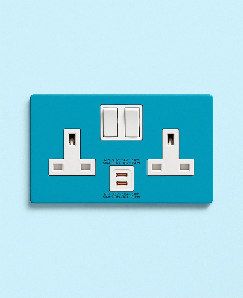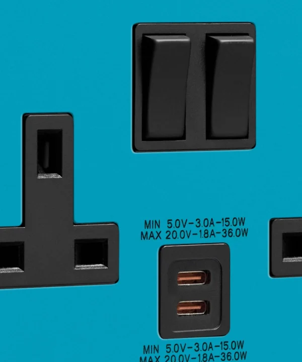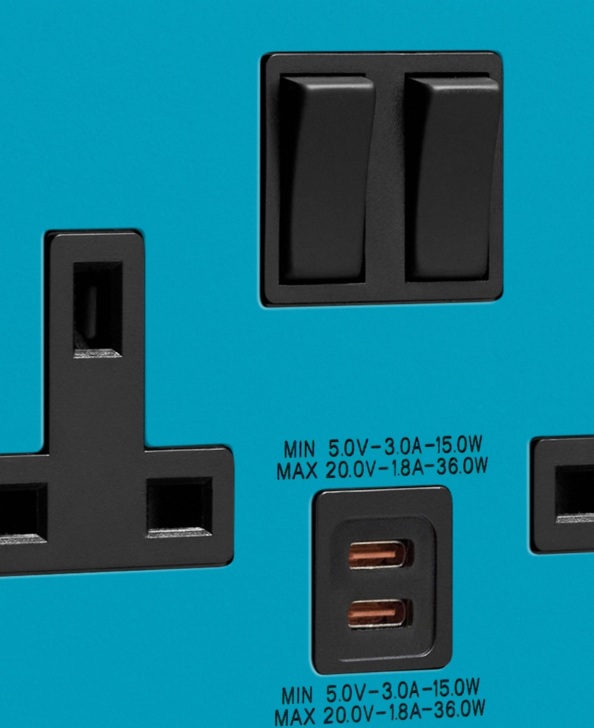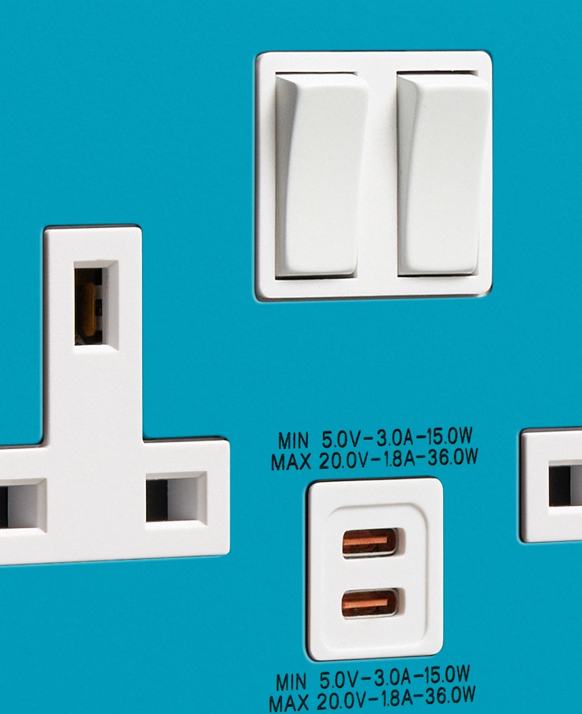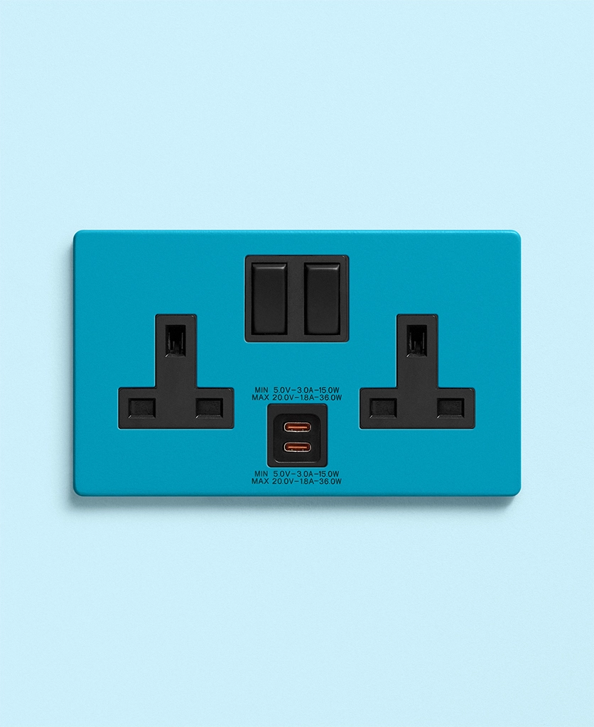 An Aqua Double Socket with USBC+C: Fresh and future-ready; charging that lifts the room