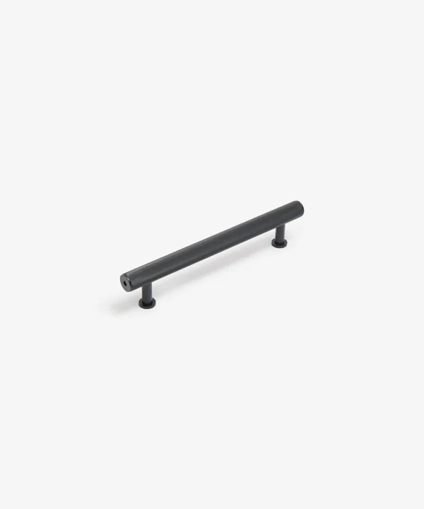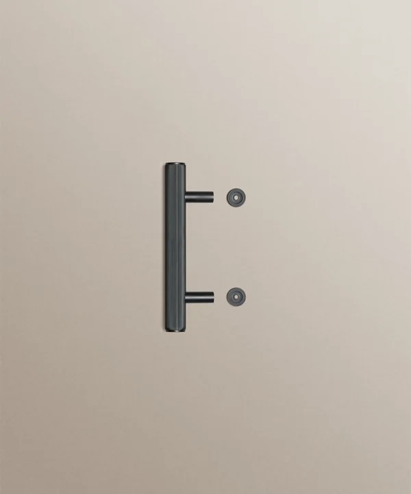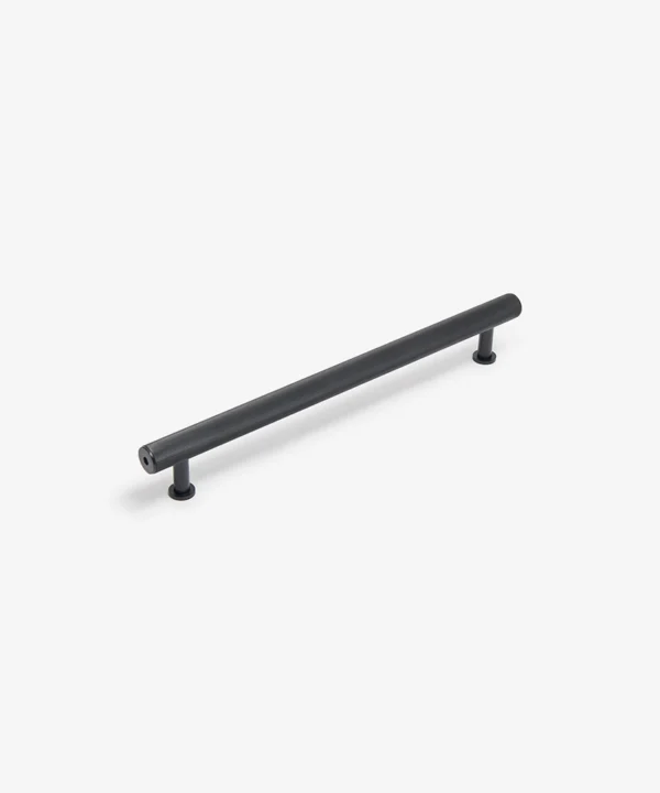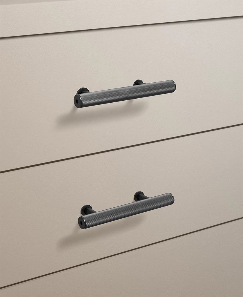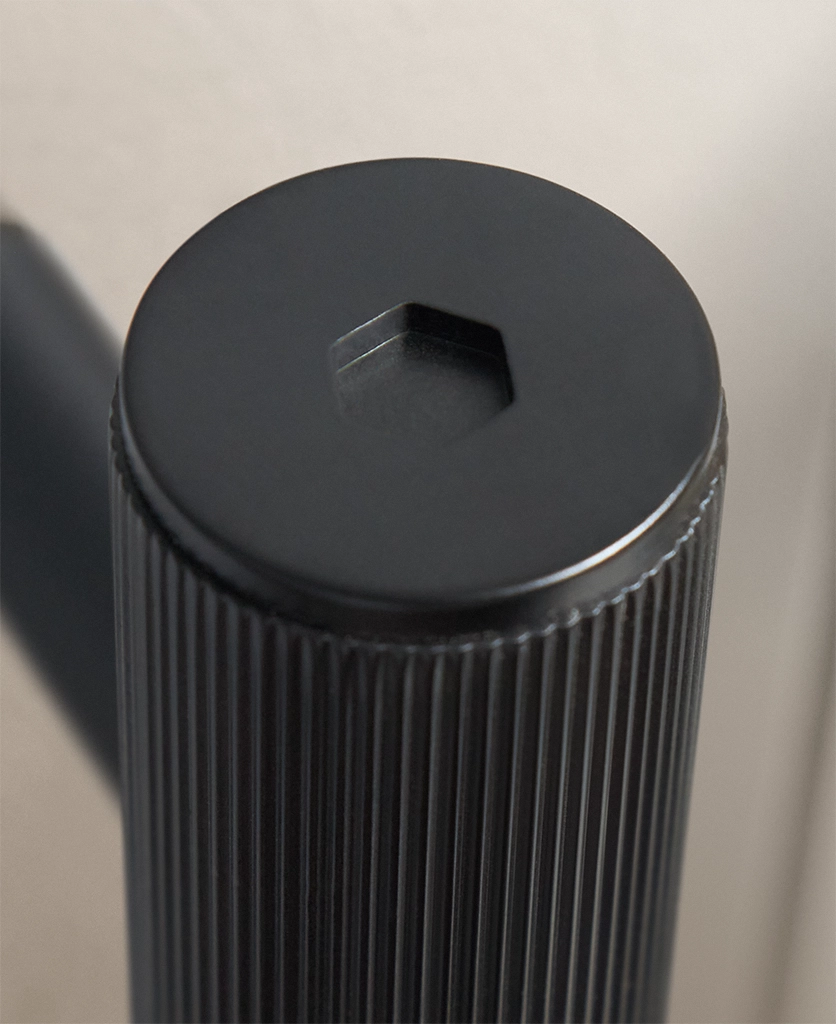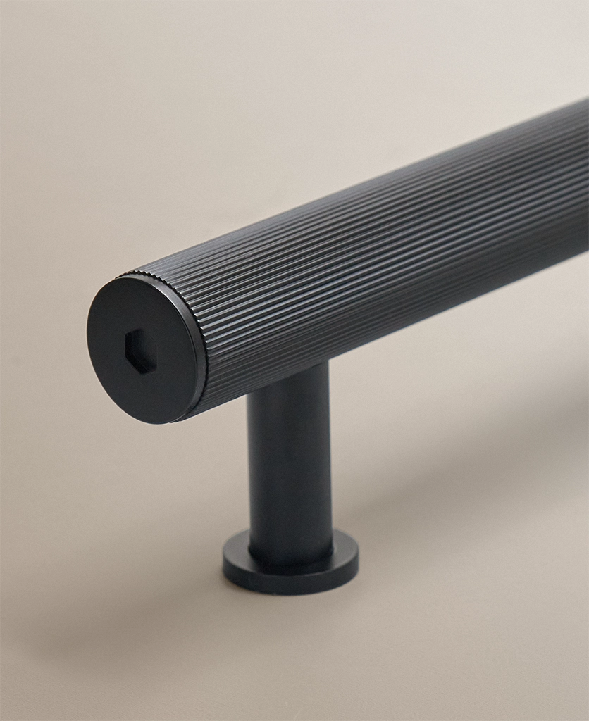 Made from solid metal with a durable black finish, each handle is defined by its ribbed grip and clean cylindrical silhouette. Optional stepped feet allow you to introduce an extra architectural note if desired. Designed for cupboards and drawers throughout the home and suitable for indoor use only.