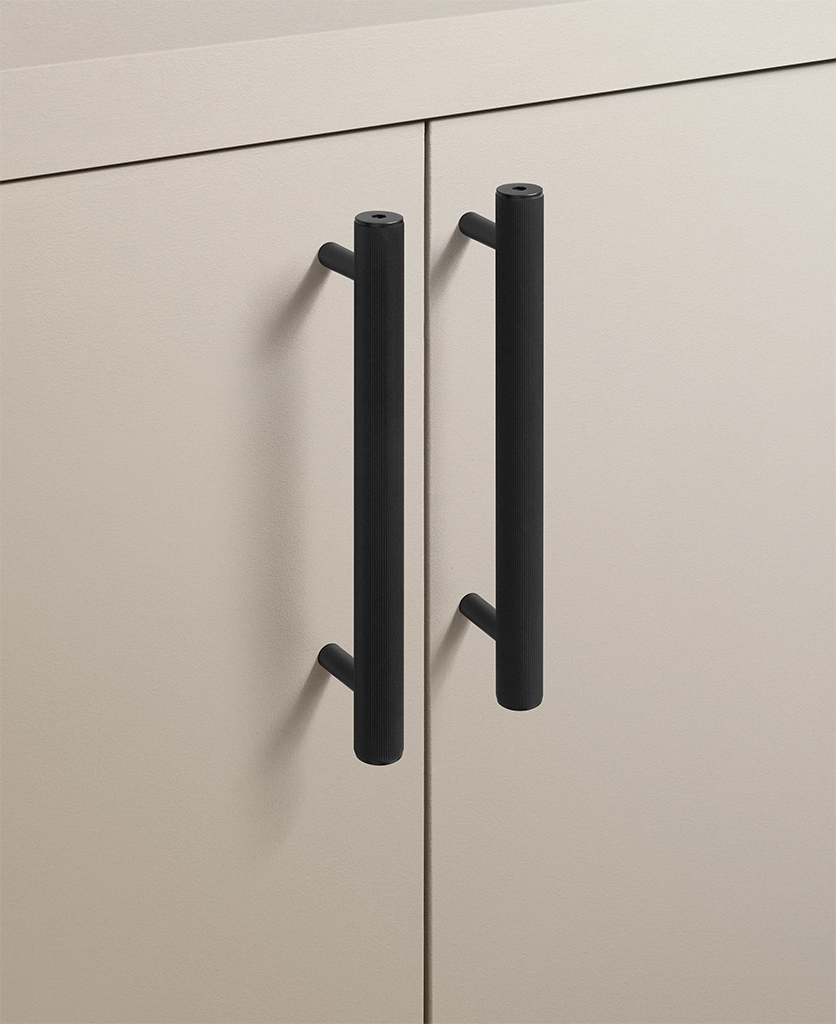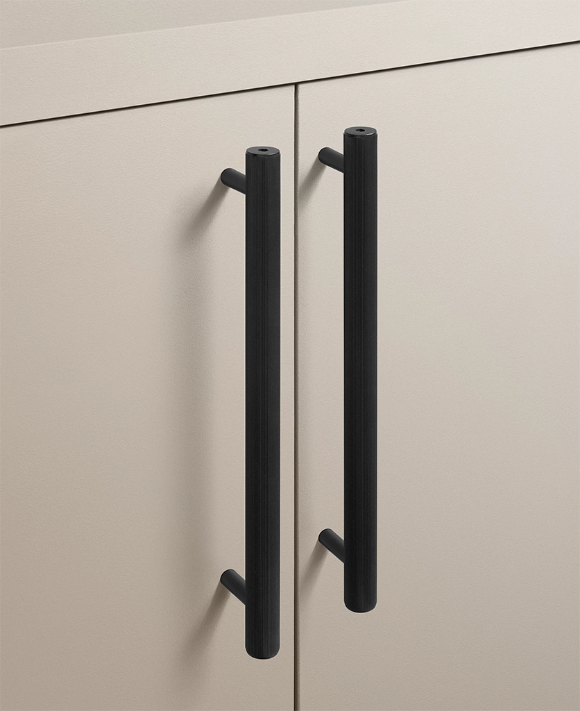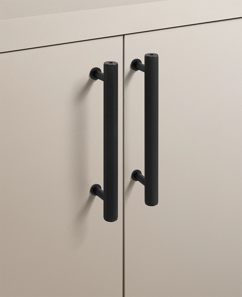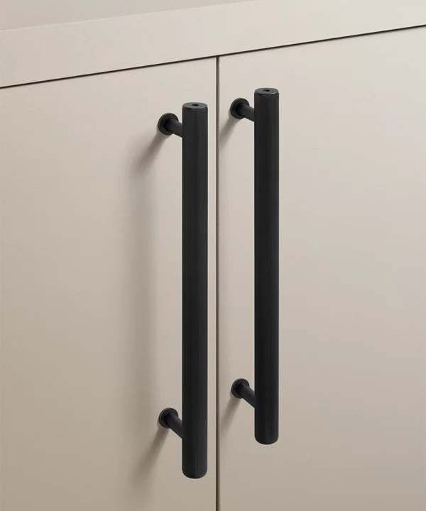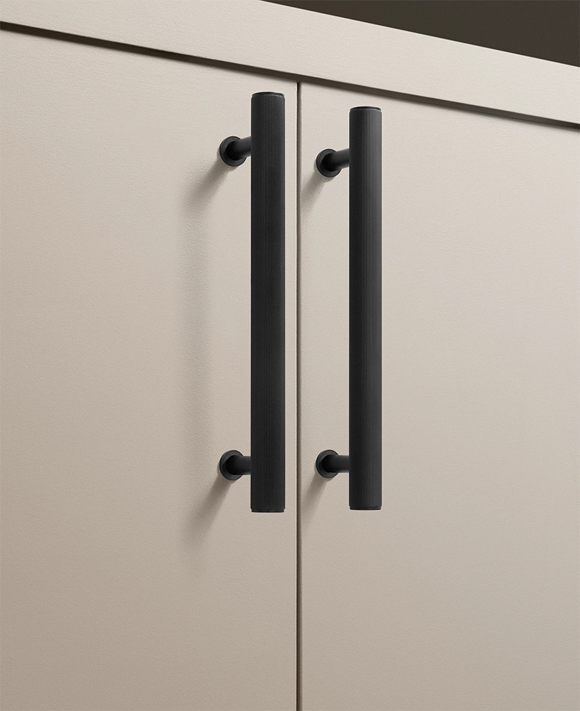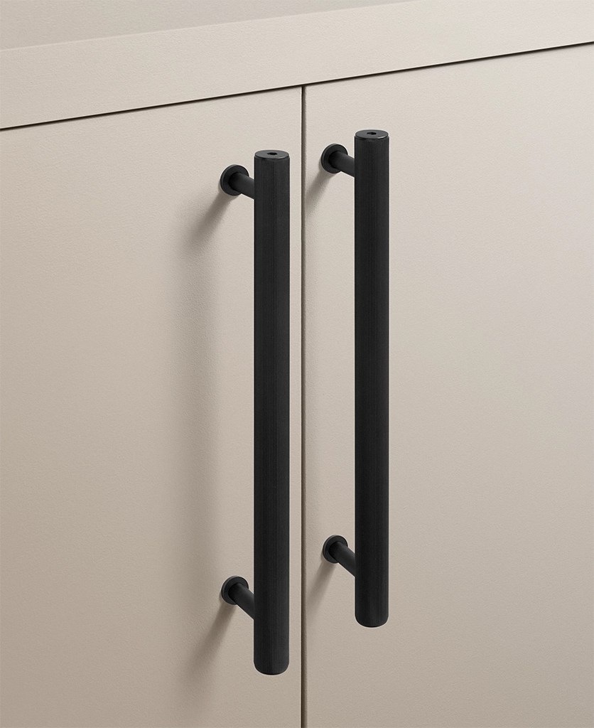 Black Portico ribbed handles are particularly effective in contemporary kitchens, boot rooms and utility spaces where clean lines matter. They work beautifully against pale cabinetry, natural timber and stone, introducing contrast without visual noise. The ribbed detailing adds interest up close, while the overall form remains restrained and architectural.