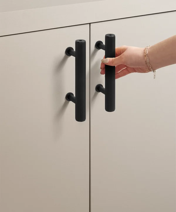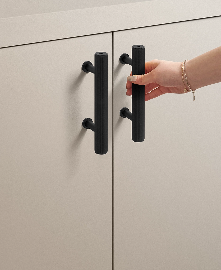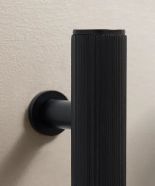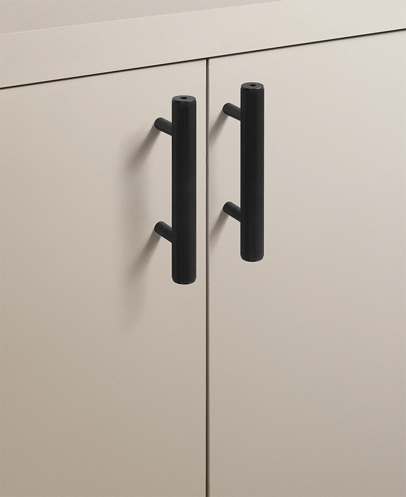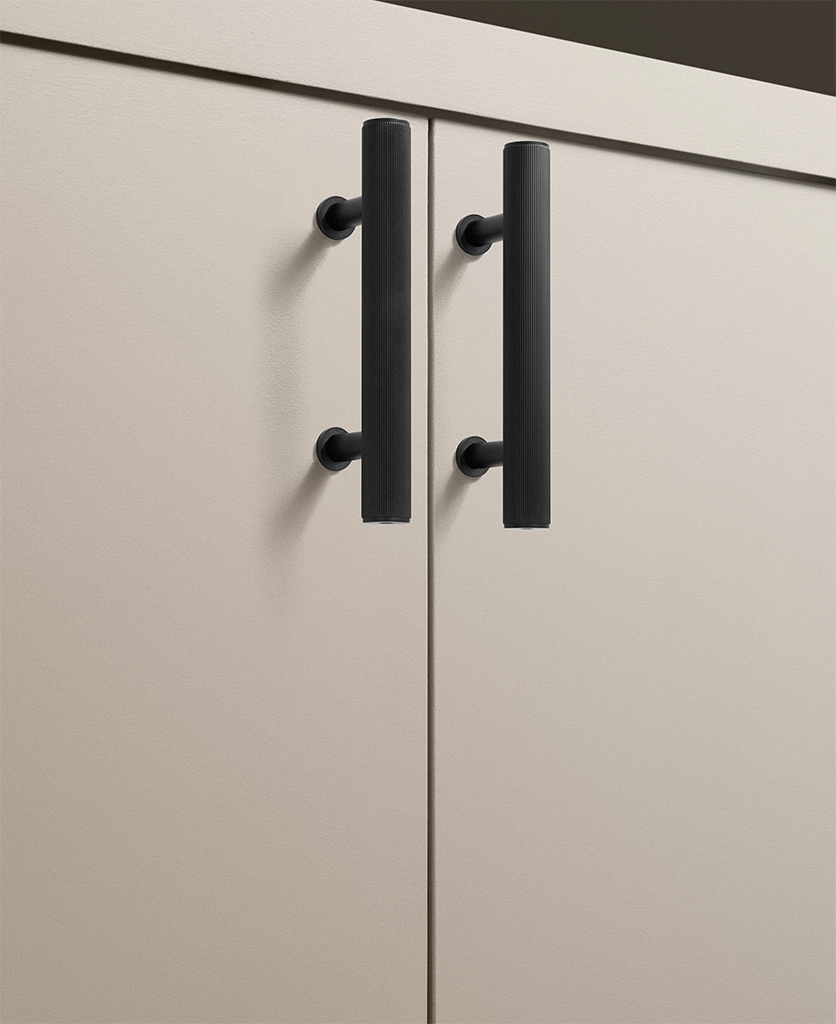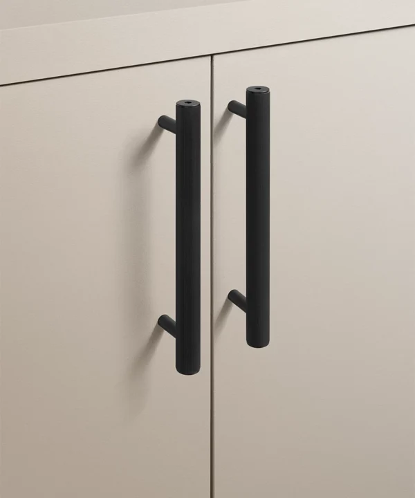 Black Portico ribbed handles are particularly effective in contemporary kitchens, boot rooms and utility spaces where clean lines matter. They work beautifully against pale cabinetry, natural timber and stone, introducing contrast without visual noise. The ribbed detailing adds interest up close, while the overall form remains restrained and architectural.