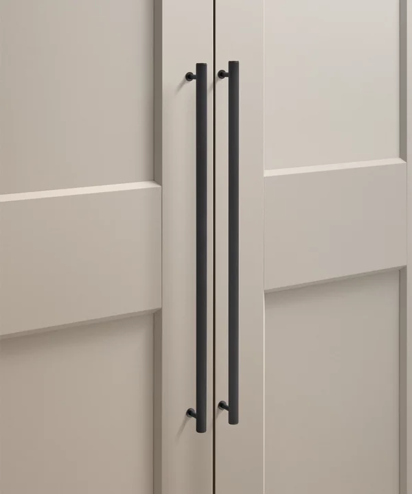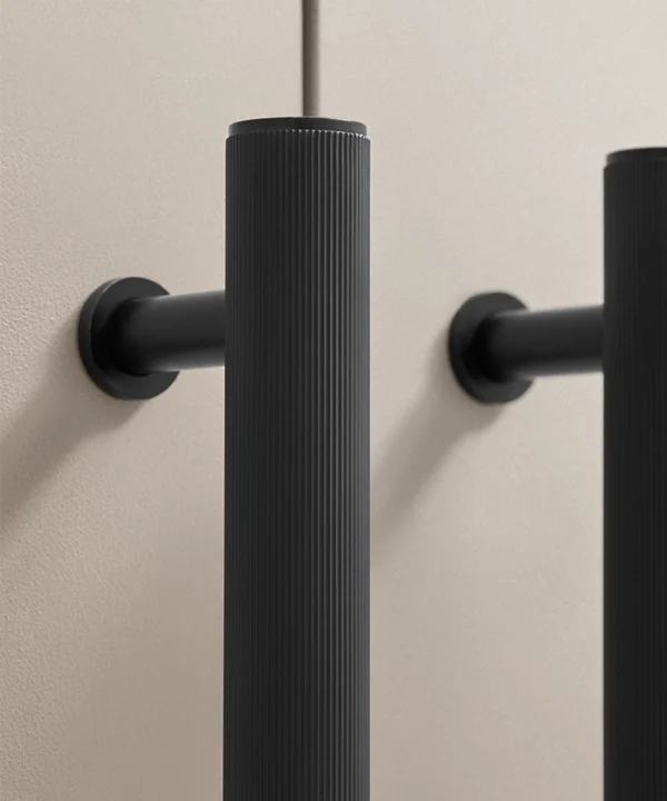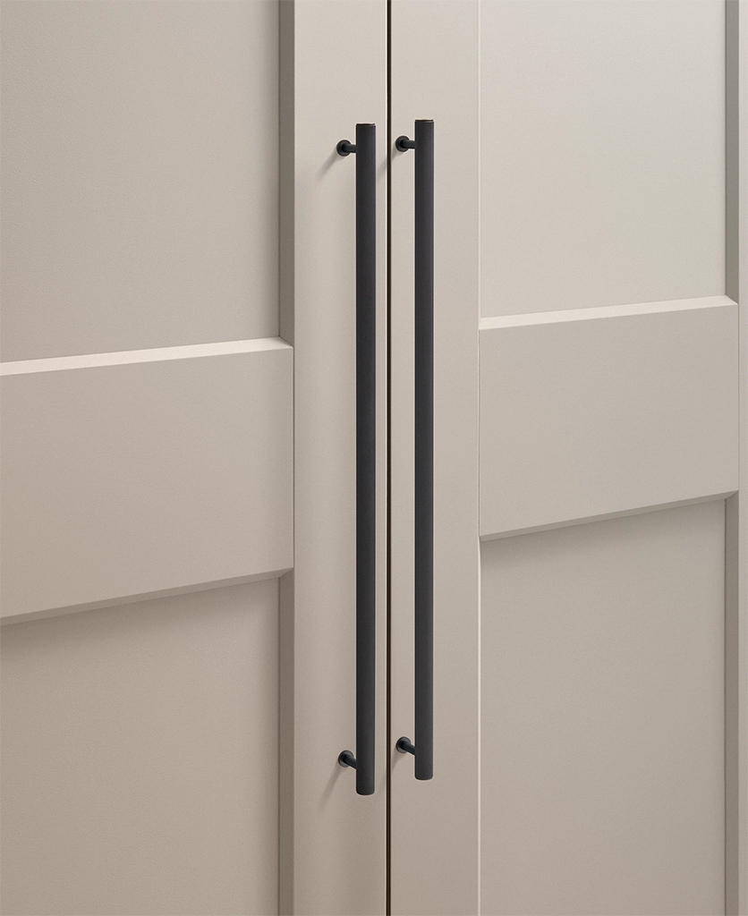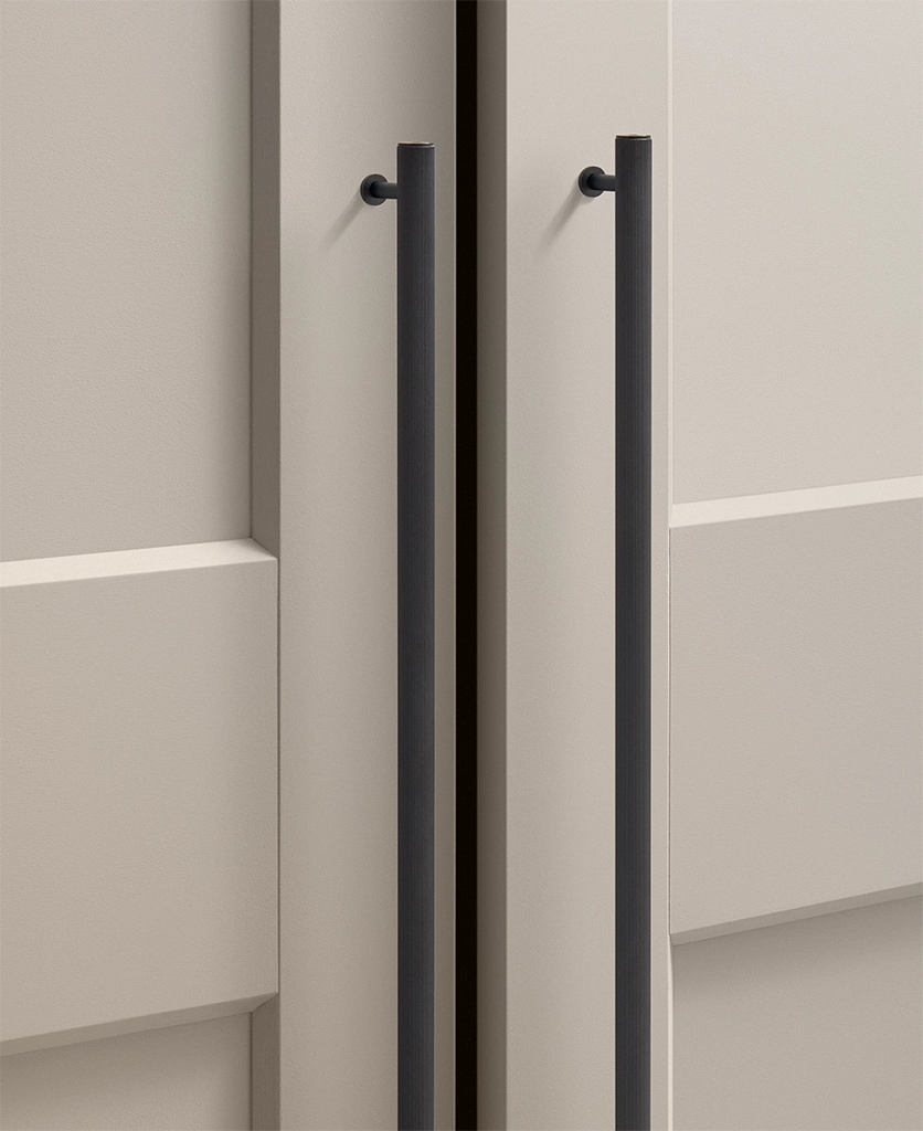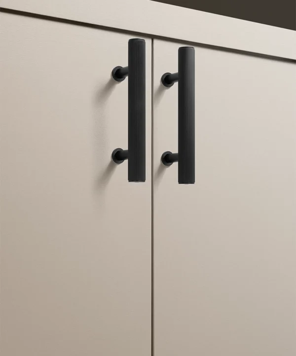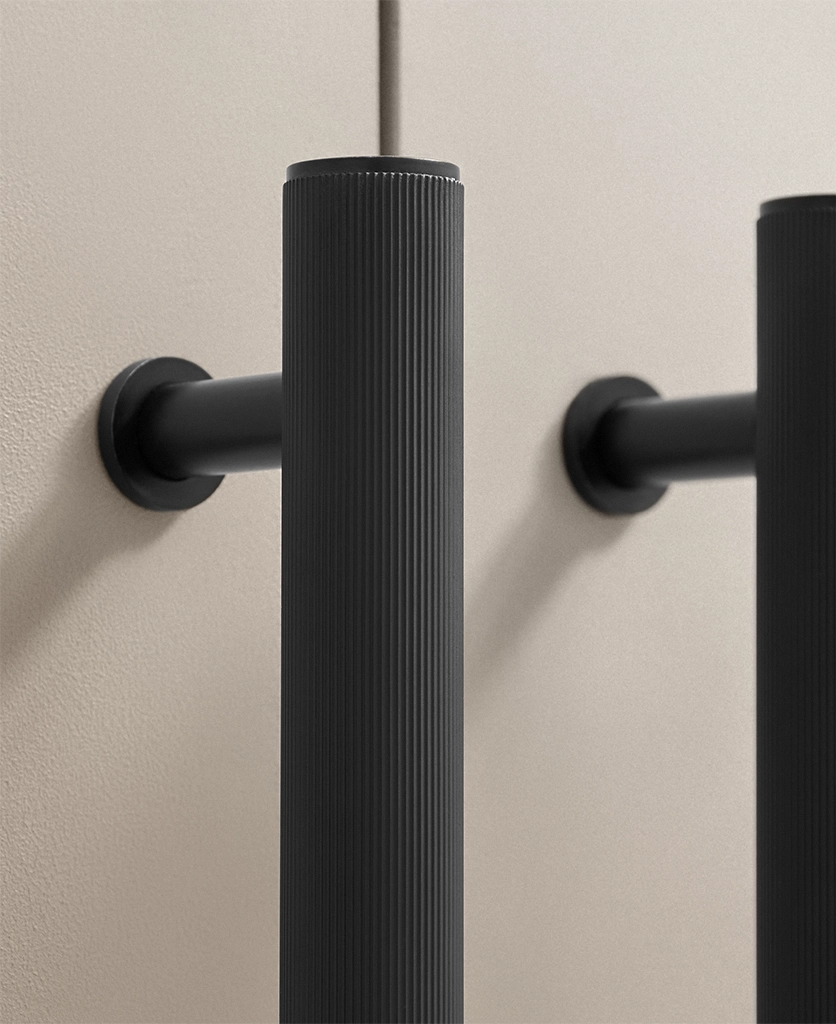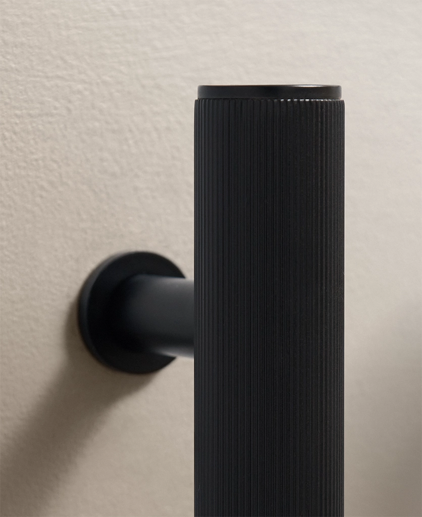 Black Portico ribbed handles are particularly effective in contemporary kitchens, boot rooms and utility spaces where clean lines matter. They work beautifully against pale cabinetry, natural timber and stone, introducing contrast without visual noise. The ribbed detailing adds interest up close, while the overall form remains restrained and architectural.
