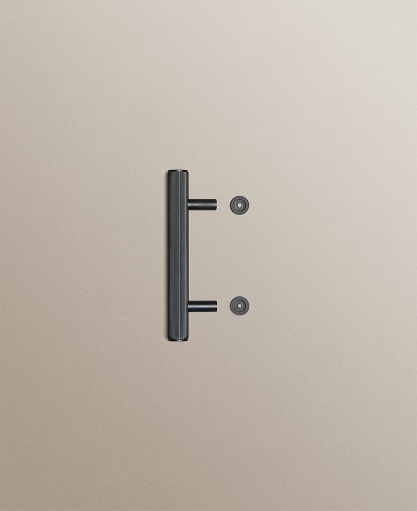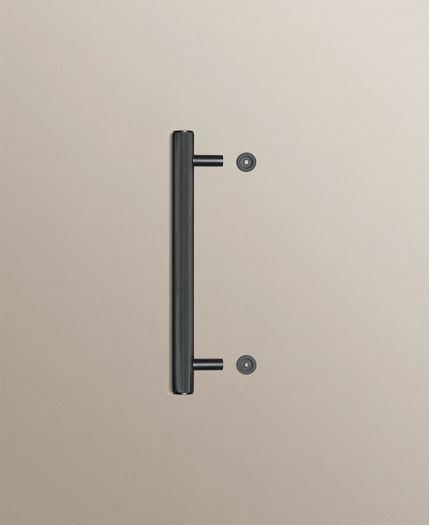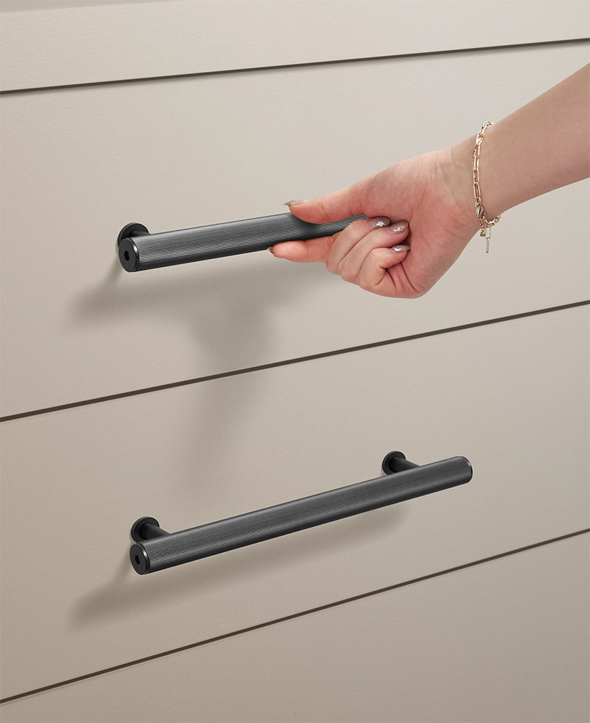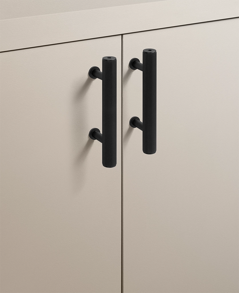 Closing a cupboard door, you feel the reassuring weight of solid metal beneath your hand. The ribbed surface offers a gentle grip, while the deep black finish absorbs the light, lending your cabinetry a calm, grounded presence.