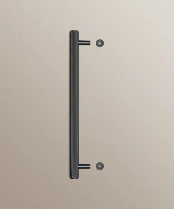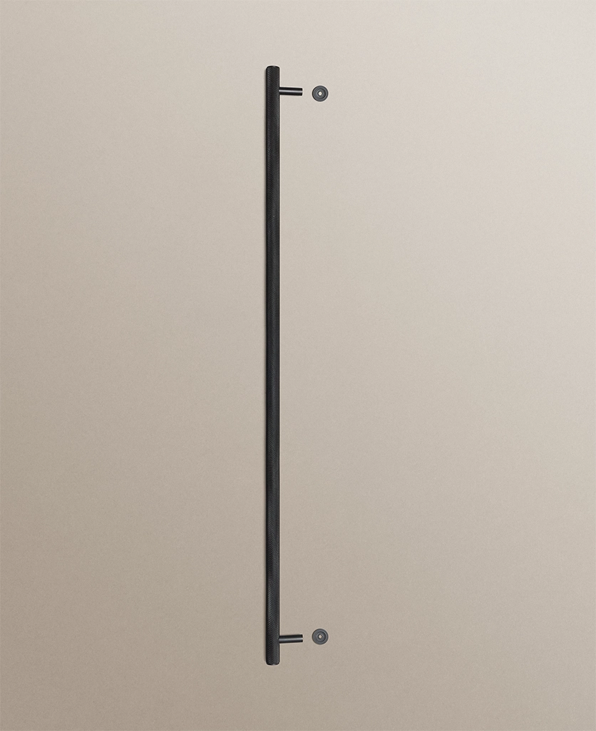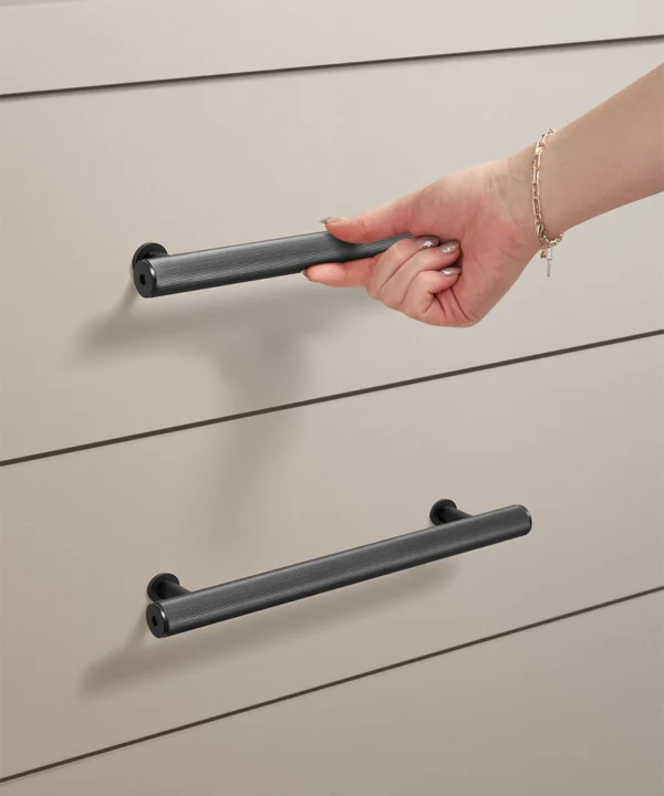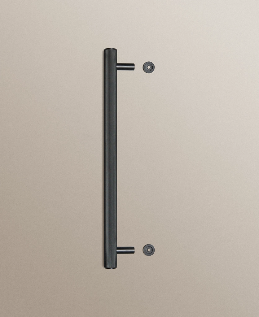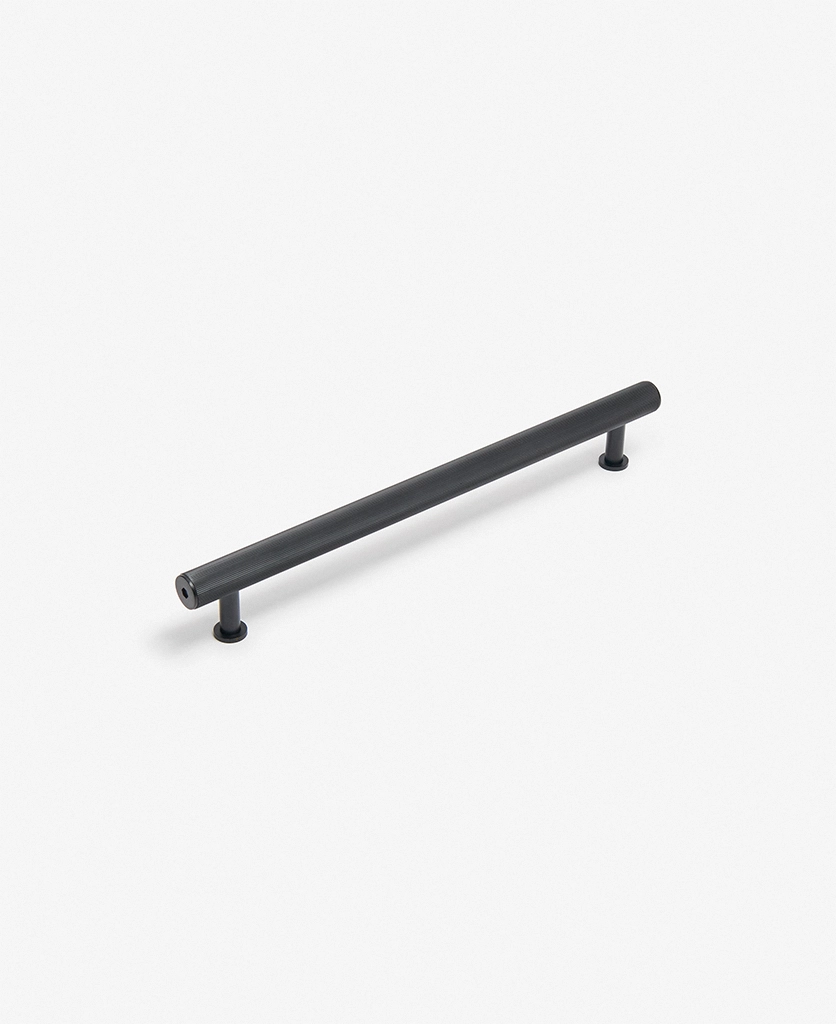 Closing a cupboard door, you feel the reassuring weight of solid metal beneath your hand. The ribbed surface offers a gentle grip, while the deep black finish absorbs the light, lending your cabinetry a calm, grounded presence.
