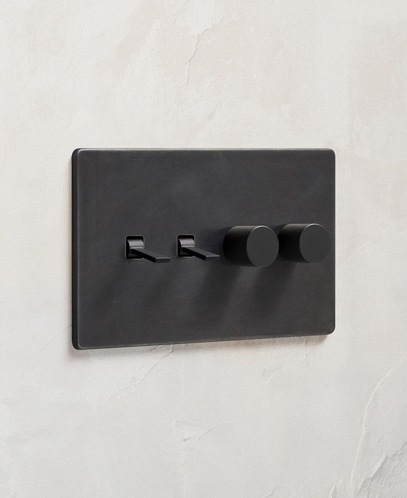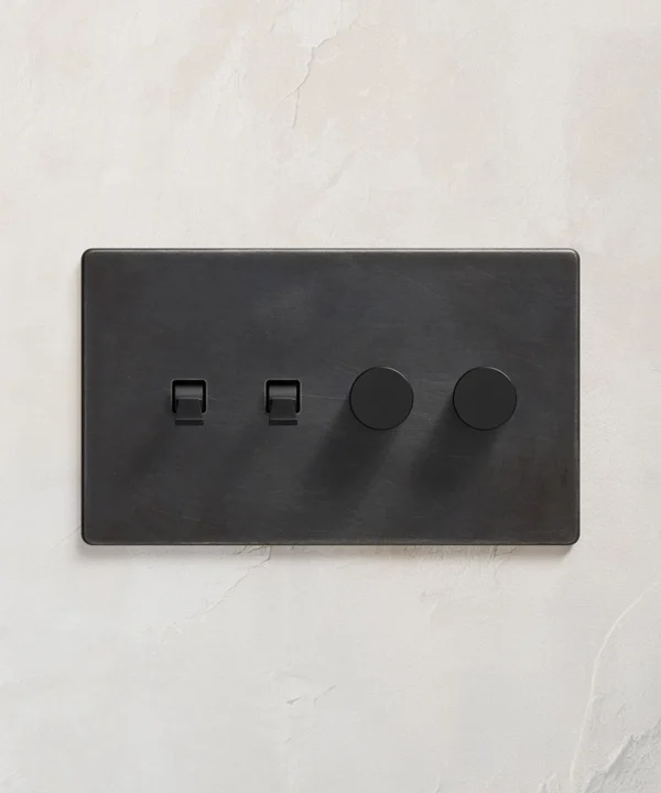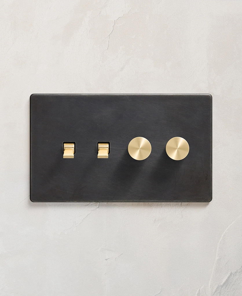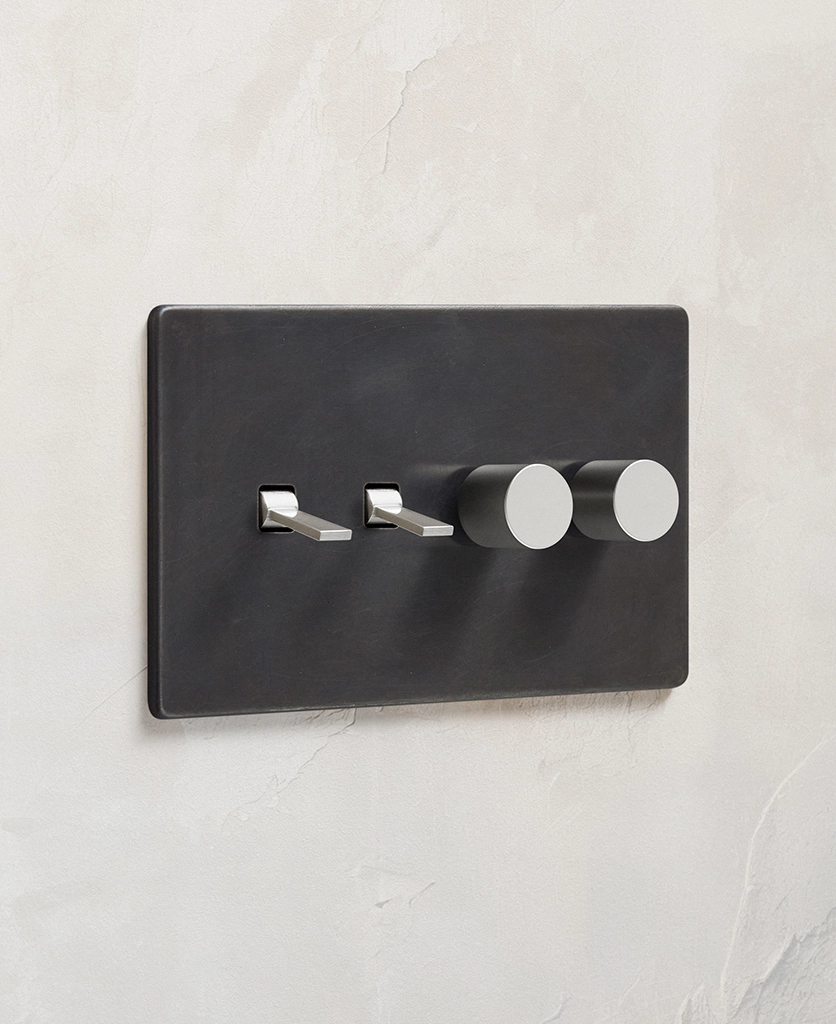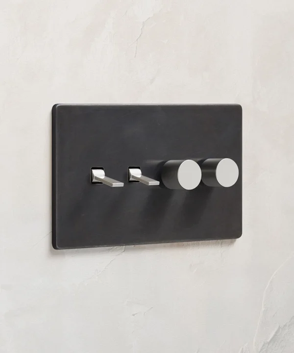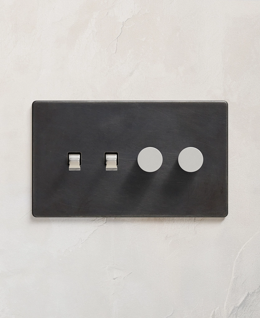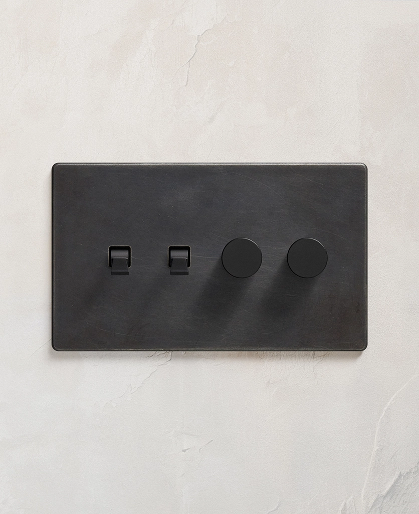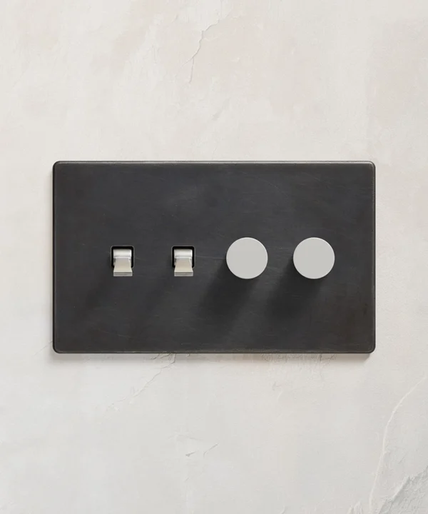 Home / Shop / Light Switches / Blackened Steel Quadruple Combo Switch (2 Toggle, 2 Dimmer)