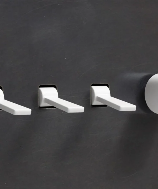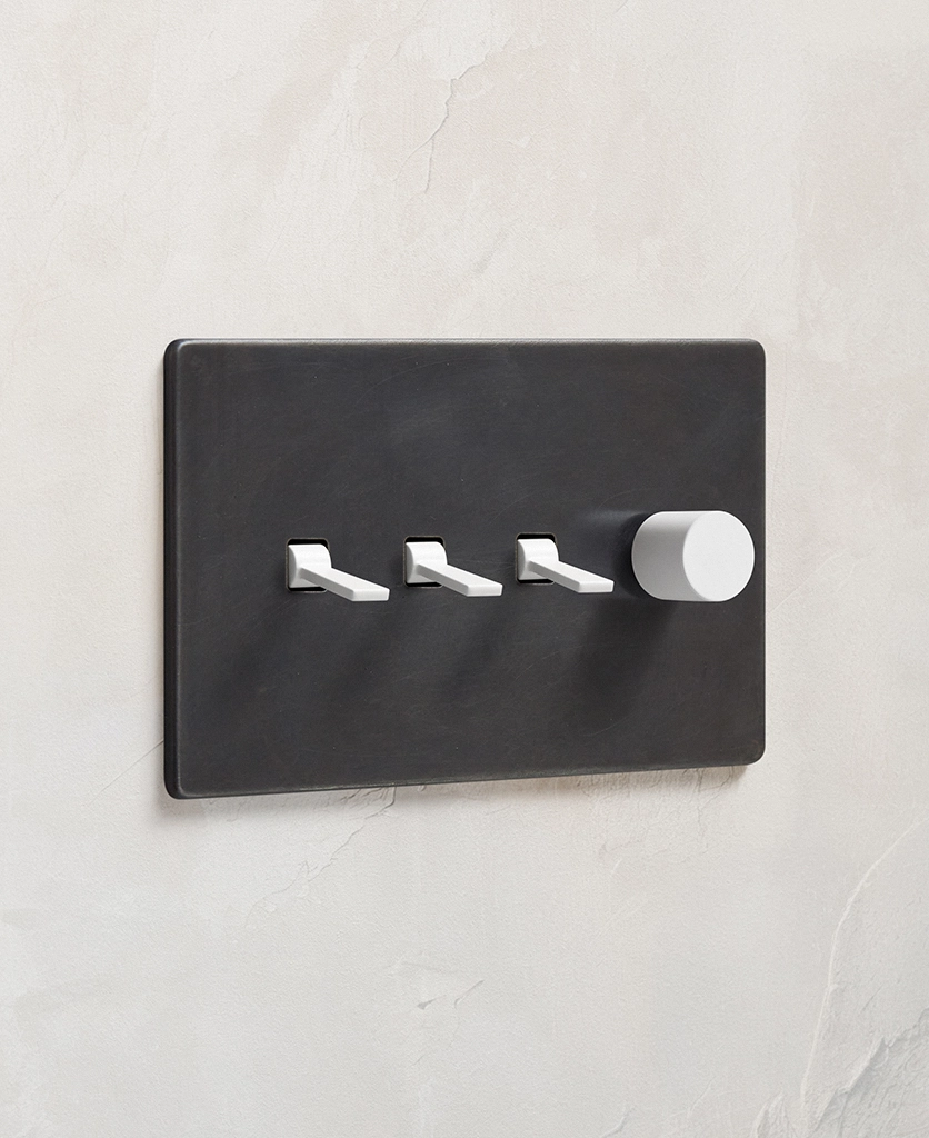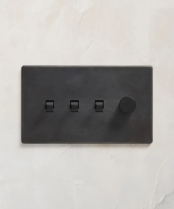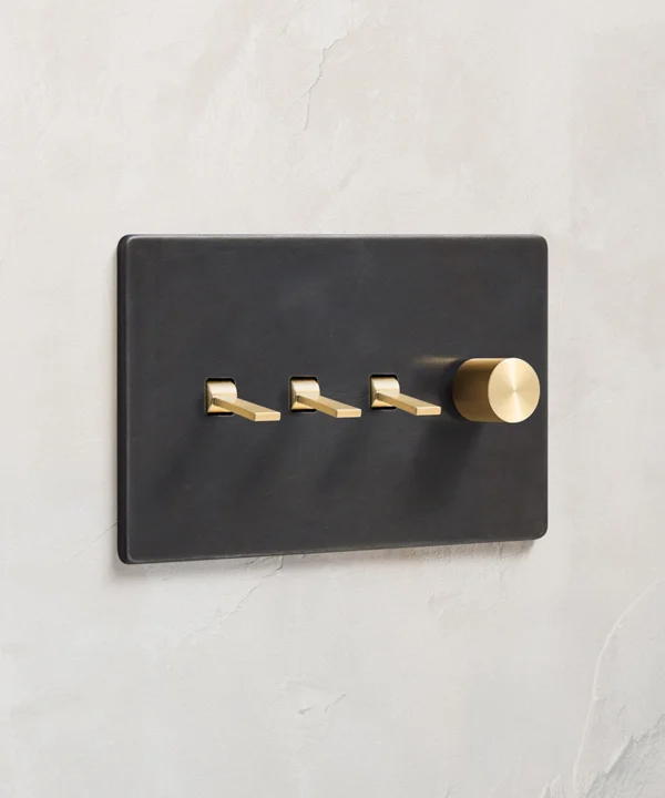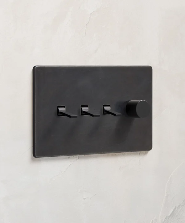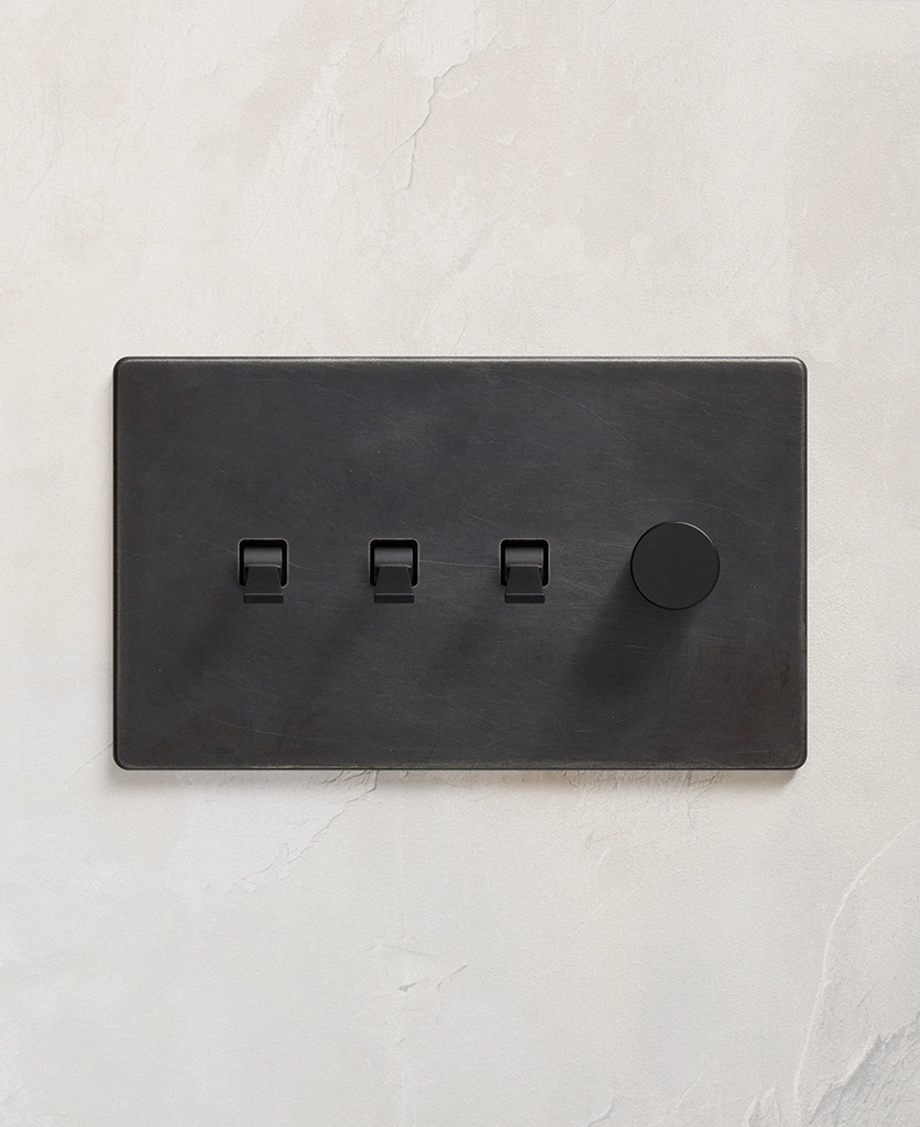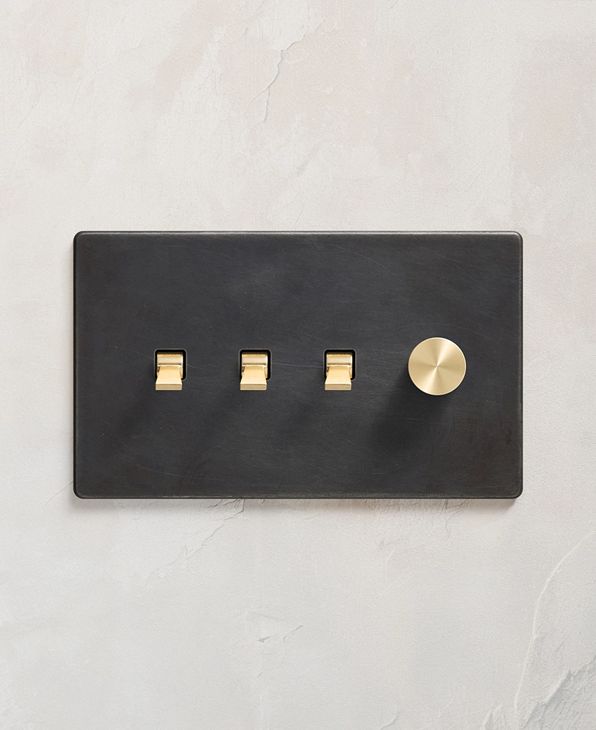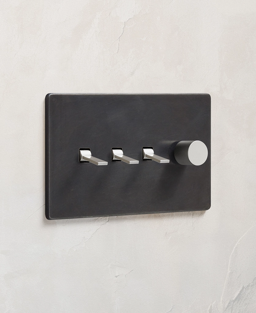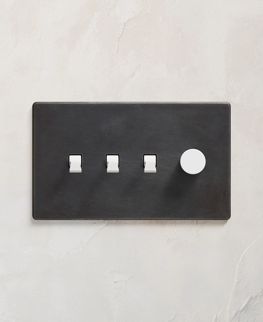 Heading into the evening, you flick on the kitchen, hallway, and exterior lights in a few quick movements, then turn the final dimmer to gently lower the brightness over the dining table. The blackened steel quadruple combo switch brings it all together—three practical toggles and one adjustable dimmer that let you tailor your lighting to suit every part of your space.