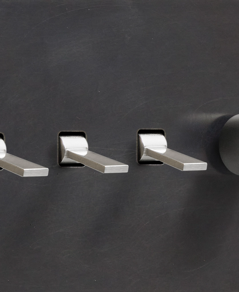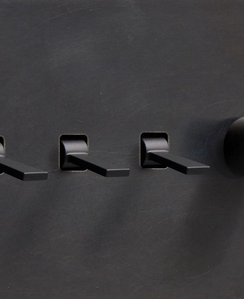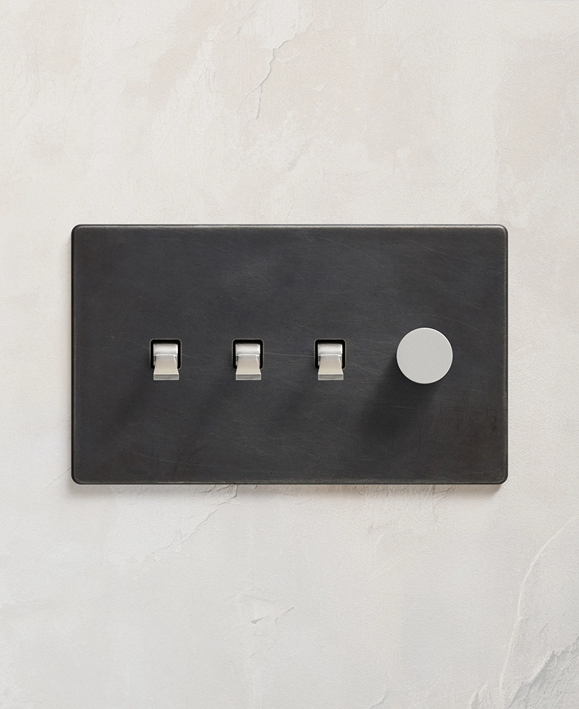 Home / Shop / Light Switches / Blackened Steel Quadruple Combo Switch (3 Toggle, 1 Dimmer)