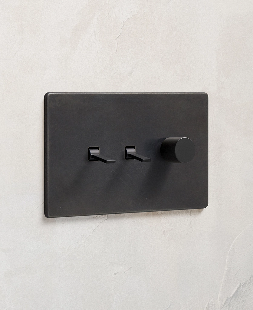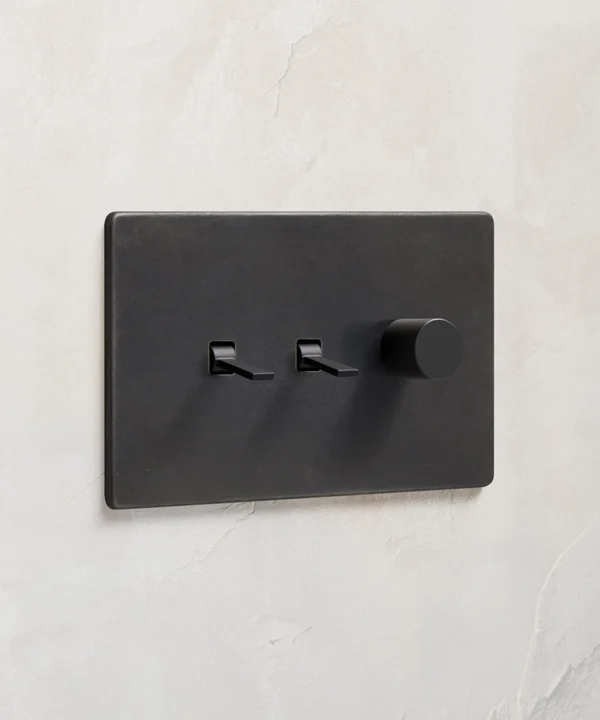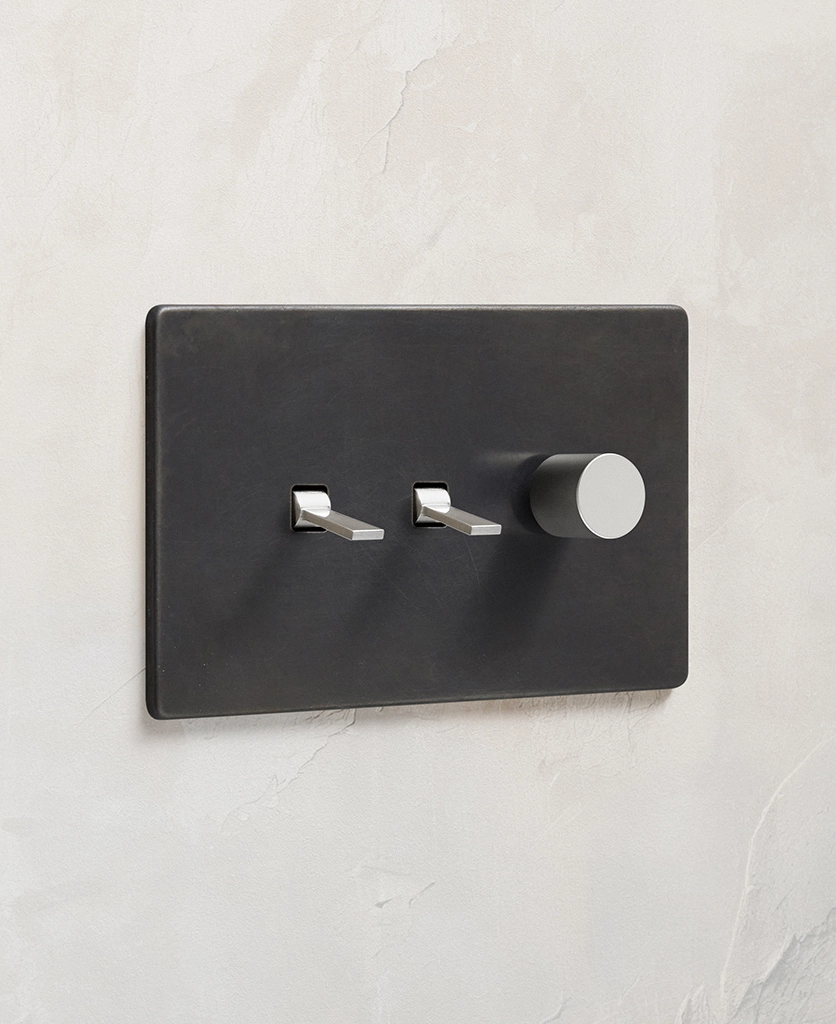 Home / Shop / Light Switches & Sockets / Blackened Steel Sockets & Switches / Blackened Steel Triple Combo Switch (2 Toggle, 1 Dimmer)