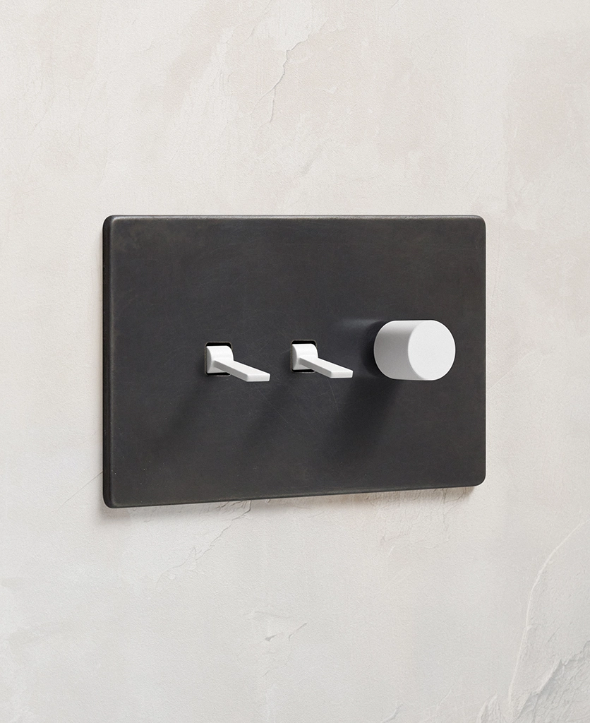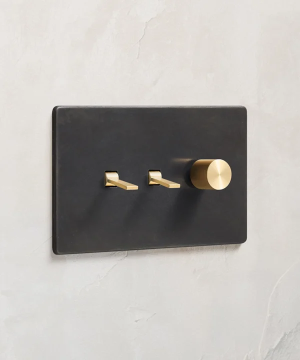 Turning on the hallway and kitchen lights with two satisfying flicks, you then rotate the dimmer to soften the glow over the dining table—setting the scene for a relaxed evening ahead. The blackened steel triple combo switch makes it all feel effortless, giving you precise control over three lighting zones in one clean, considered plate.