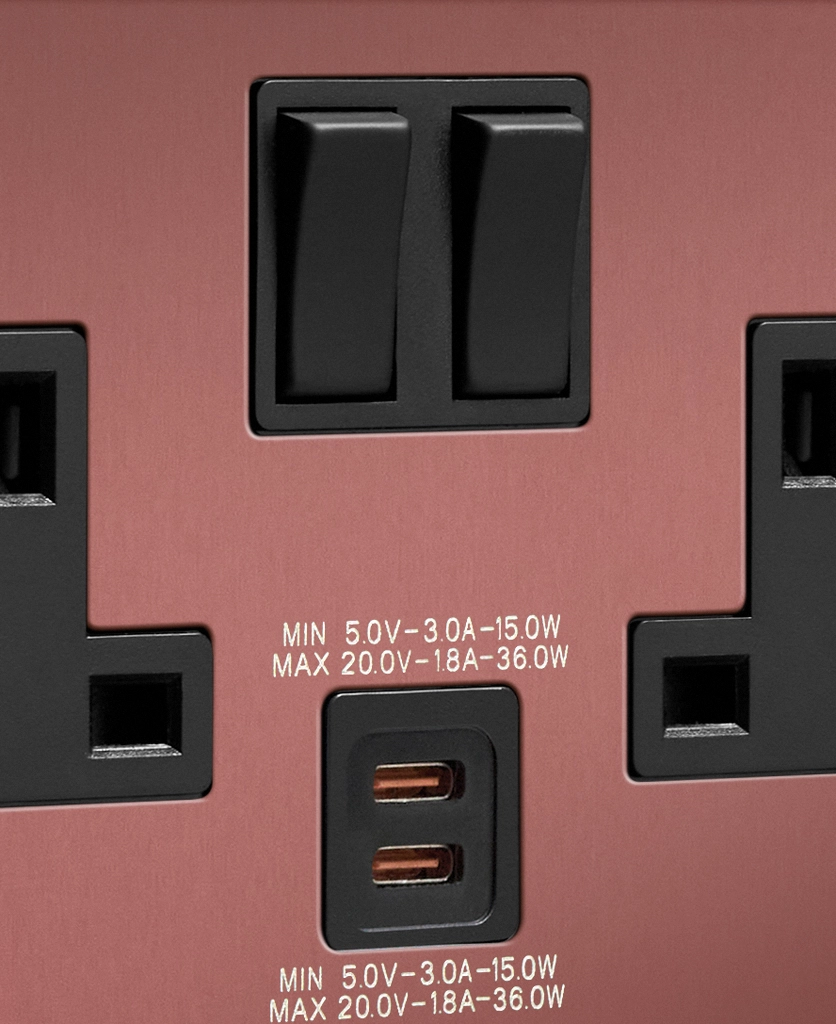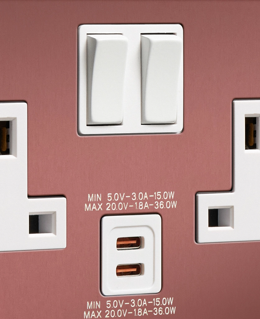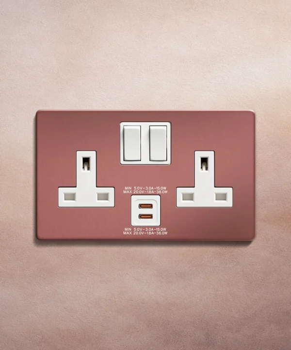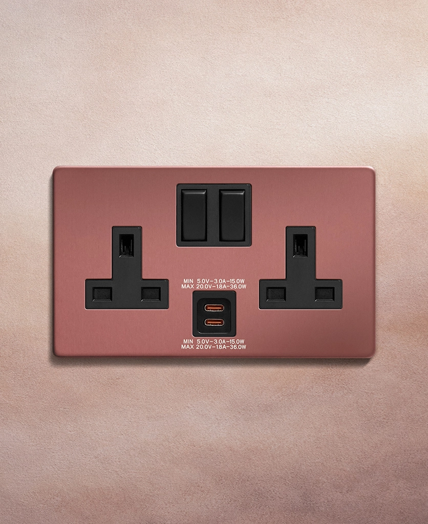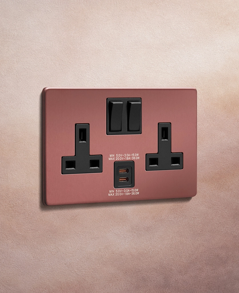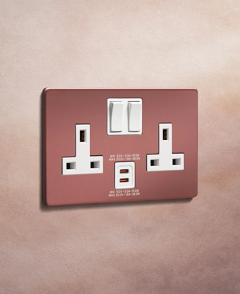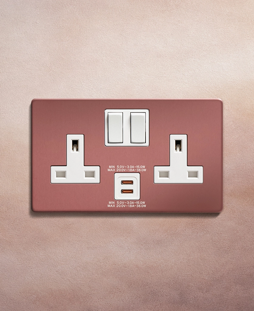 A brushed Blush double socket with USB and USB-C designed to bring soft rosé-toned warmth and discreet charging convenience to modern interiors.