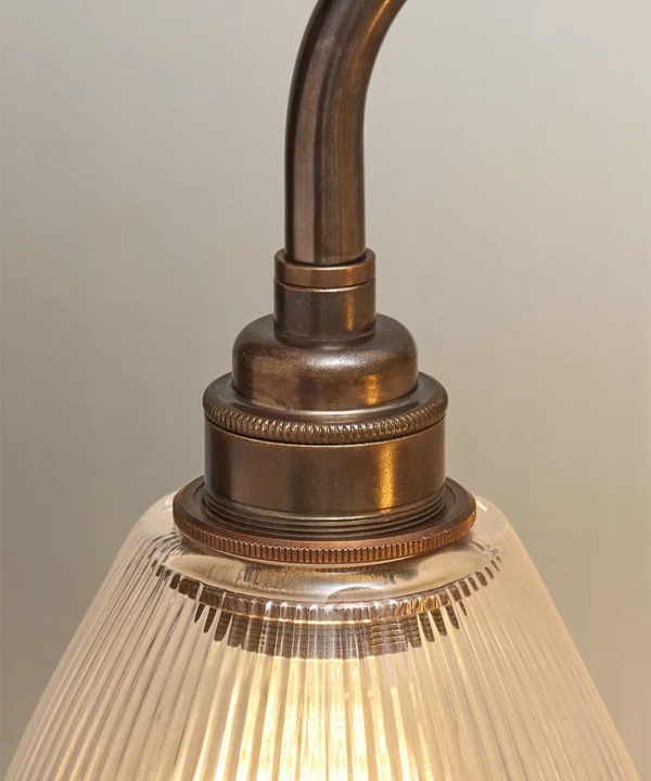 - Material: steel arm and gallery with brass bulb holder, glass fluted shade