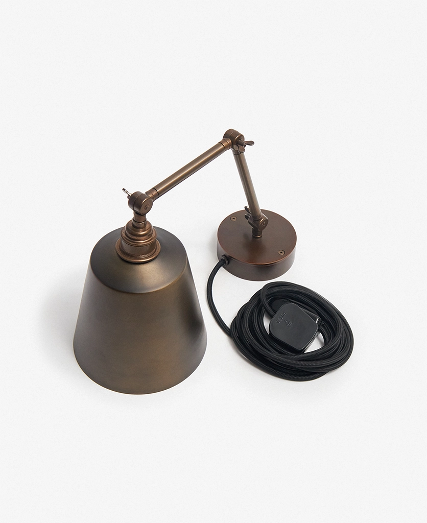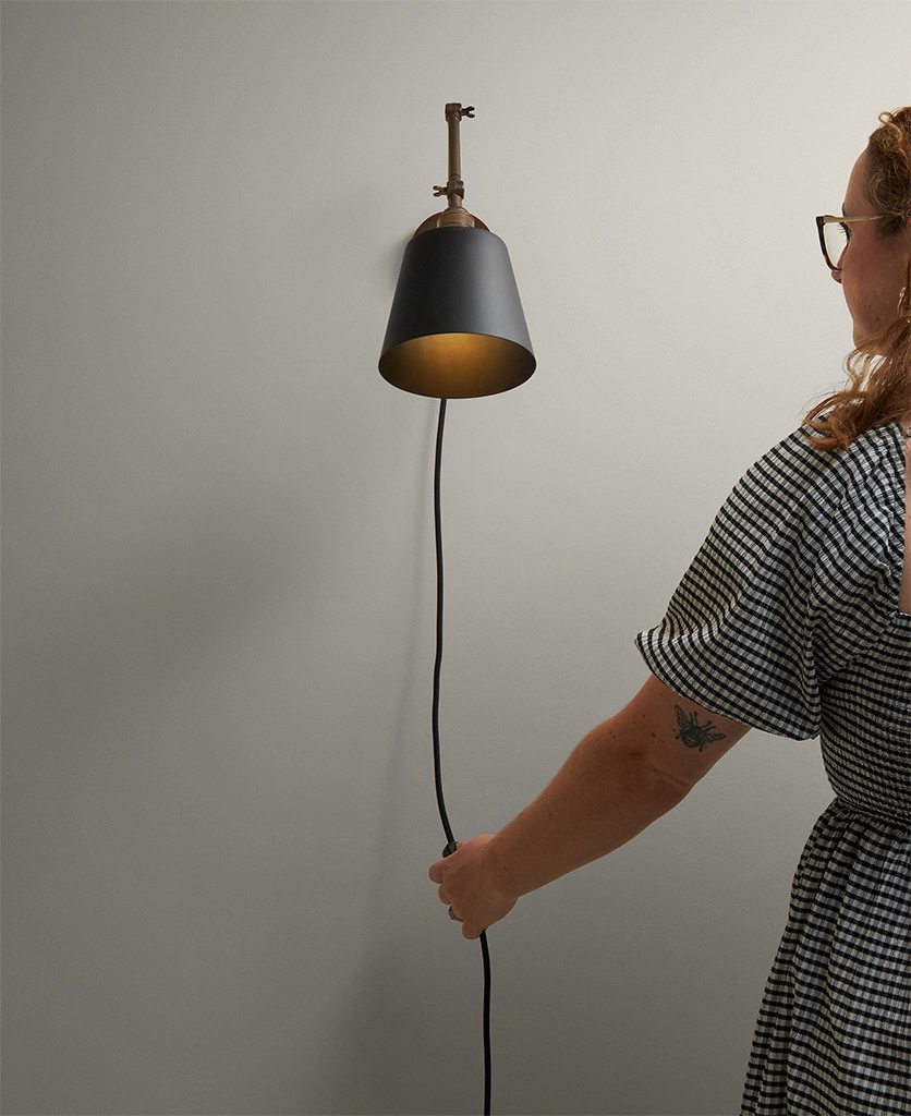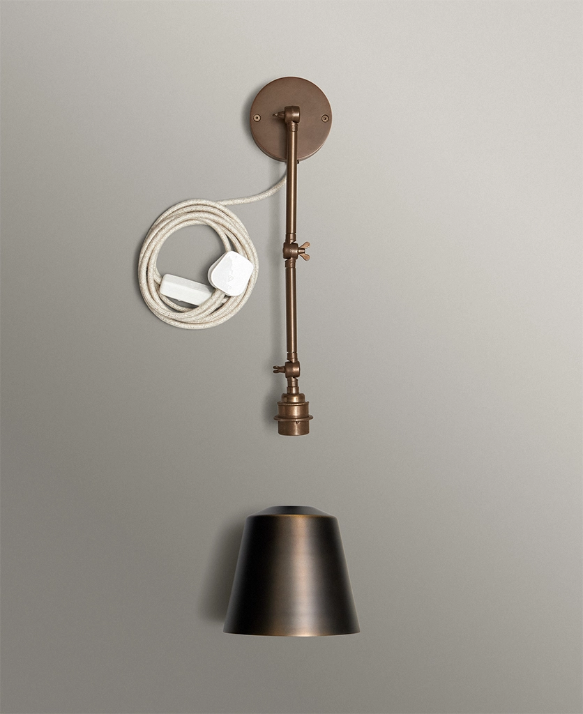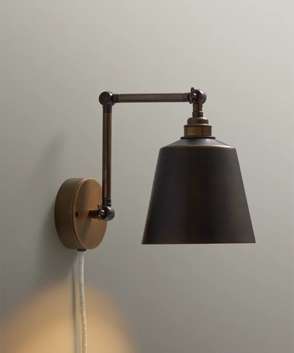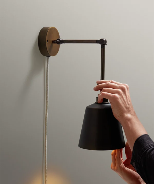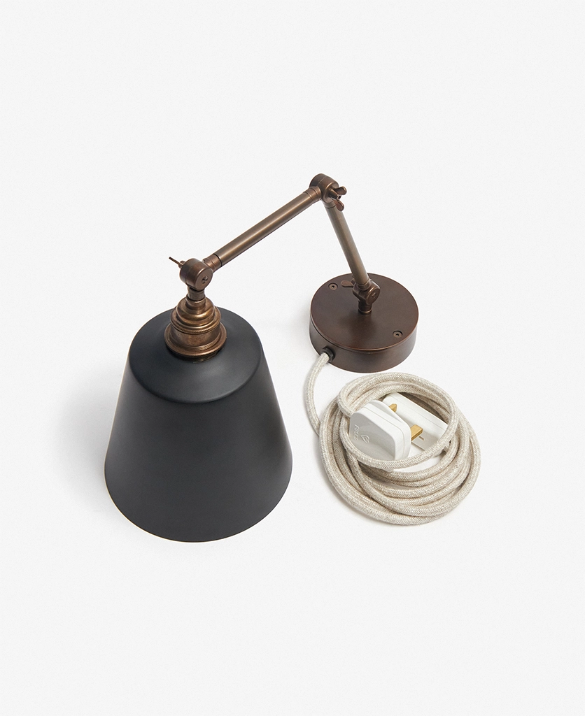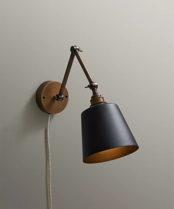 This is an ideal plug-in wall light for bedrooms, hallways or even dining areas where you want atmosphere without the disruption of installation. With its adjustable brass arm and choice of cable colour, it lets you tailor the look while adding warm, industrial notes to your space.