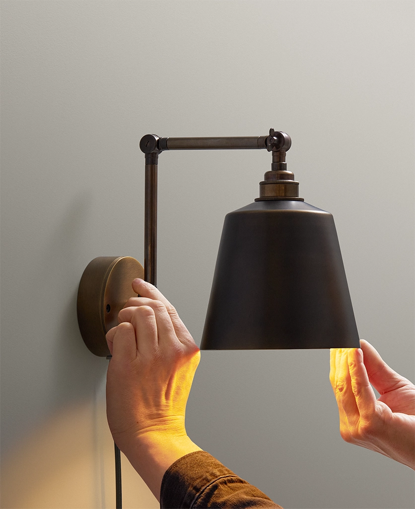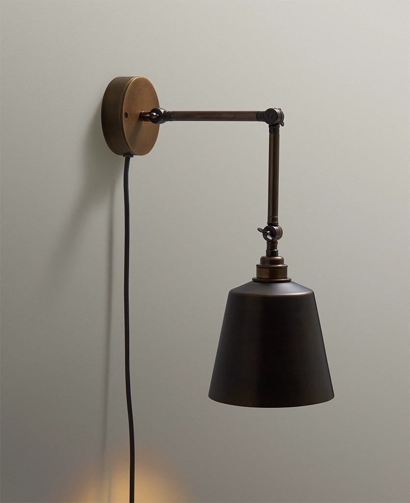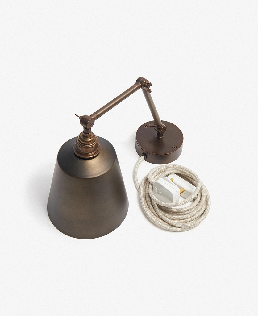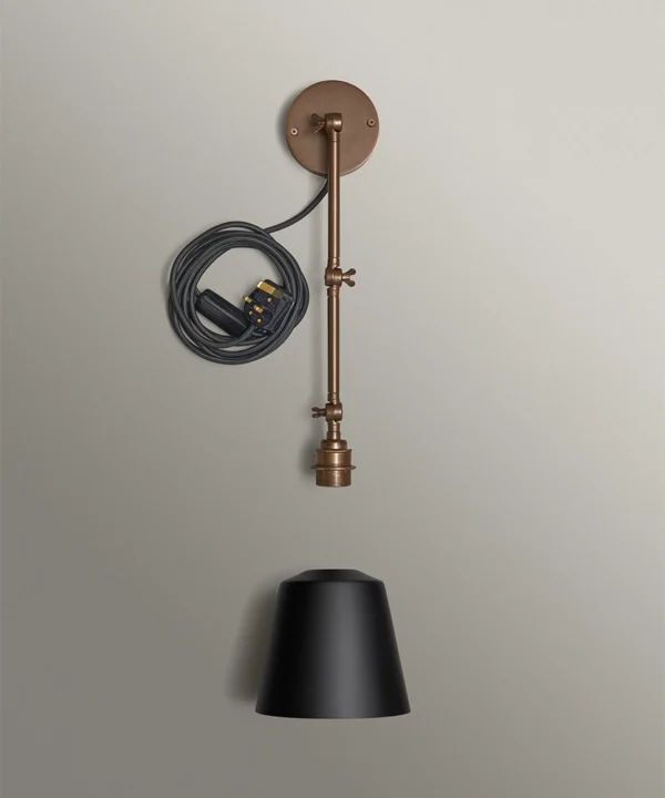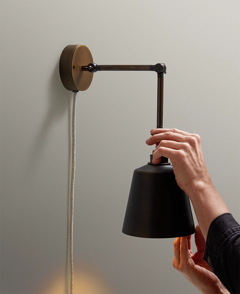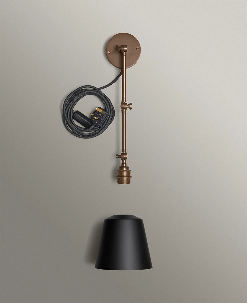 This is an ideal plug-in wall light for bedrooms, hallways or even dining areas where you want atmosphere without the disruption of installation. With its adjustable brass arm and choice of cable colour, it lets you tailor the look while adding warm, industrial notes to your space.