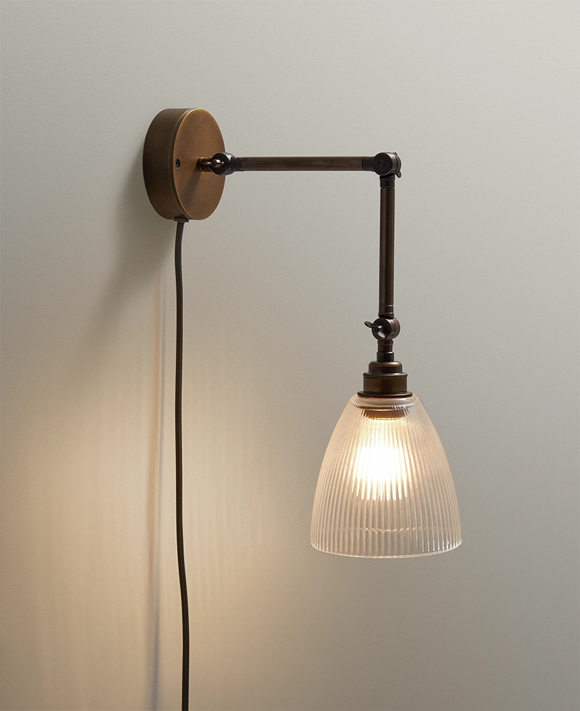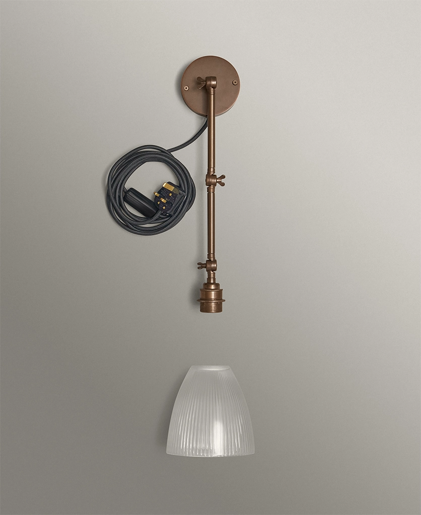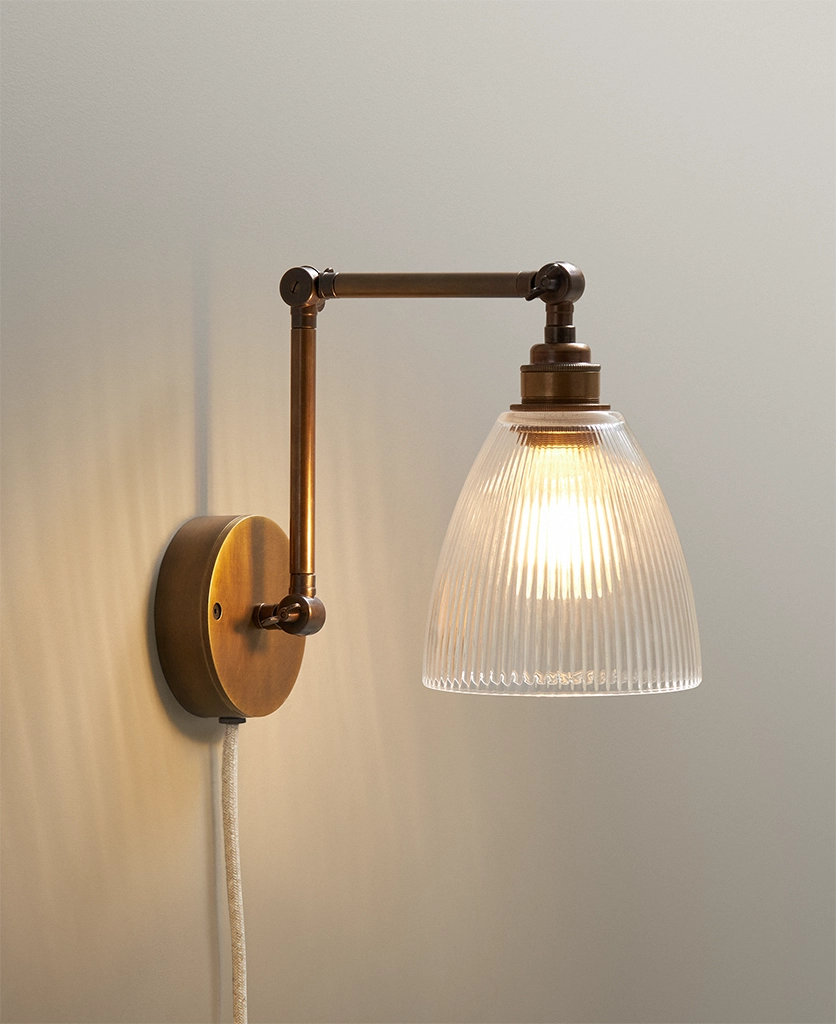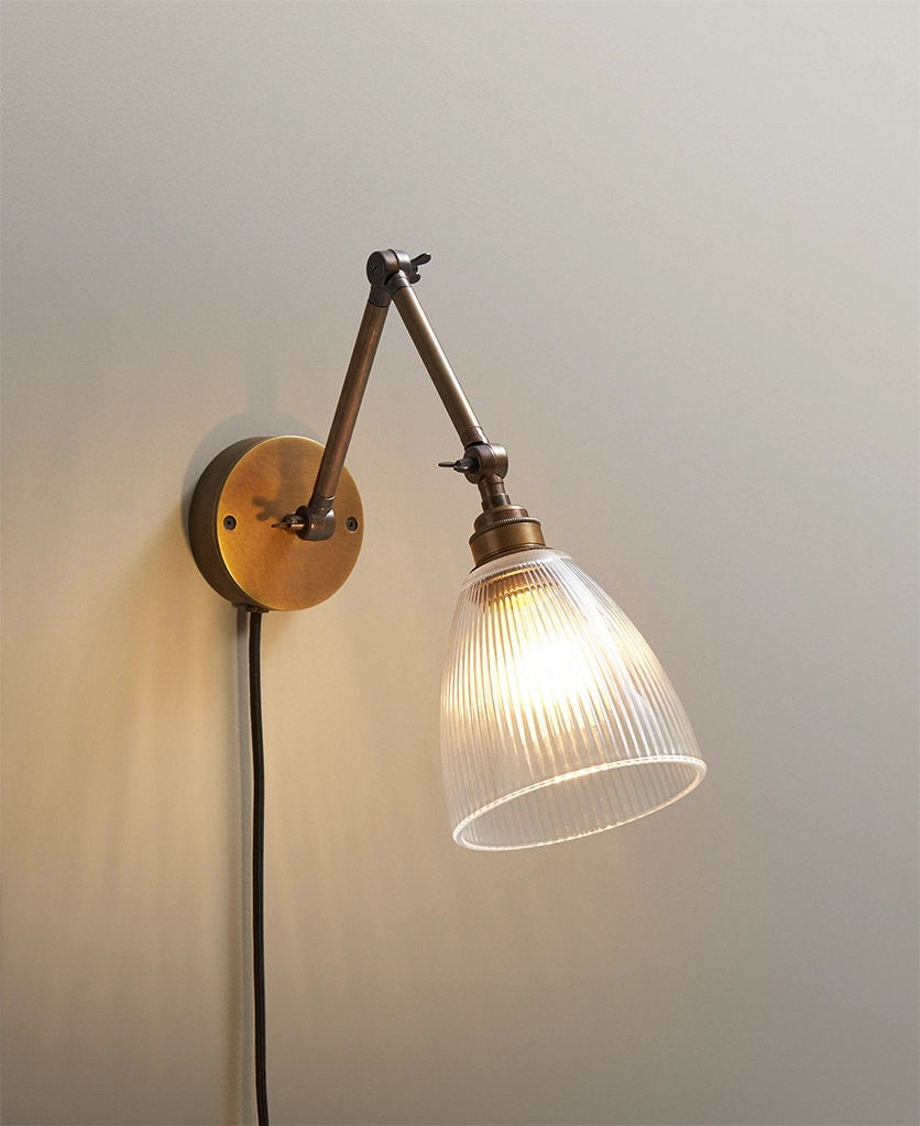 Switching the wall light on as evening settles in, you watch as the fluted glass shade sends soft, linear shadows across the wall — gentle, calming, quietly theatrical. The aged brass arm adds depth and detail, like a heritage piece discovered in a hidden corner of an old townhouse. Plugged in and effortlessly styled, it brings a sense of permanence without the need for drilling or rewiring.
