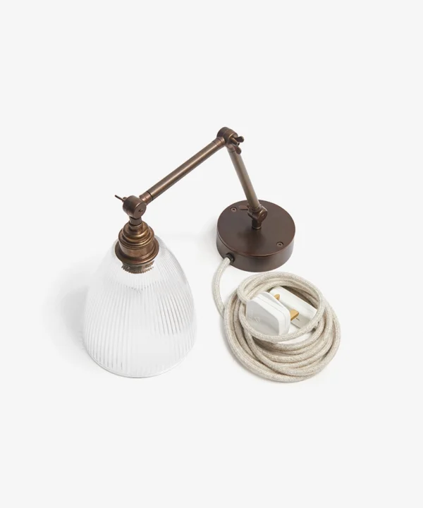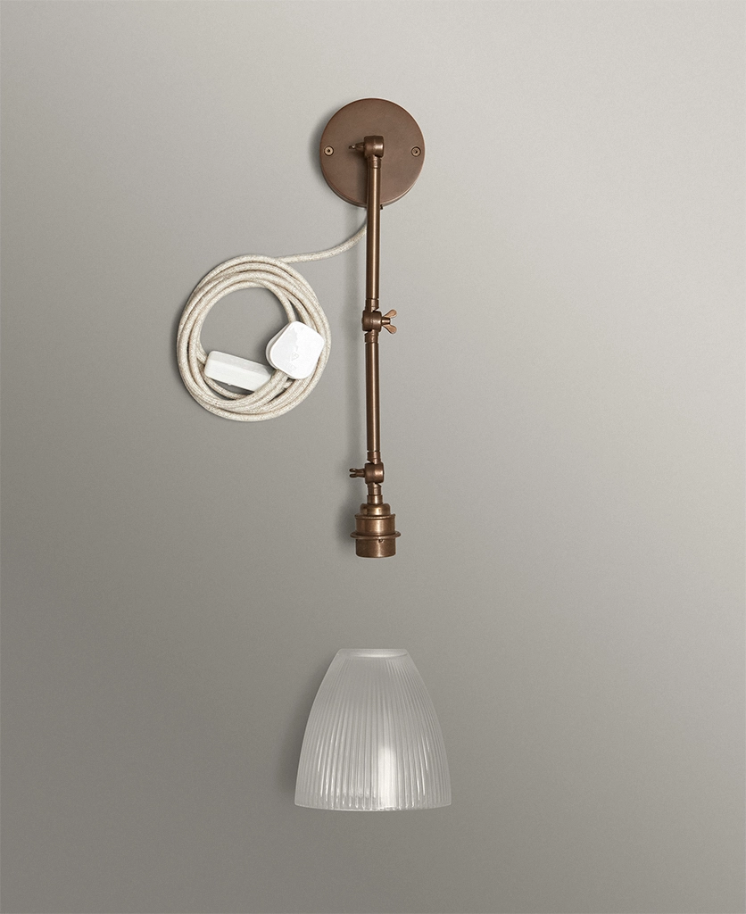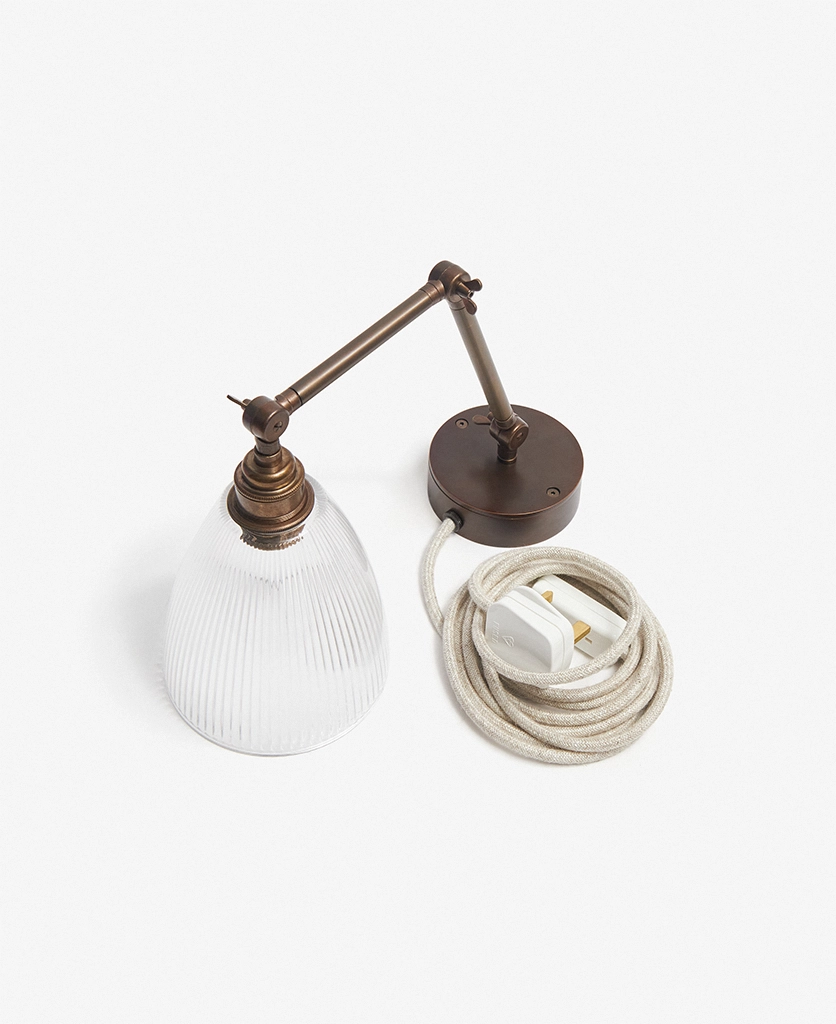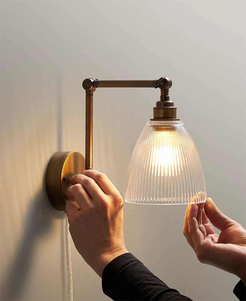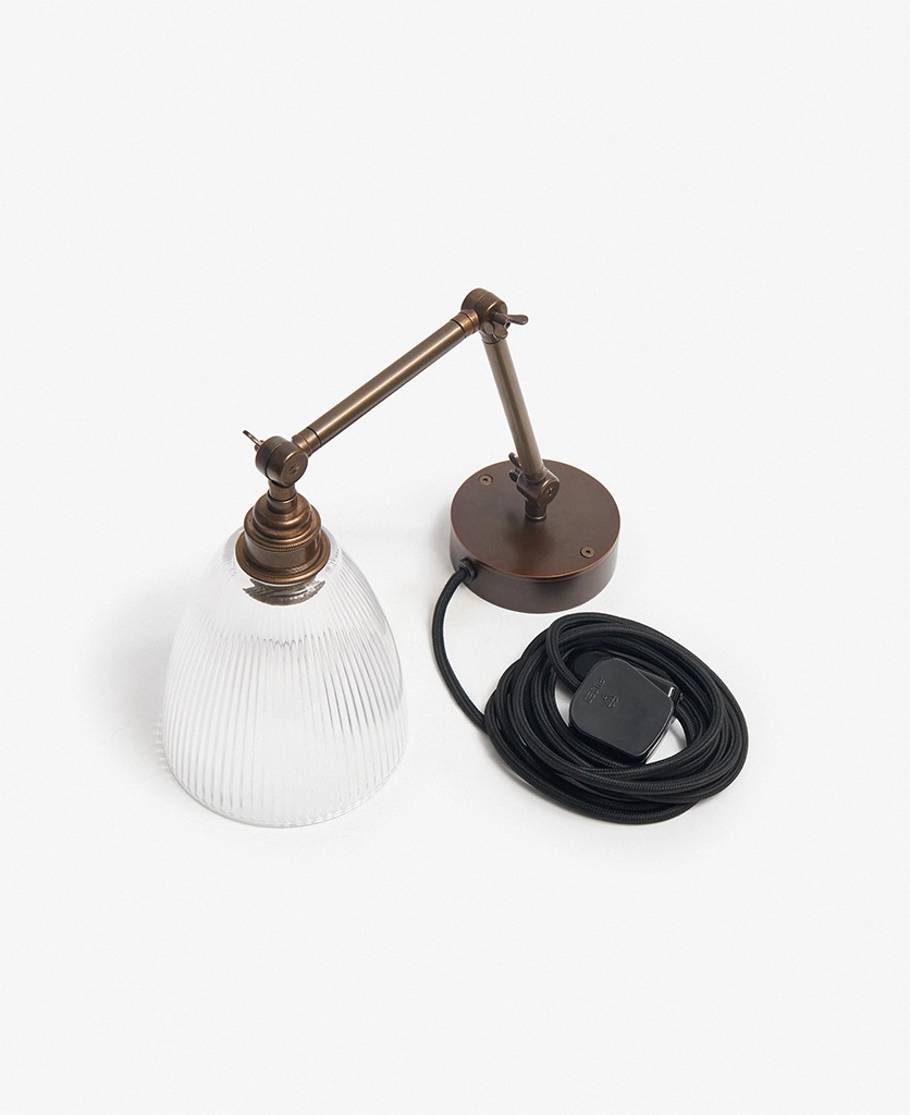 Switching the wall light on as evening settles in, you watch as the fluted glass shade sends soft, linear shadows across the wall — gentle, calming, quietly theatrical. The aged brass arm adds depth and detail, like a heritage piece discovered in a hidden corner of an old townhouse. Plugged in and effortlessly styled, it brings a sense of permanence without the need for drilling or rewiring.