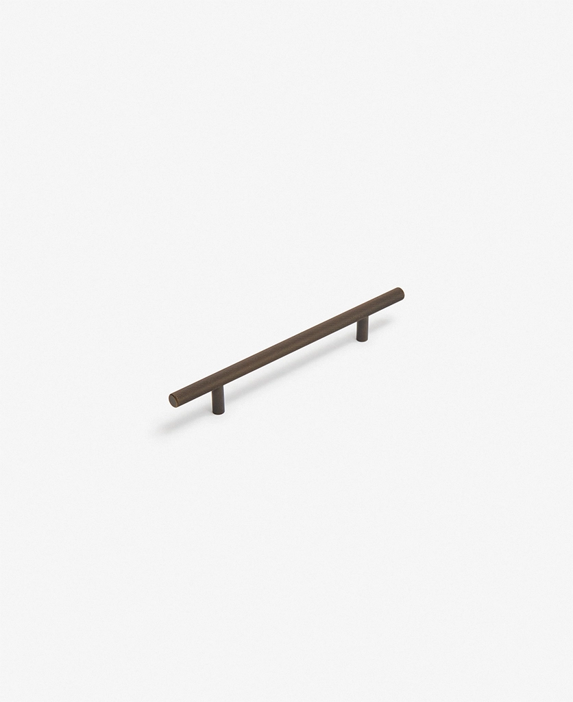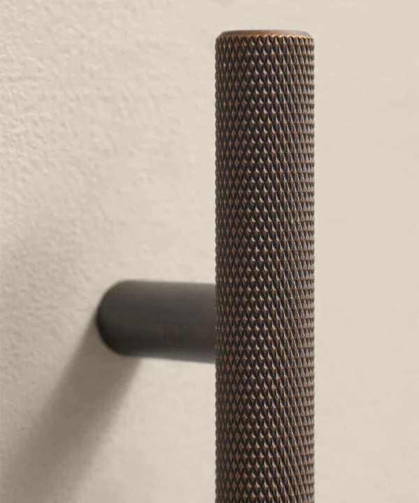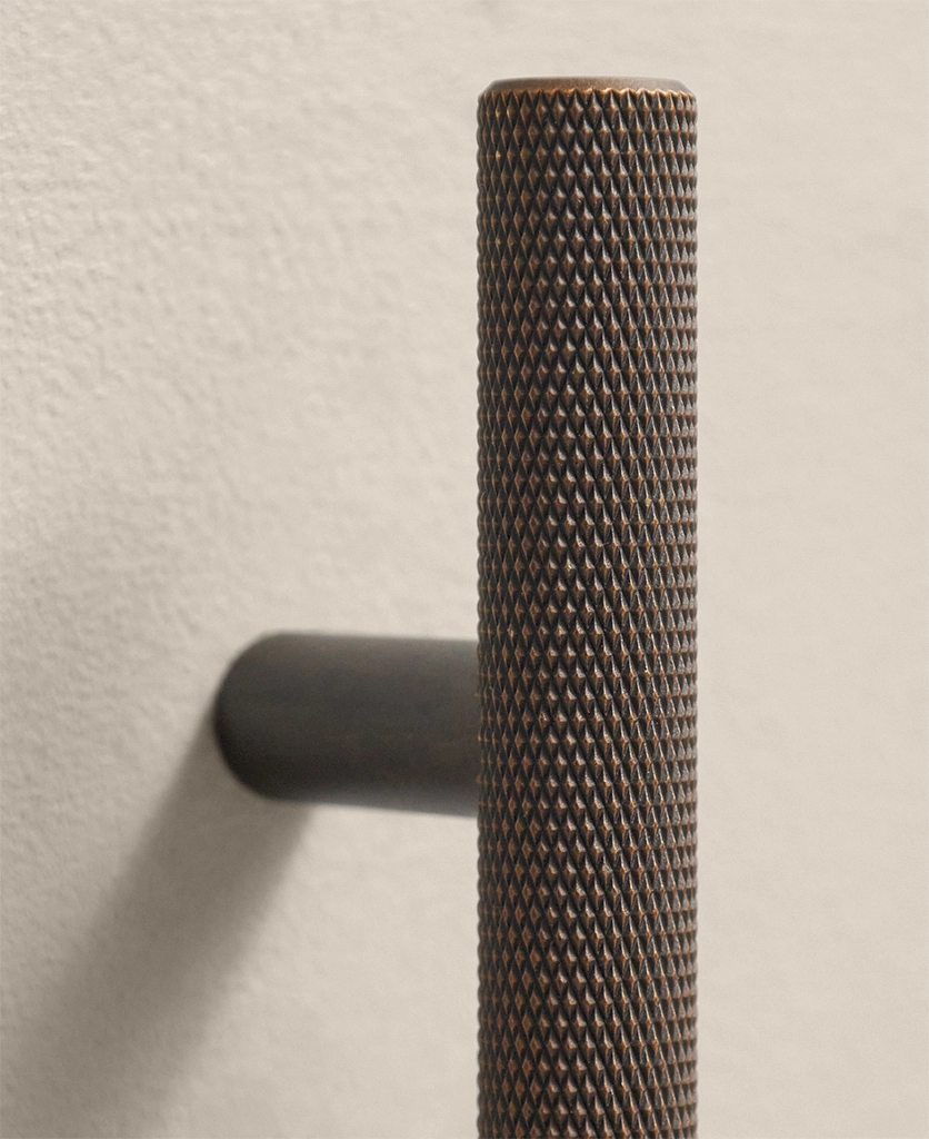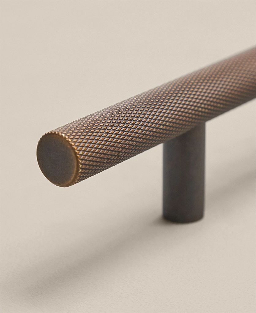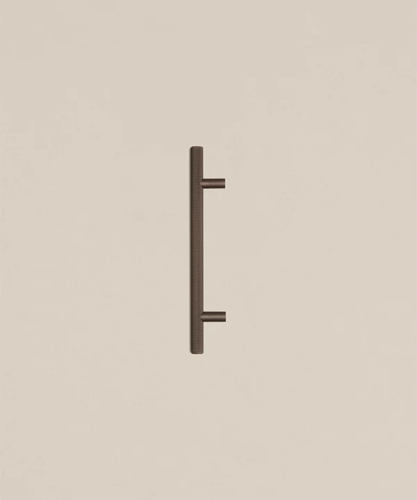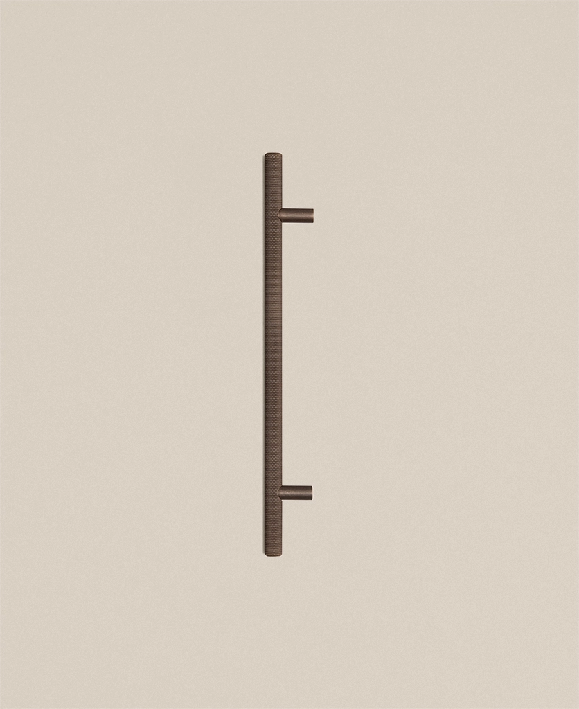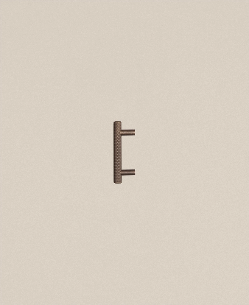 Running your fingers across the finely textured surface, you feel the satisfying grip of the Skyscraper handle — cool, weighty, and meticulously crafted. Its distinctive cross-hatched knurling catches the light in a soft shimmer, while the deep bronze tone grounds the design with quiet strength. Every touch reminds you of its purpose: to bring effortless sophistication to the everyday ritual of opening a drawer or cupboard.