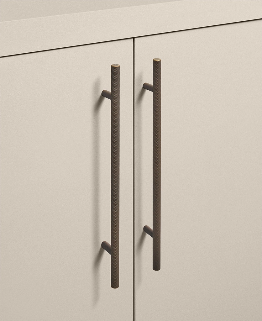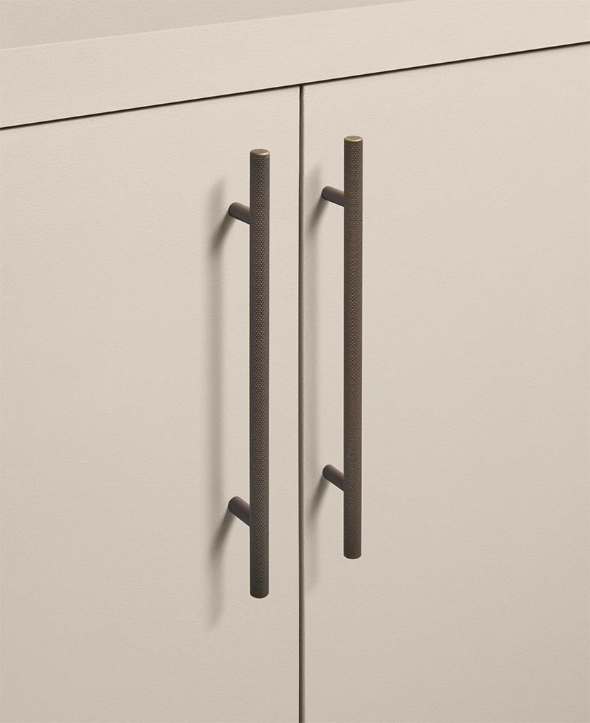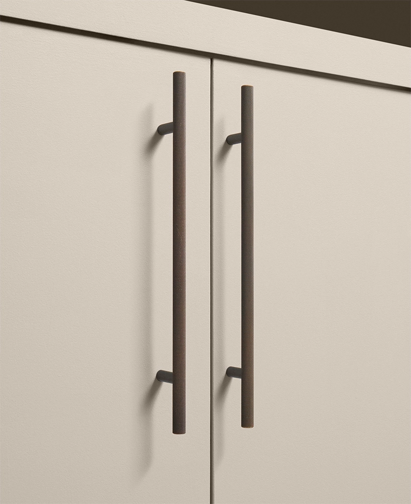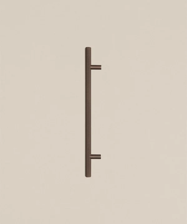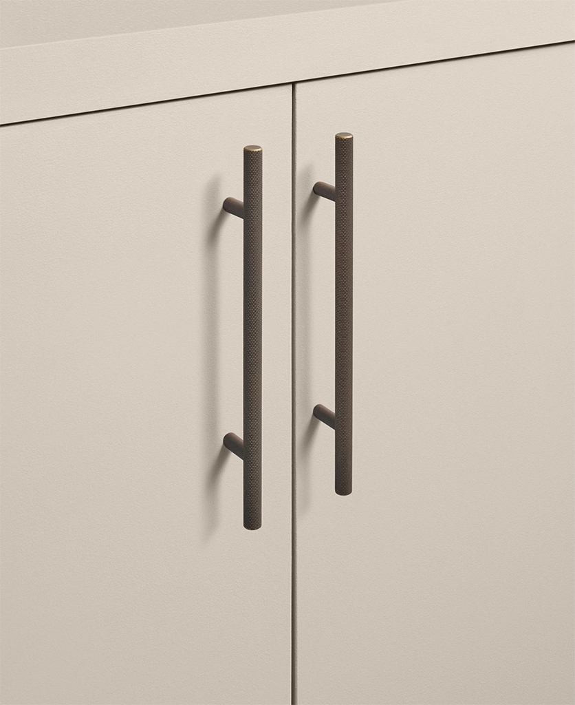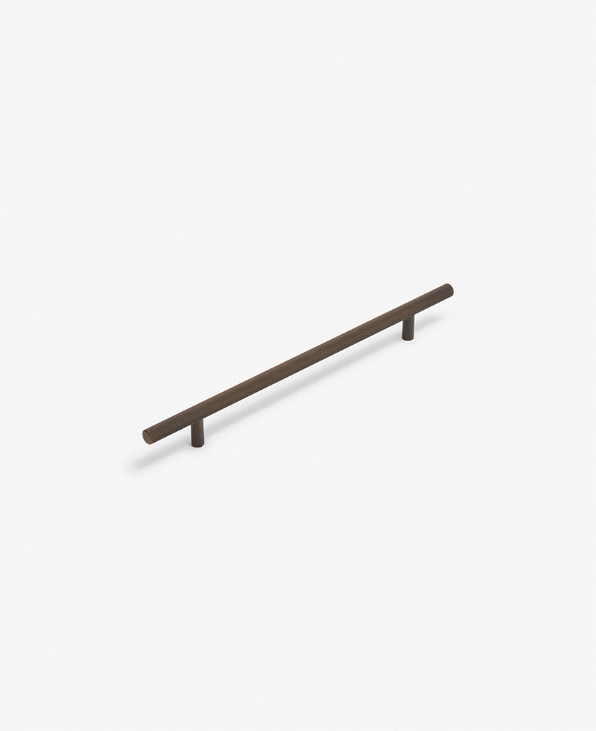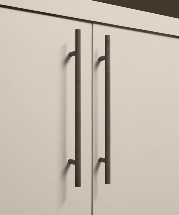 Running your fingers across the finely textured surface, you feel the satisfying grip of the Skyscraper handle — cool, weighty, and meticulously crafted. Its distinctive cross-hatched knurling catches the light in a soft shimmer, while the deep bronze tone grounds the design with quiet strength. Every touch reminds you of its purpose: to bring effortless sophistication to the everyday ritual of opening a drawer or cupboard.