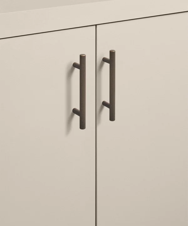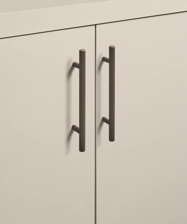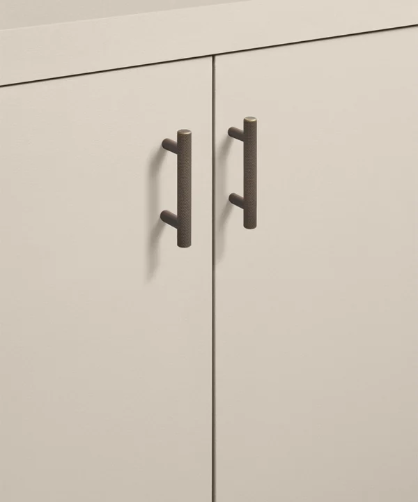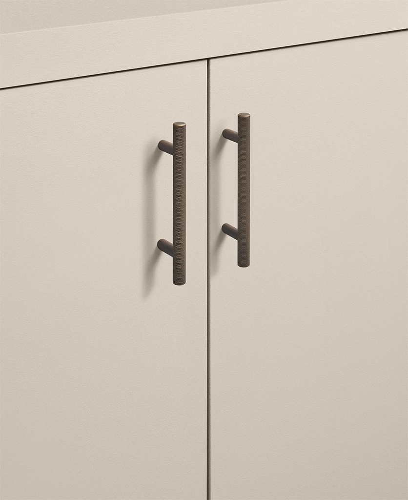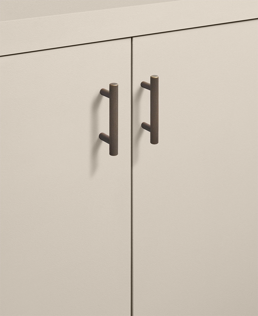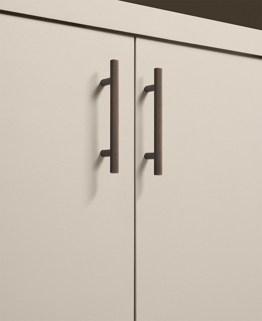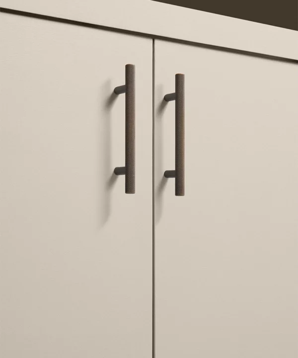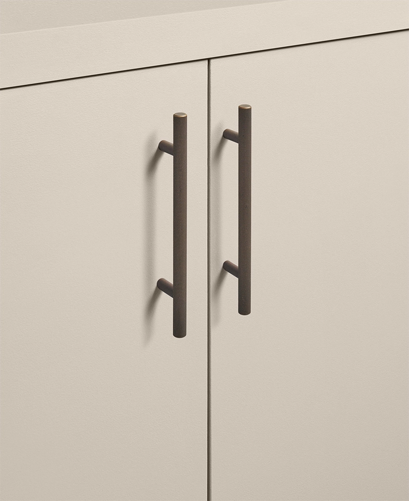 Running your fingers across the finely textured surface, you feel the satisfying grip of the Skyscraper handle — cool, weighty, and meticulously crafted. Its distinctive cross-hatched knurling catches the light in a soft shimmer, while the deep bronze tone grounds the design with quiet strength. Every touch reminds you of its purpose: to bring effortless sophistication to the everyday ritual of opening a drawer or cupboard.