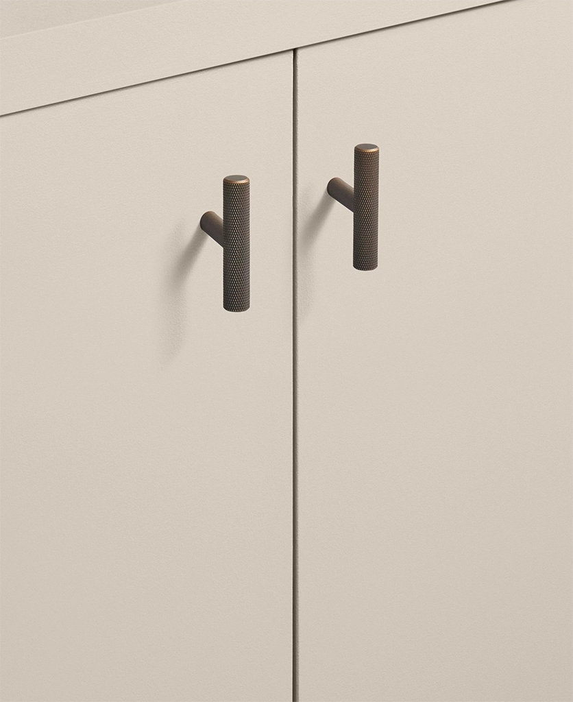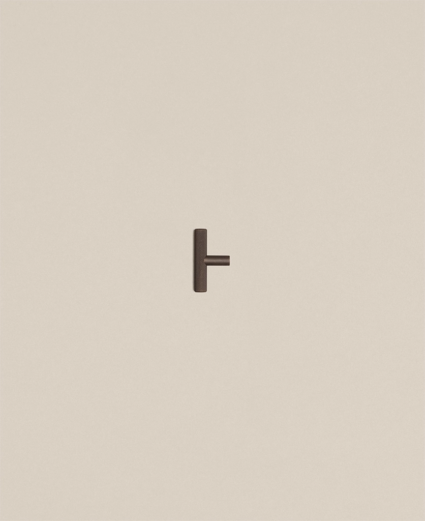 Gripping the finely knurled bar, you sense the precision in every detail — the uniform texture, the cool bronze tone, the solid weight in your hand. Small yet powerful, the Skyscraper t-bar makes an immediate impression. It’s a design that feels engineered rather than merely made, transforming even the smallest cupboard into a considered design feature.