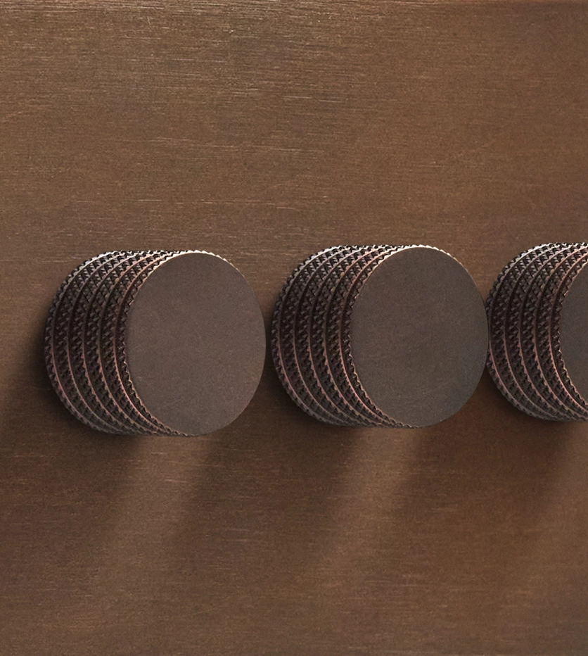 The design detail The brushed bronze finish has a deeper metallic quality that brings richness without overt shine. Its brushed surface adds depth and subtle texture, creating a warm, characterful finish that feels more grounded and substantial than lighter metallics. Combined with the clean proportions of the plate and matching dimmer knobs, it turns an everyday fitting into a detail that feels quietly architectural and beautifully resolved.