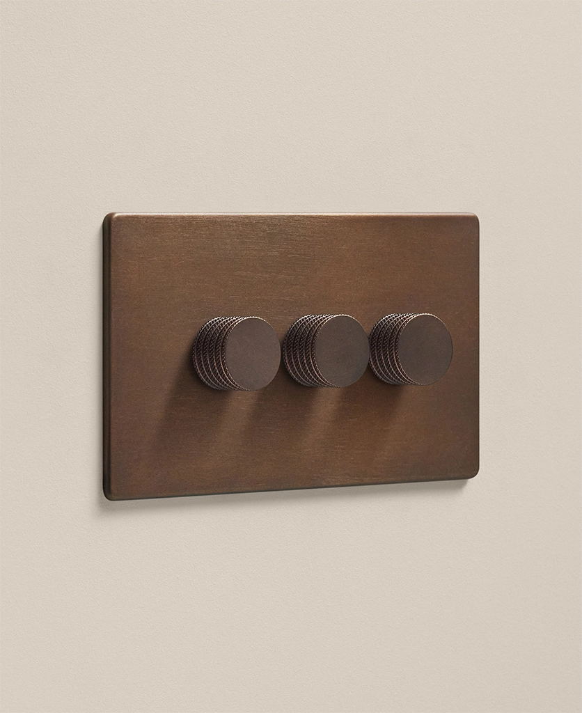 The feeling This is lighting control with weight and character. The triple dimmer format keeps the wall cleaner and more composed, while the bronze finish introduces a richer metallic note that feels warm, grounded and easy to live with. It has a more substantial feel than brighter metallics, giving the room depth without ever tipping into overt shine.