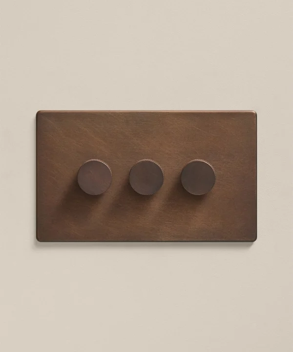 A Bronze Triple Dimmer Switch is designed for spaces where lighting needs flexibility, but the finish still needs to feel intentional and design-led. With control over three separate lighting circuits from one plate, it helps simplify the wall while giving the overall scheme a more resolved feel. The brushed bronze finish brings a deeper metallic warmth than lighter finishes, adding richness, depth and a more grounded presence that feels quietly substantial rather than decorative.