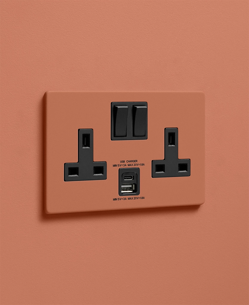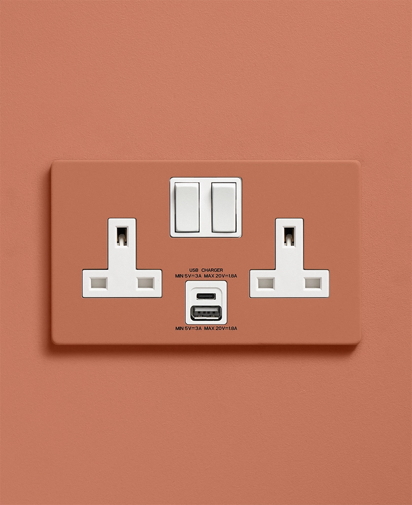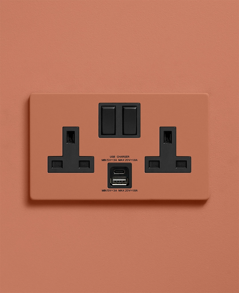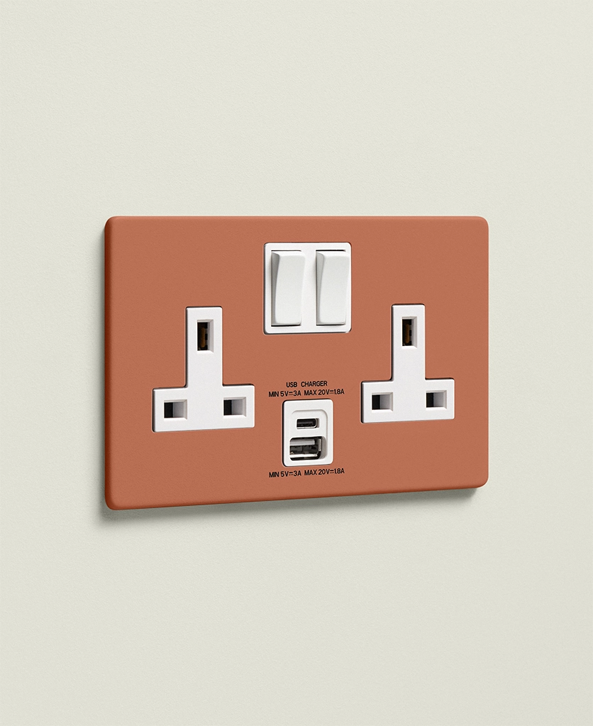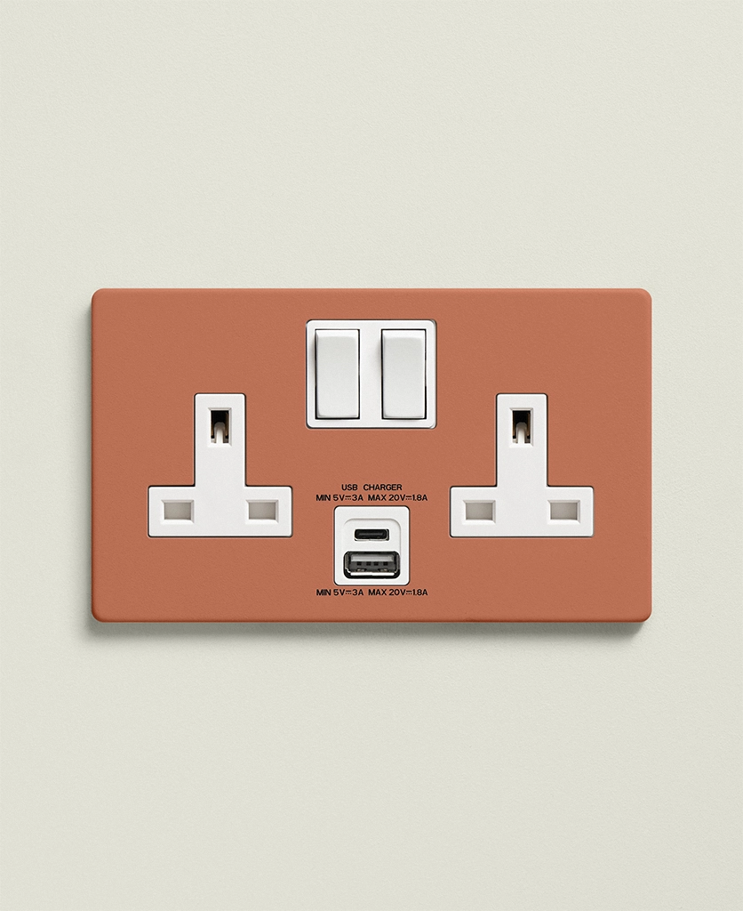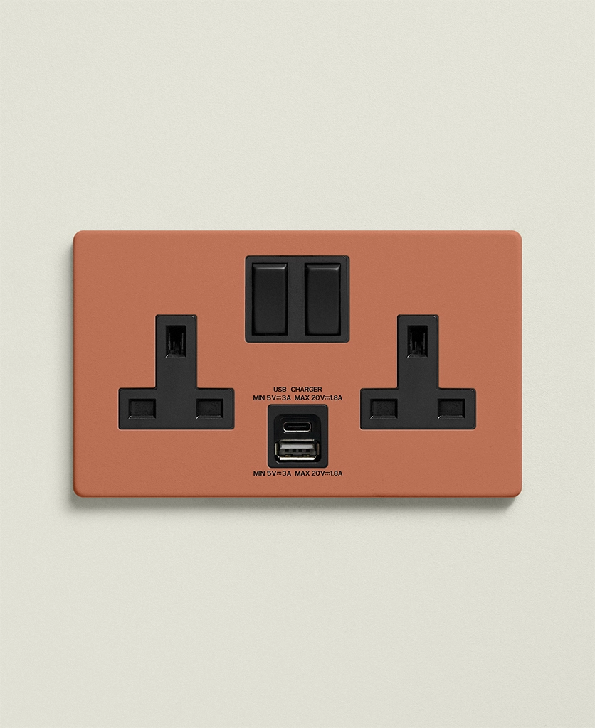 Ideal for kitchens, home offices, and living spaces, this double socket combines technology and style. Its earthy finish sits comfortably against wood, stone and neutral wall colours, offering a subtle but striking detail.