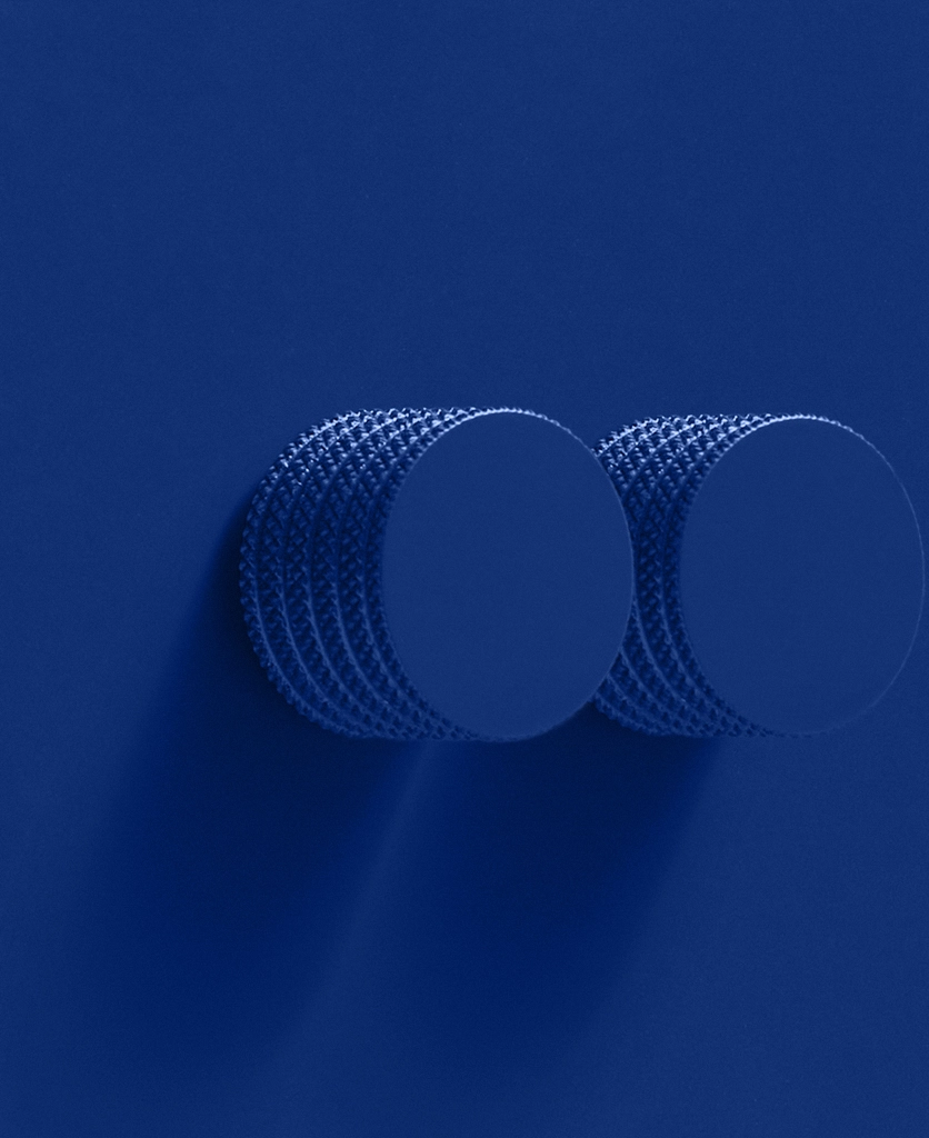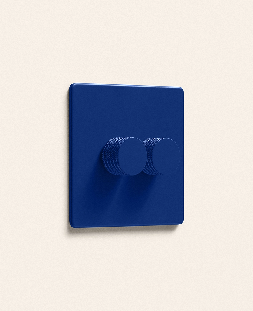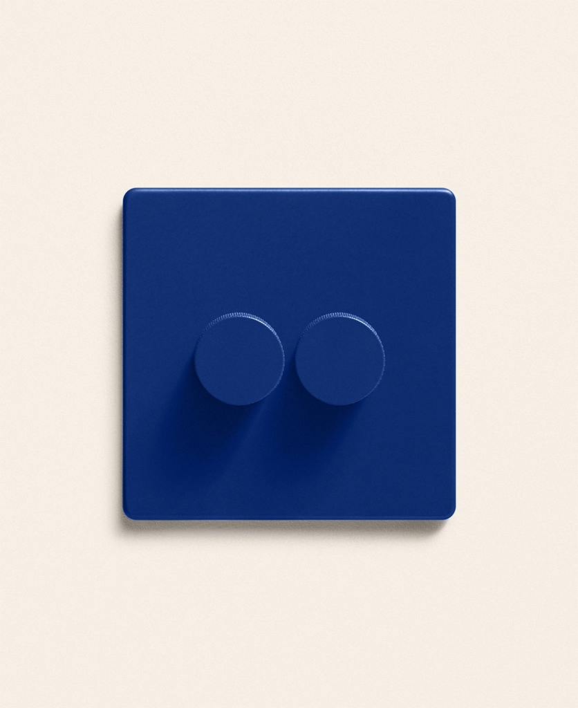 Turning one dial for brightness and the other for mood, you build the scene slowly. The pendant light dip, the wall lights lift— and the room responds. All the while, the cobalt switch anchors the space, its intense, matte blue tone delivering a dose of pigment that’s striking but not showy. Inspired by traditional Moroccan blues, it adds presence without fuss.