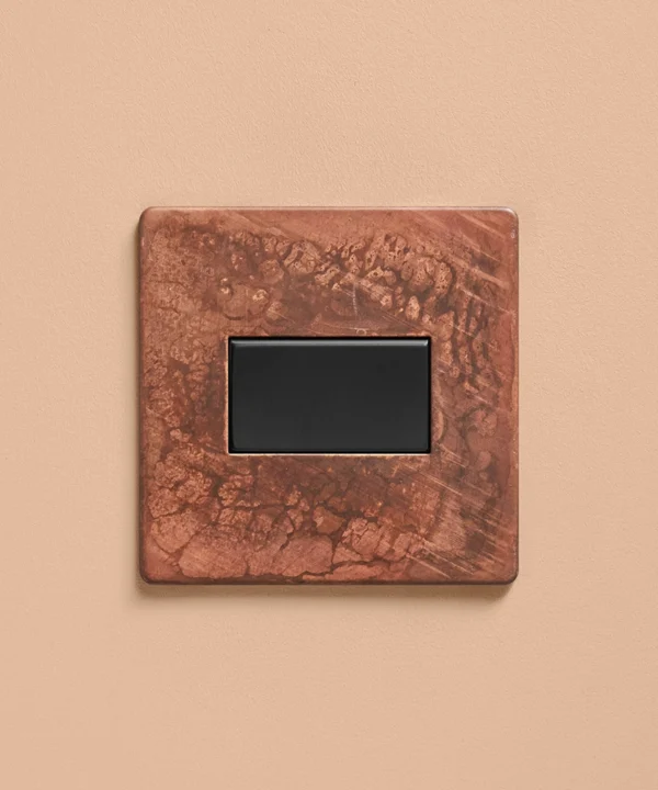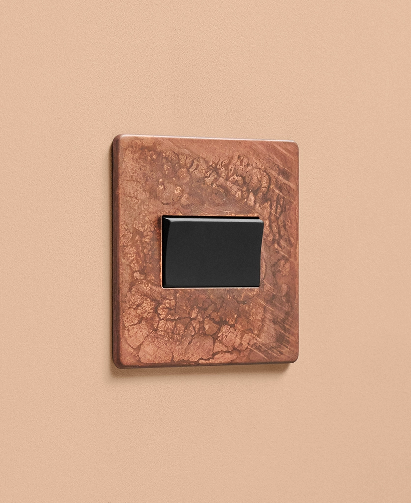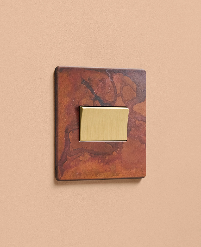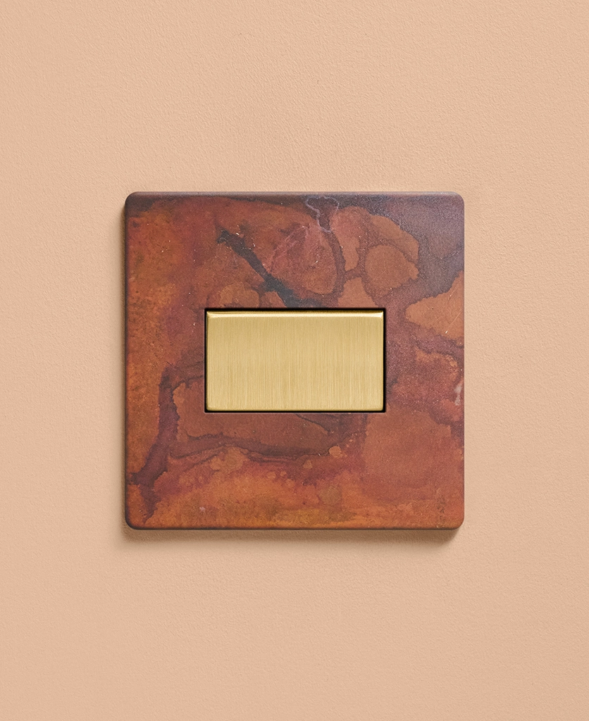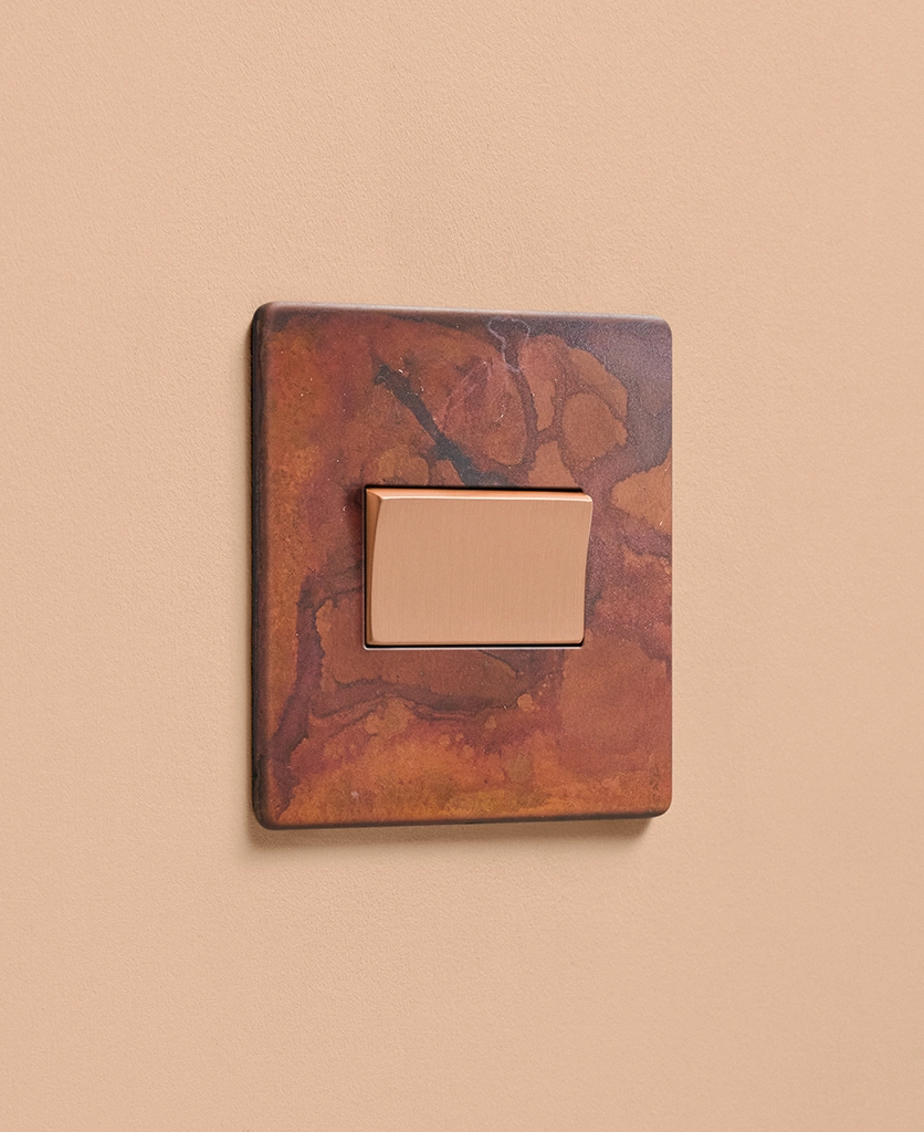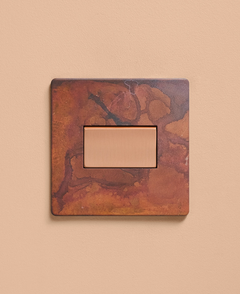 Oxide copper is a finish that adds a certain je ne sais quoi to your interiors. With a matt copper plate and unique hues of grey and blue swirling across the surface, this stunning oxide copper switch really packs a punch.