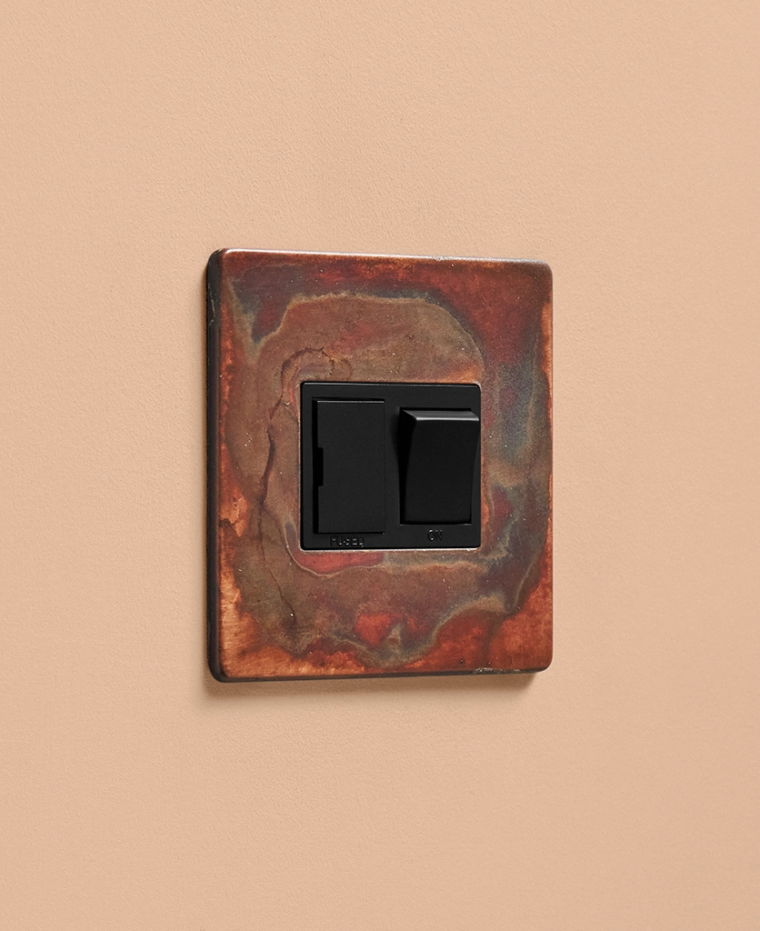 How fabulous is this oxide copper fused spur switch? Finished in a ruggedly weathered copper this switch is perfect for showing off alongside our stunning range of copper switches, sockets and dimmers. That is why we designed it after all...We created this exclusive range of designer oxide copper treats to eradicate those vile white plastic switches once and for all.