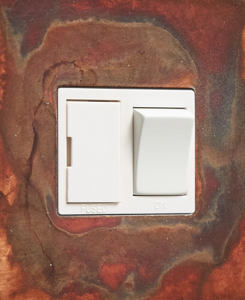 Our copper fused spur switch is certainly a striking switch. Consisting of a distressed copper plate with a choice of black or white switch detail, this gorgeous and often overlooked switch has been designed here at Dowsing and Reynolds to coordinate with our exclusive copper range. Oxide copper is truly industrial and this individual switch will complement an industrial kitchen beautifully.