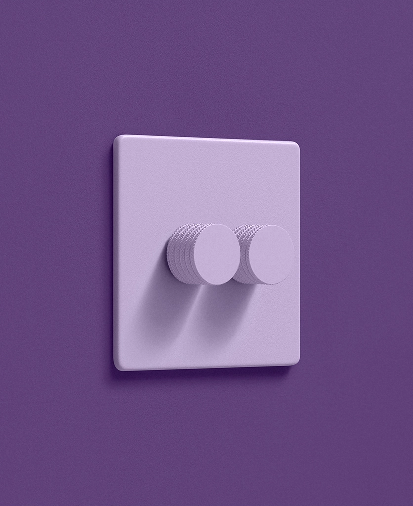The switch features two knurled rotary controls and a backplate in our signature matt digital‑lavender finish. It’s compatible with LED bulbs and trailing edge dimming. Designed in‑house by Dowsing & Reynolds for indoor use, it offers precise control wrapped in calming colour.