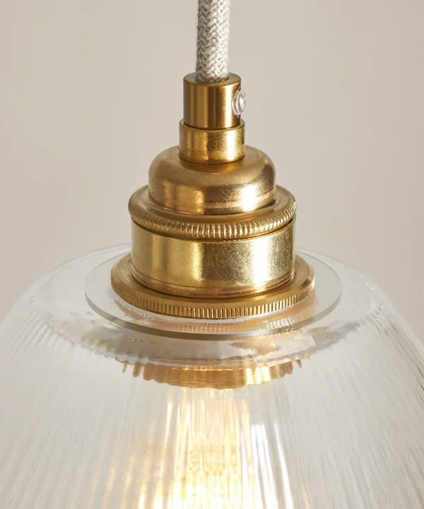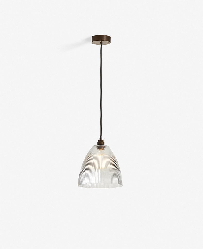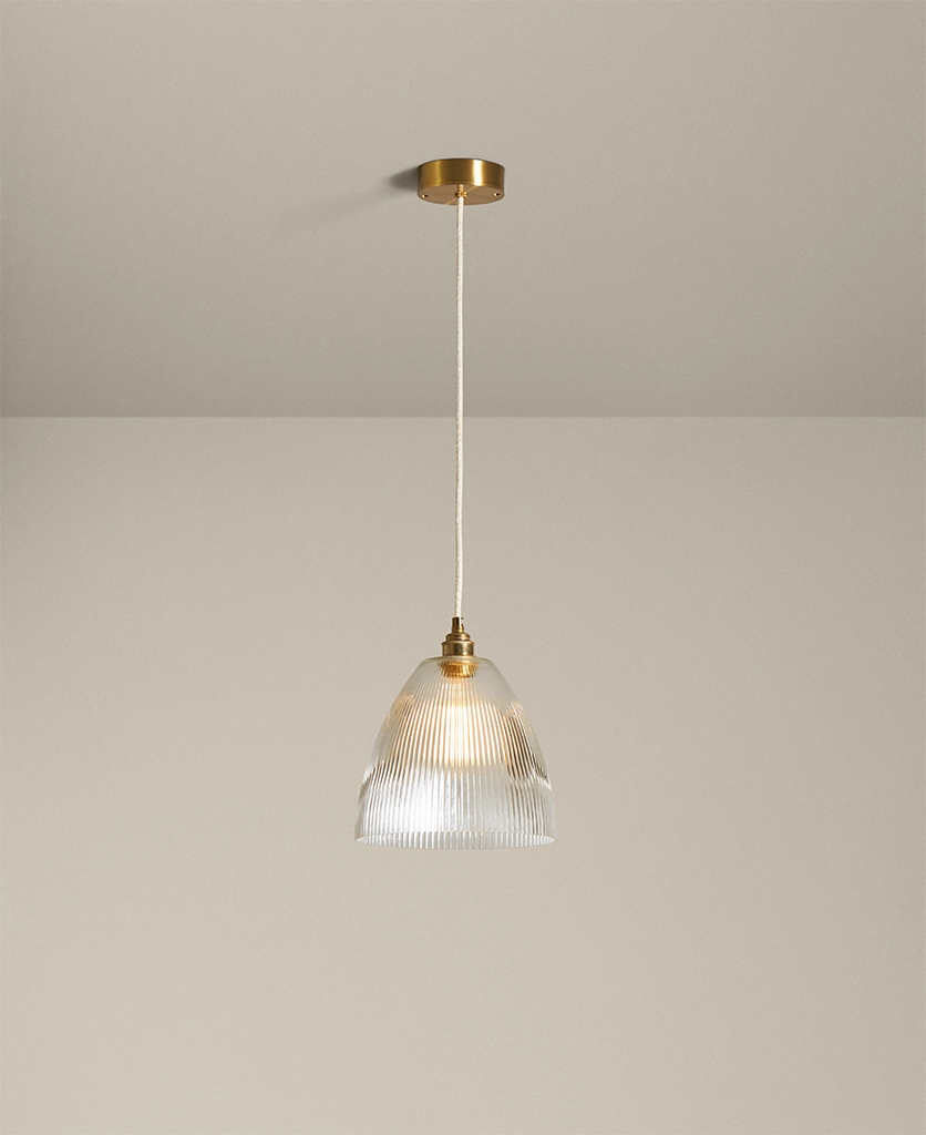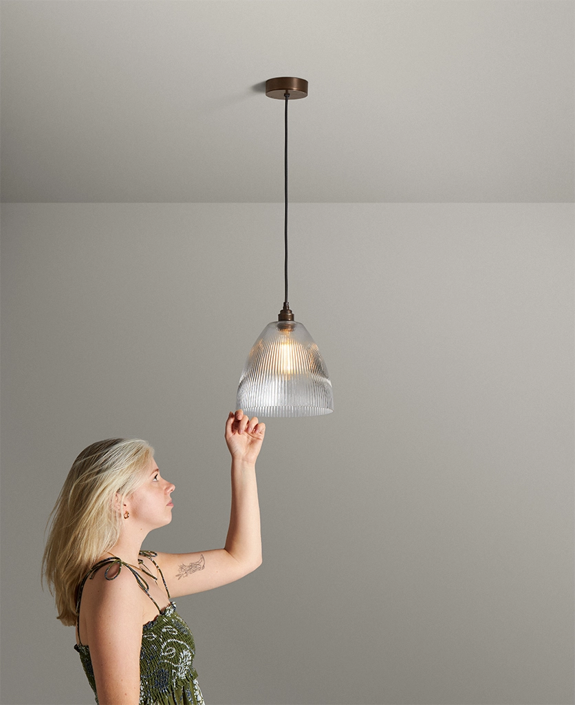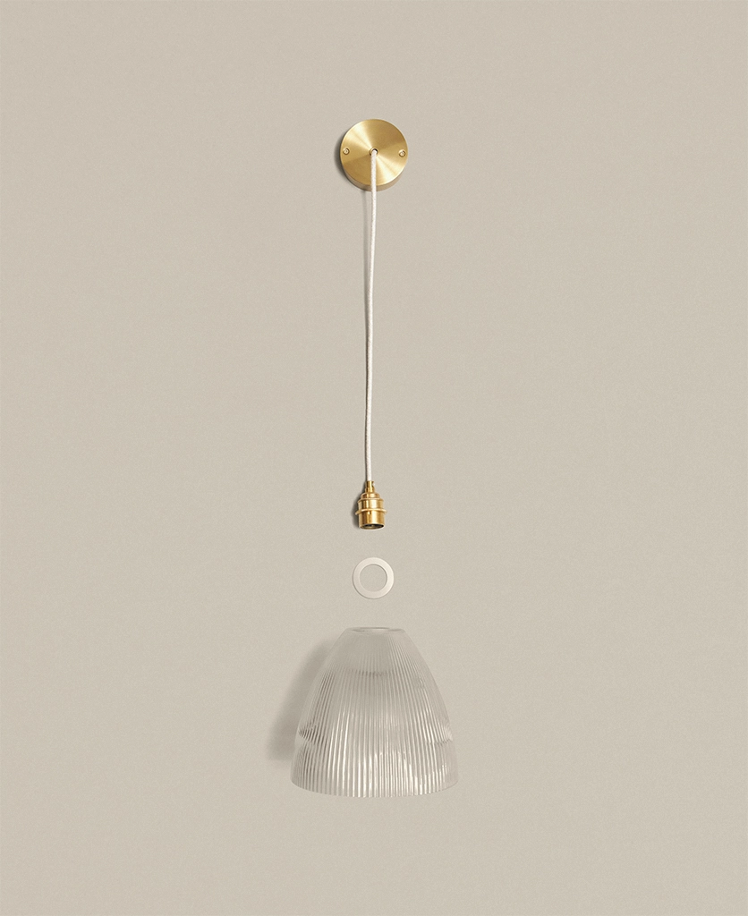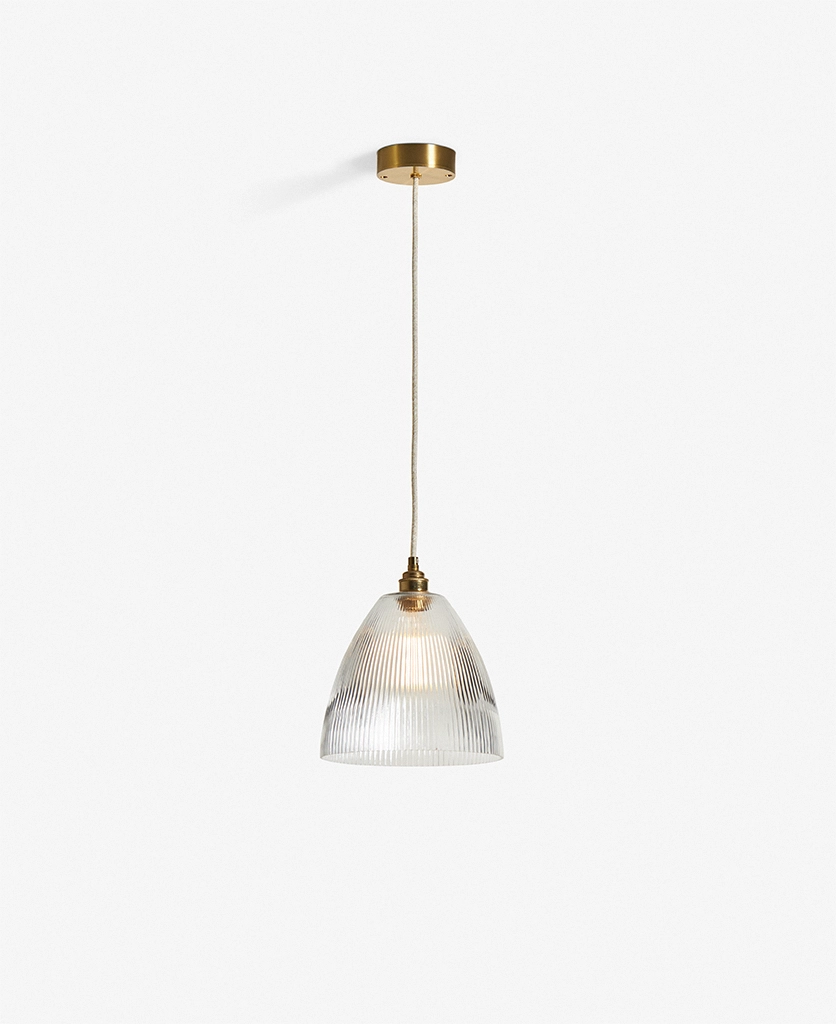Blending vintage detailing with a modern sensibility, Evelyn is stunning in a row above a dining table or hung low in a hallway to welcome guests with a gentle glow. The vertical ribbing in the fluted cone shade catches the light beautifully, adding a sense of texture and movement. Pair with antique brass and linen cable for a timeless feel, or go bold with black hardware and cable for contrast.