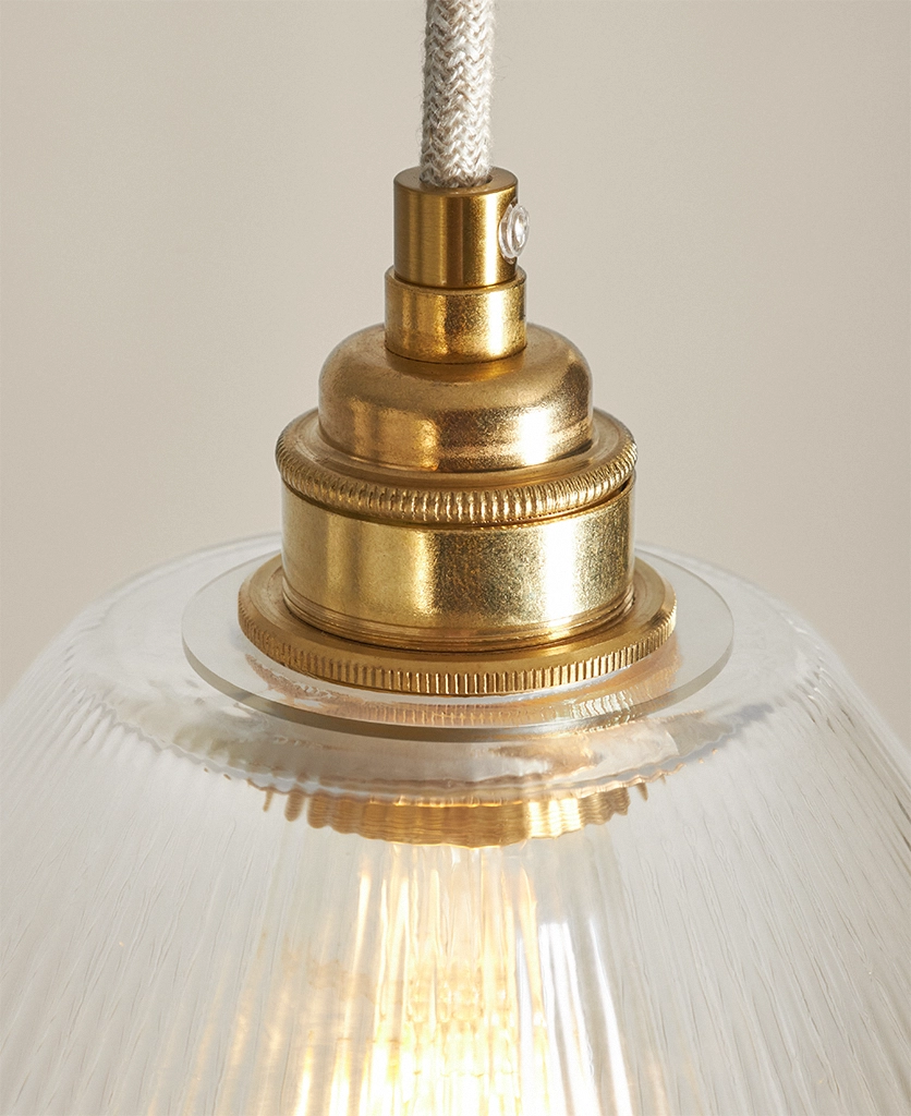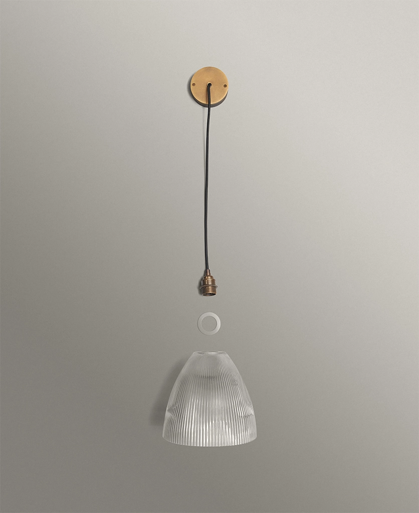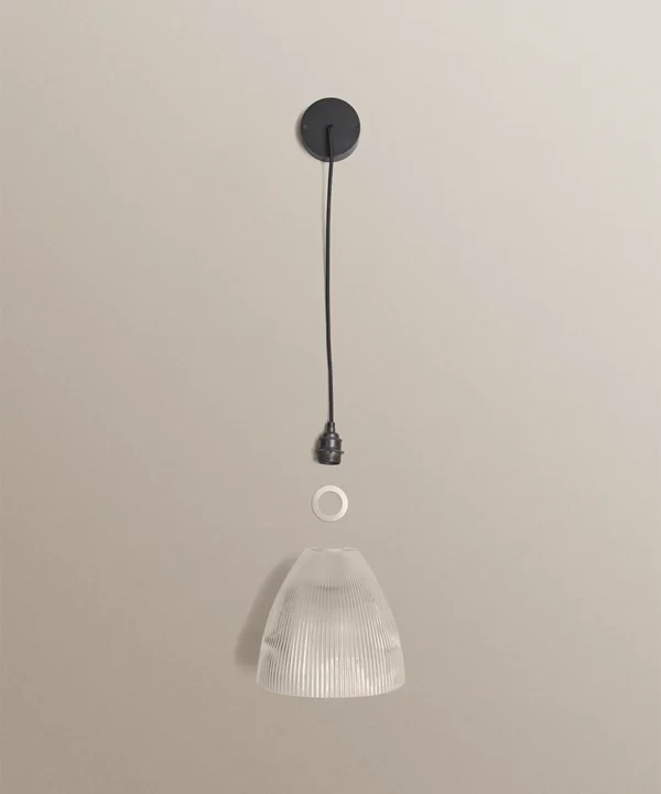 Hand-assembled to order, Evelyn features a fluted cone glass shade with vintage ribbing, offered with your choice of black, antique brass or gold fixture and black or natural linen fabric cable. For indoor use only.