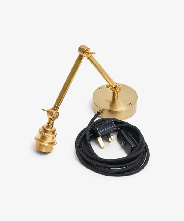 - Includes: rose, steel arm, bulb holder, chosen fabric cable, inline switch, plug, insulated connector box, and integrated earth wire.