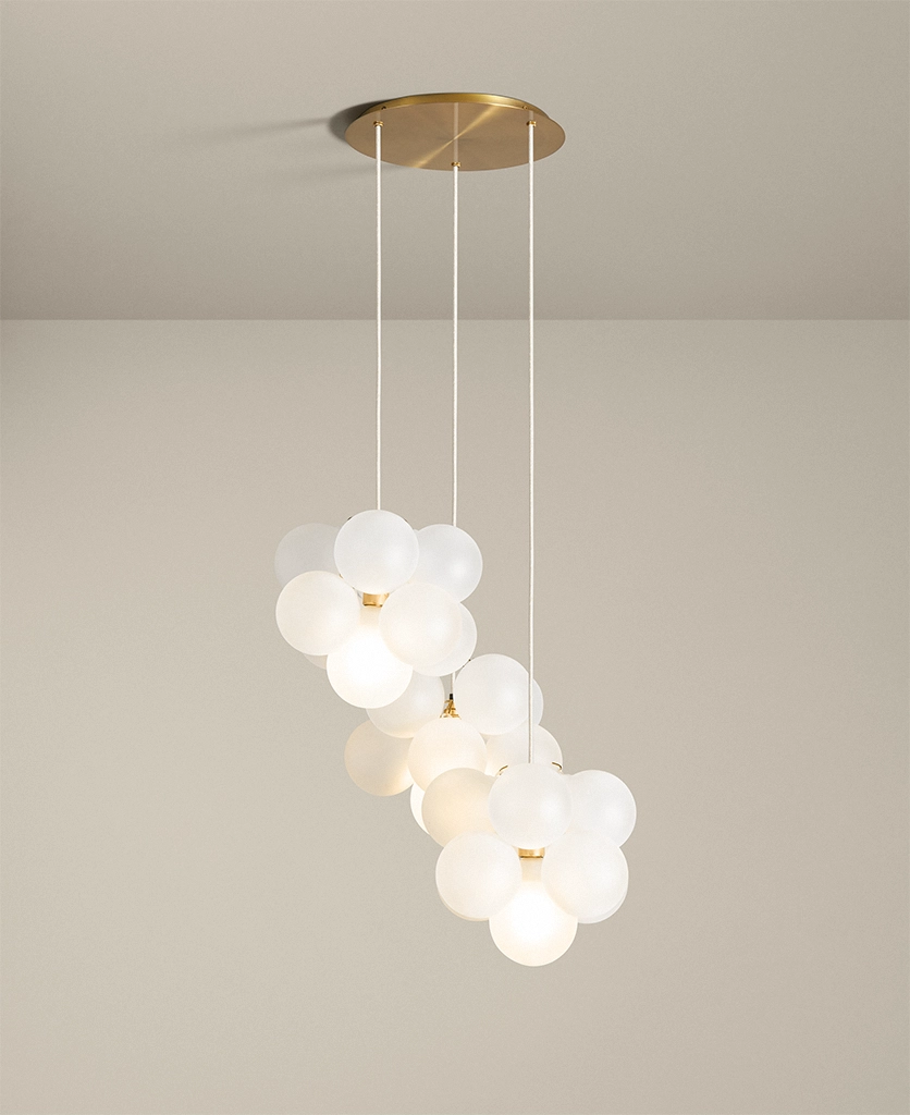 Standing at the foot of your staircase, you look up into a soft constellation of glowing spheres. The Gold Frosted Bubble Cascade Light drifts overhead, its cluster of opaque glass orbs floating weightlessly in space. Their soft diffusion of light feels soothing — a modern expression of luxury that catches the eye without overwhelming the room.