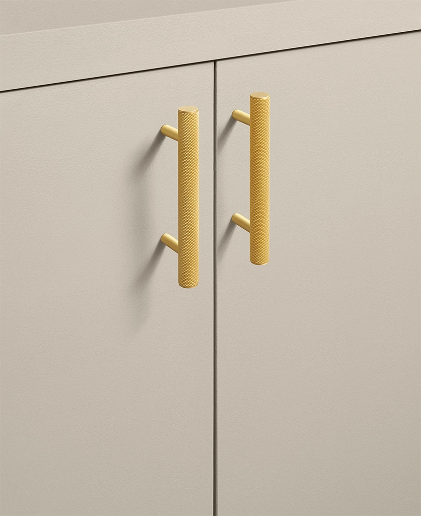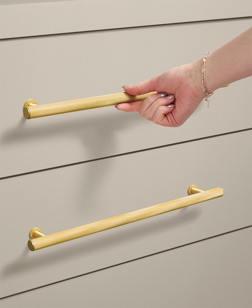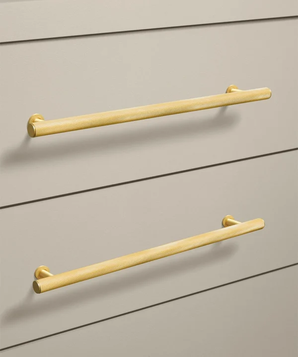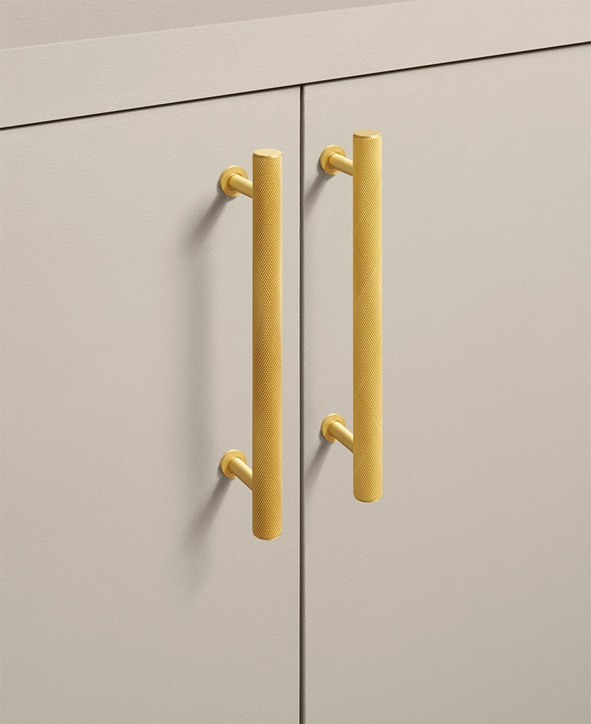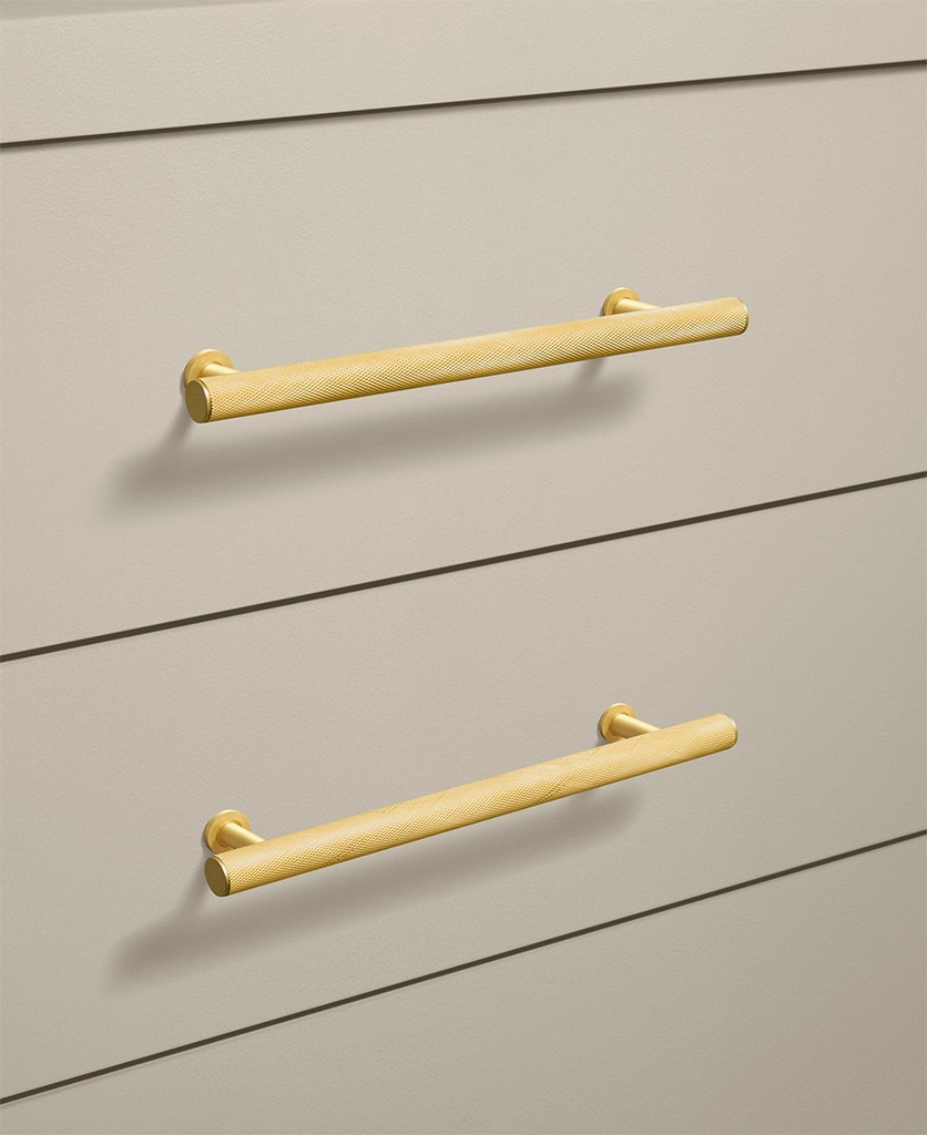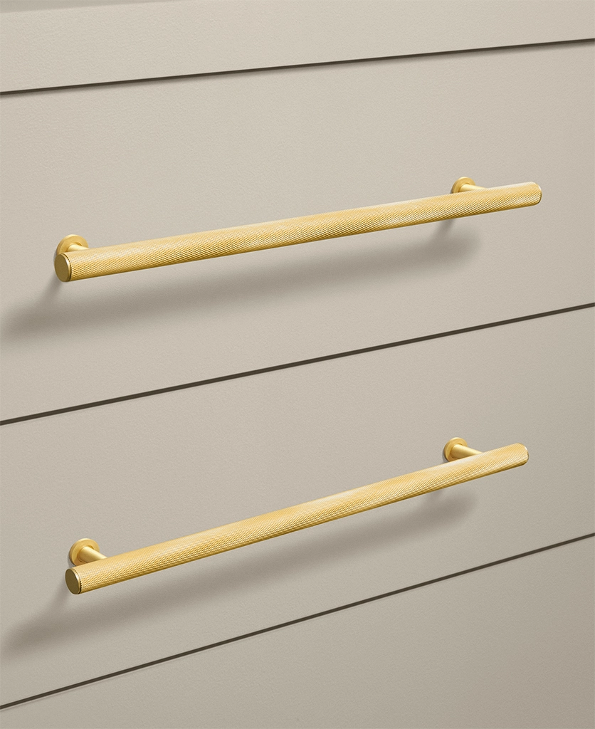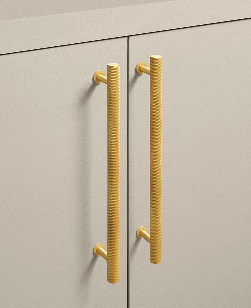 Closing a drawer, you feel the reassuring grip of finely knurled metal beneath your hand. The pattern catches the light softly, giving the gold finish a warmth that feels considered rather than showy. It’s a small interaction, but one that quietly elevates the everyday.