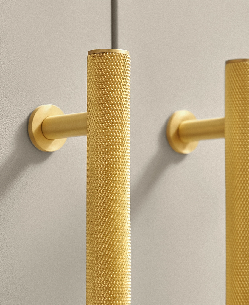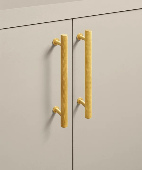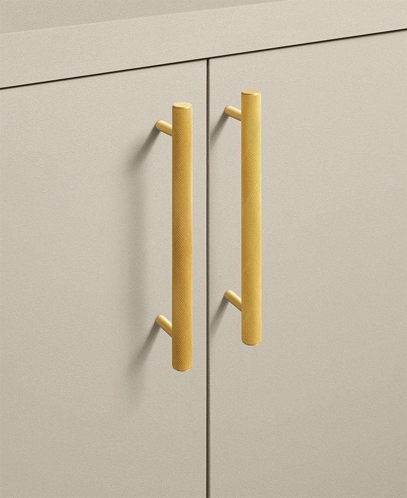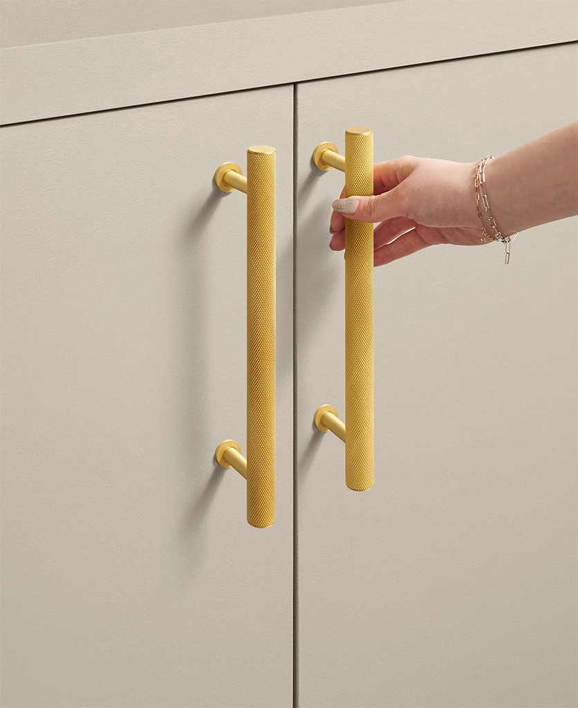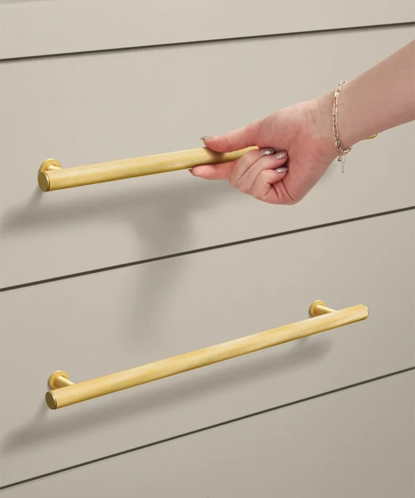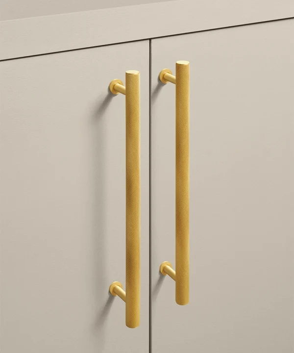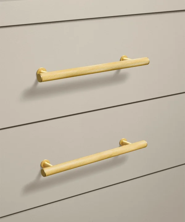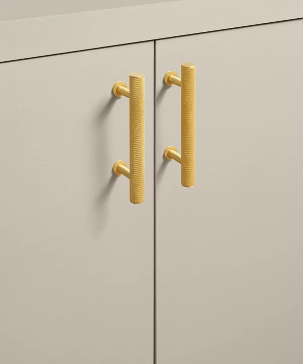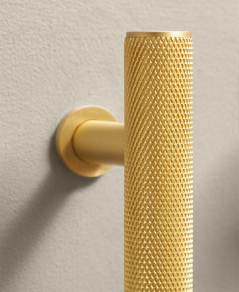 Closing a drawer, you feel the reassuring grip of finely knurled metal beneath your hand. The pattern catches the light softly, giving the gold finish a warmth that feels considered rather than showy. It’s a small interaction, but one that quietly elevates the everyday.
